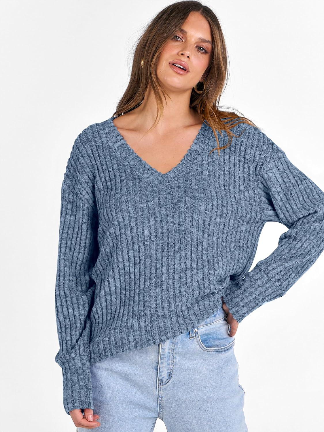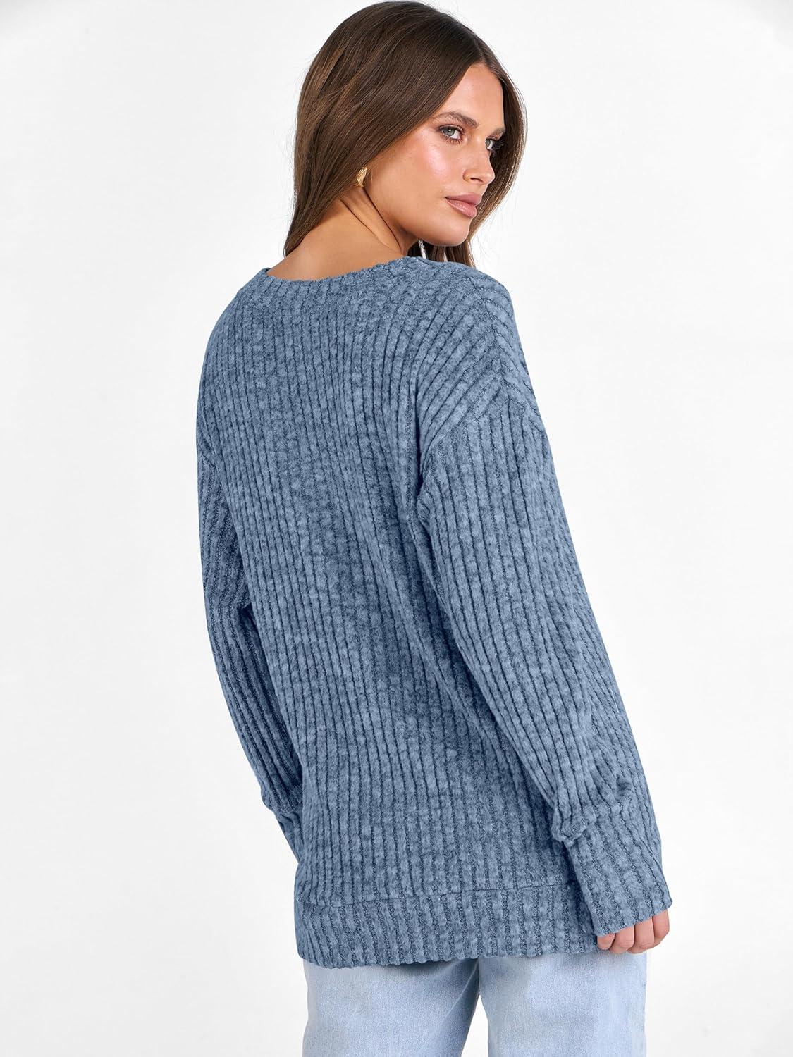 ANRABESS Long Sleeve Shirts for Women V Neck Casual Fall Tops Loose Fit Lightweight Sweaters Tunic Fashion 2025 Clothes(Dark Blue)