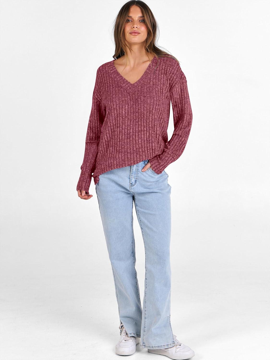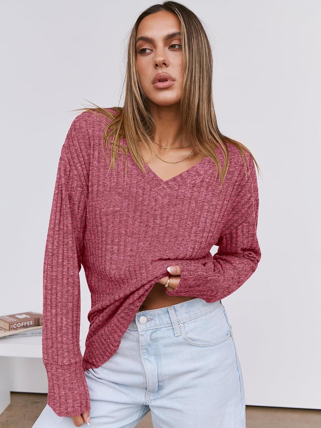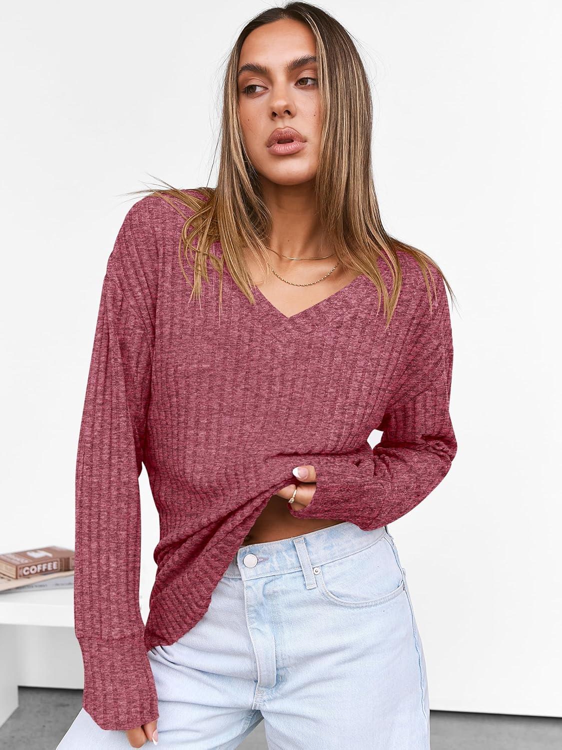 ANRABESS Long Sleeve Shirts for Women V Neck Casual Fall Tops Loose Fit Lightweight Sweaters Tunic Fashion 2025 Clothes(Red)