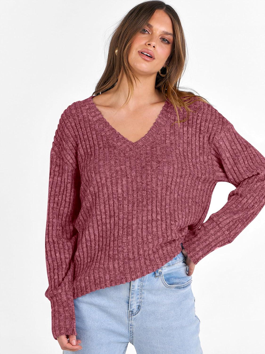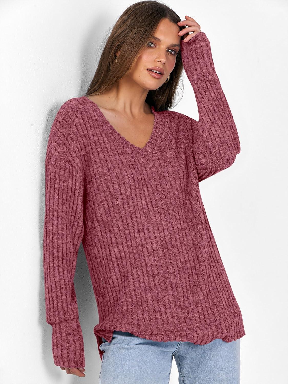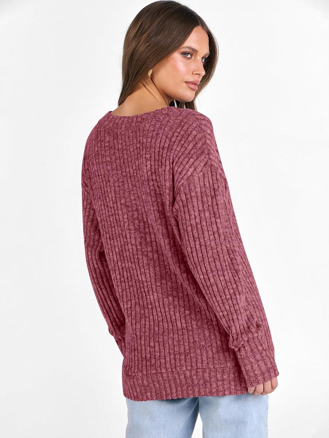 ANRABESS Long Sleeve Shirts for Women V Neck Casual Fall Tops Loose Fit Lightweight Sweaters Tunic Fashion 2025 Clothes(Red)