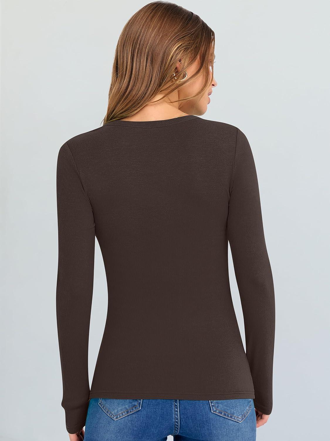 ANRABESS Long Sleeve Shirts for Women V Neck Ribbed Knit Fitted Fall Basic Tshirts Going Out Tops 2025 Casual Trendy Clothes(Coffee)