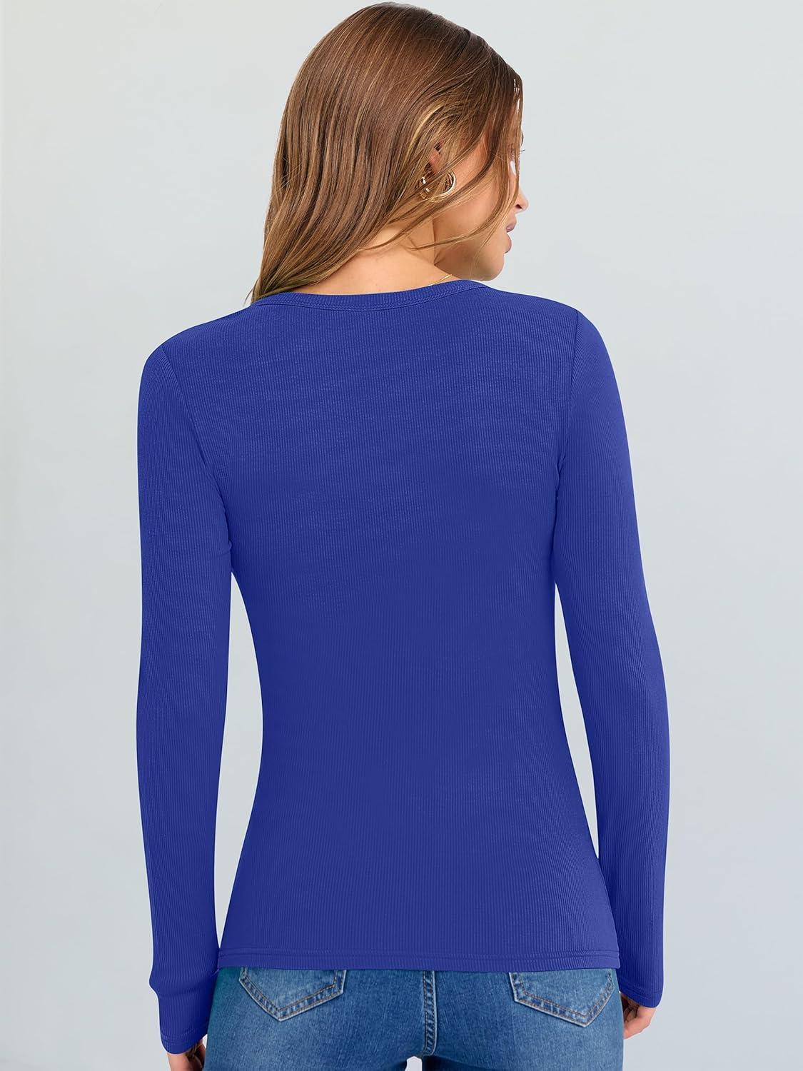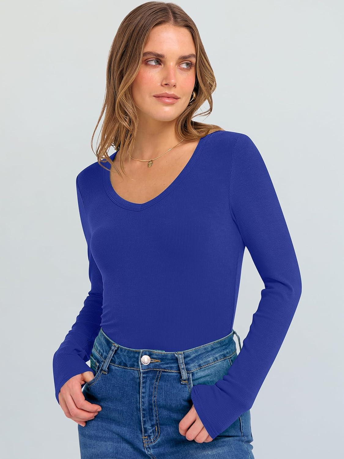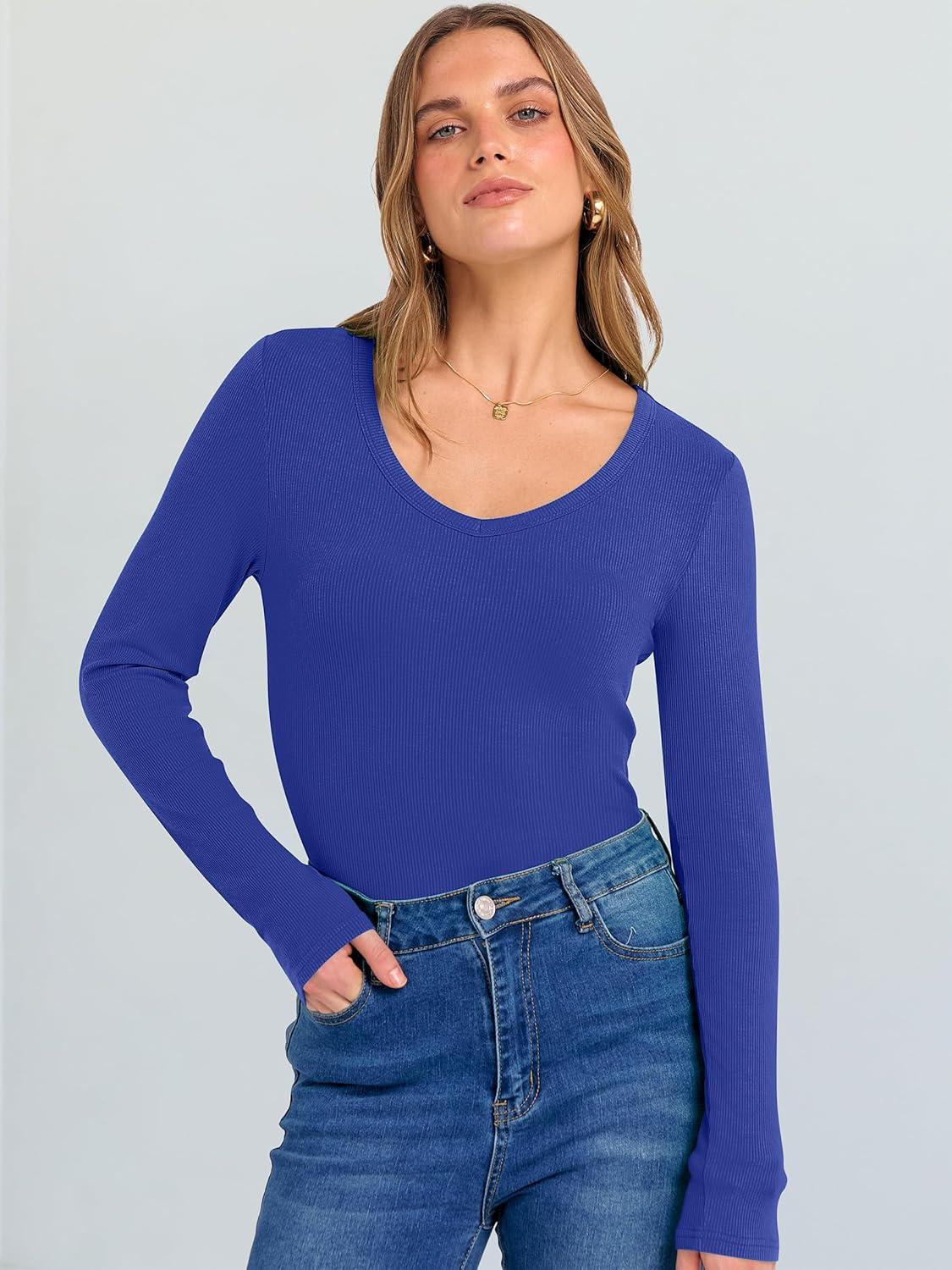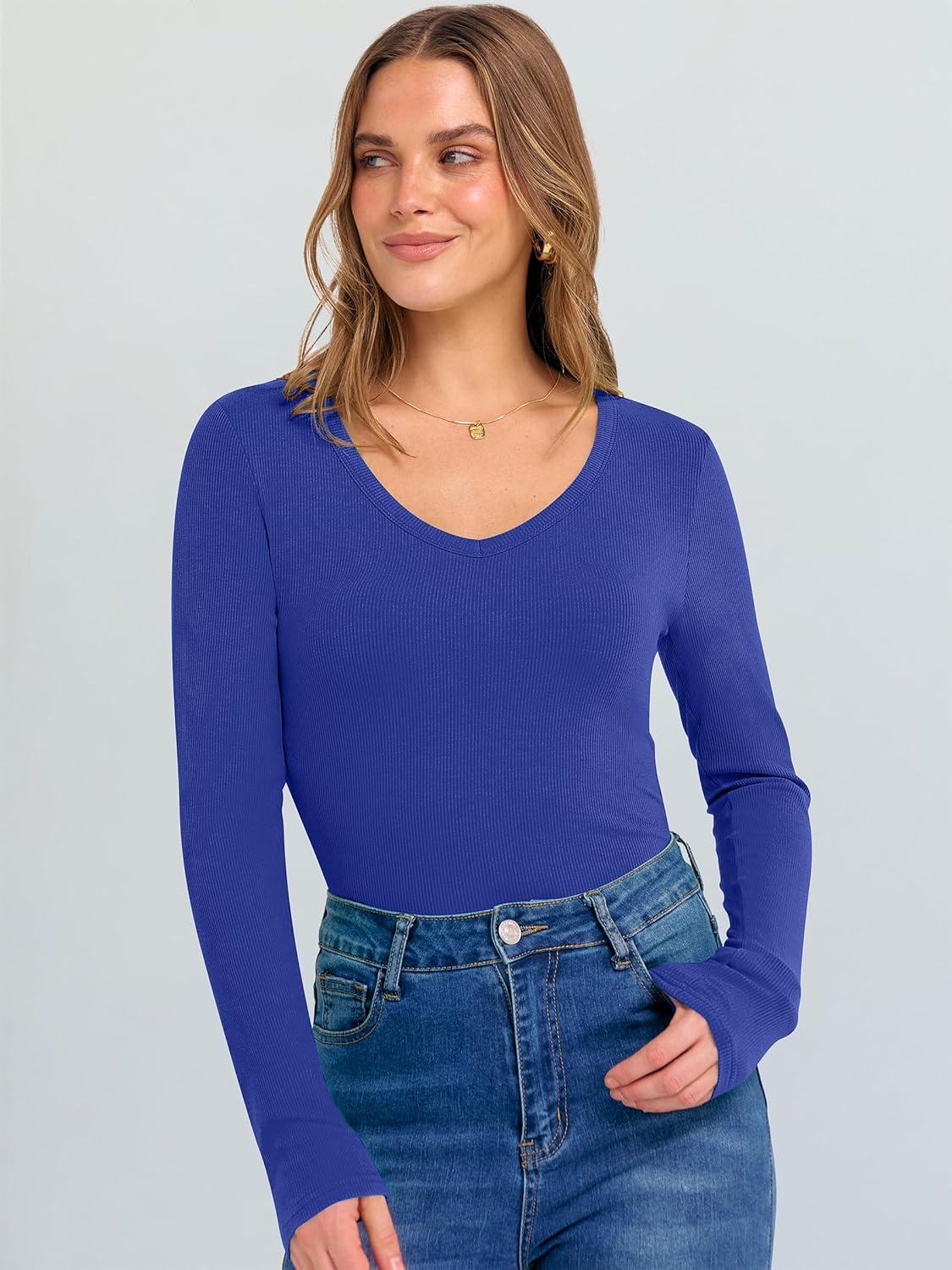 ANRABESS Long Sleeve Shirts for Women V Neck Ribbed Knit Fitted Fall Basic Tshirts Going Out Tops 2025 Casual Trendy Clothes(Royal Blue)
