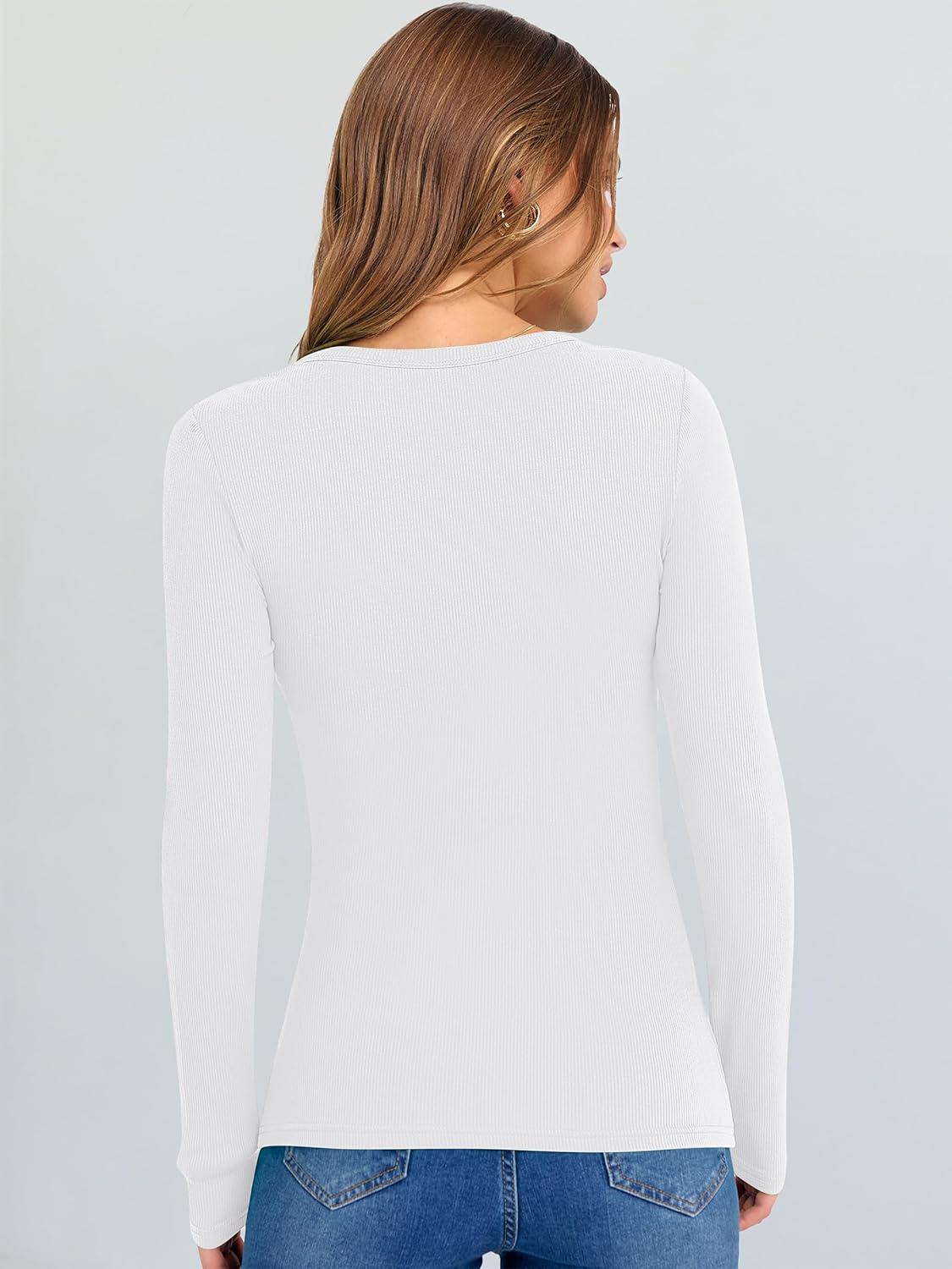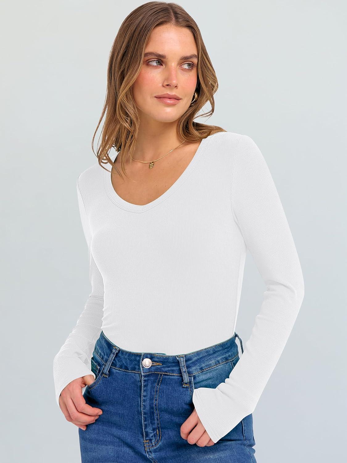 ANRABESS Long Sleeve Shirts for Women V Neck Ribbed Knit Fitted Fall Basic Tshirts Going Out Tops 2025 Casual Trendy Clothes(White)