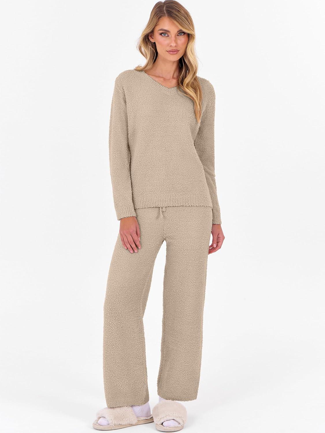 ANRABESS Lounge Sets for Women Fuzzy Fleece Pajama Sets 2 Piece Outfits Cozy Sweater Matching Set 2025 Fall Winter Loungewear(Light Khaki)