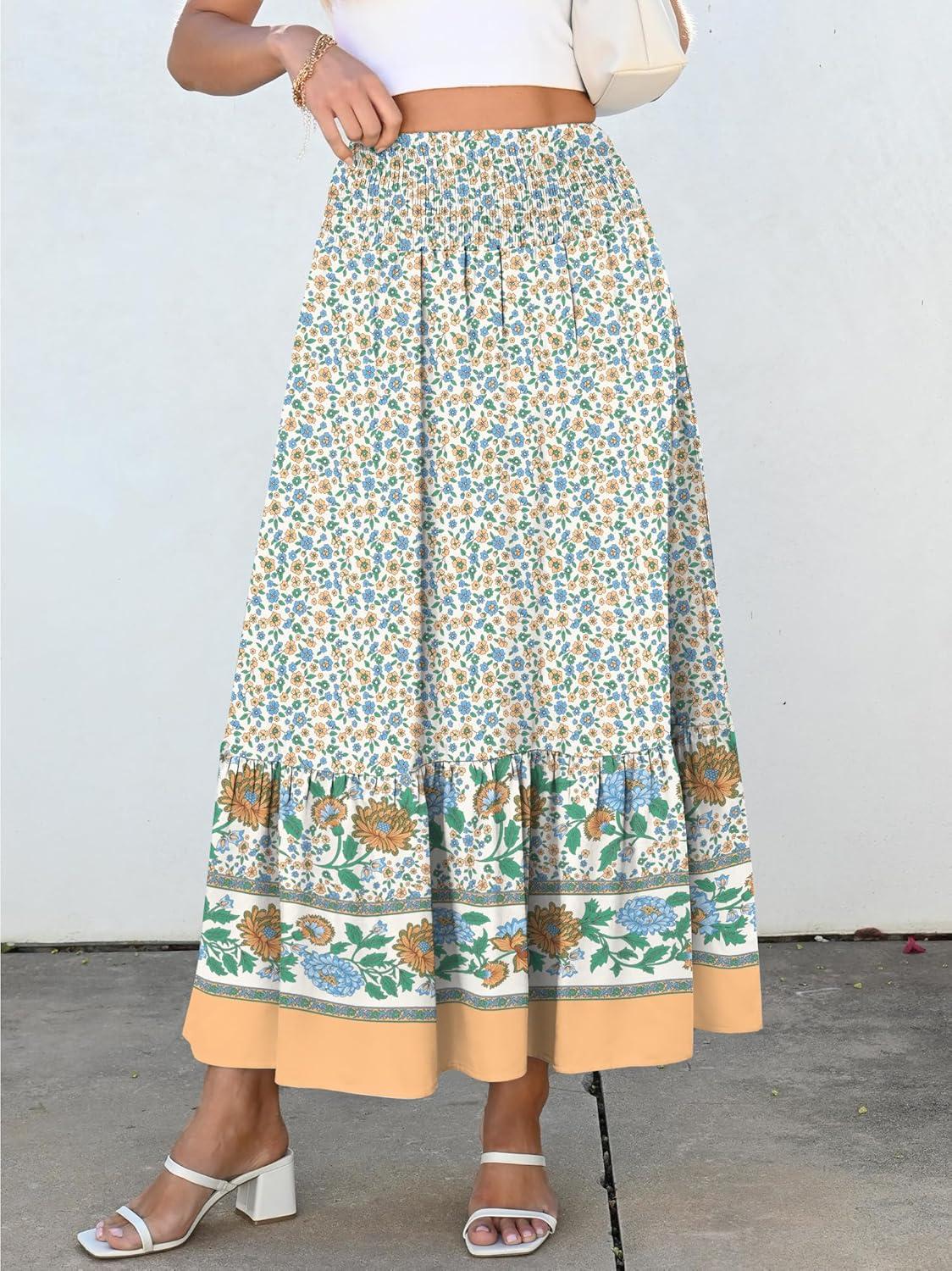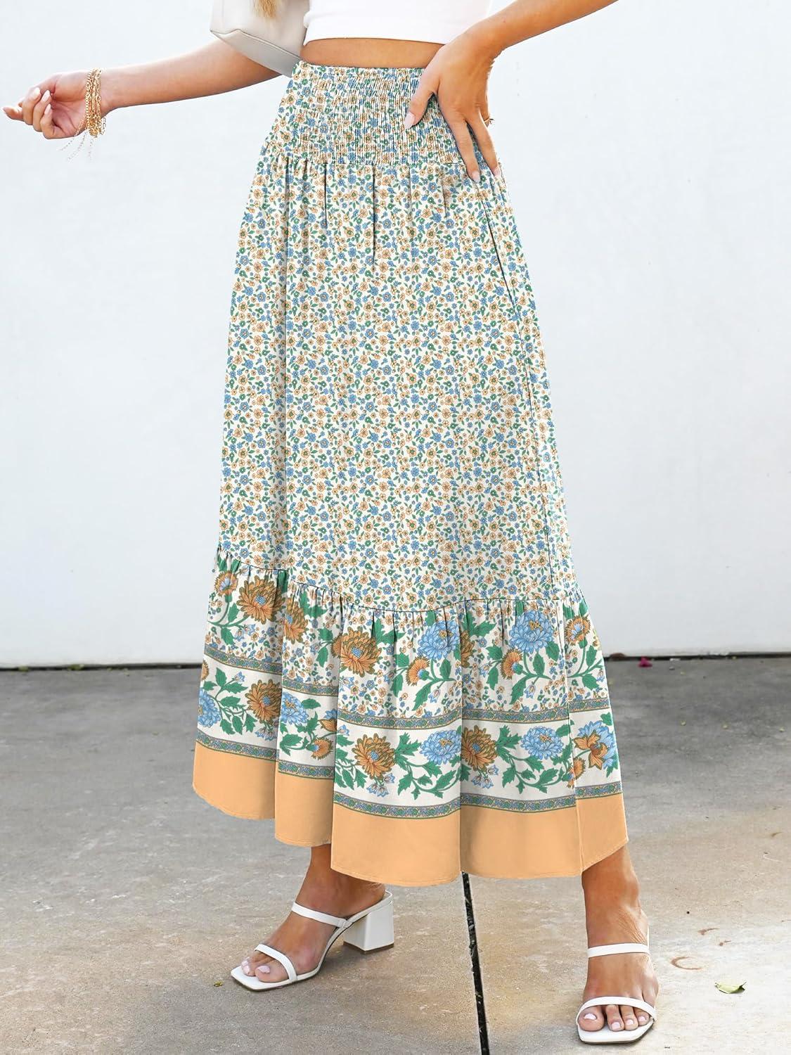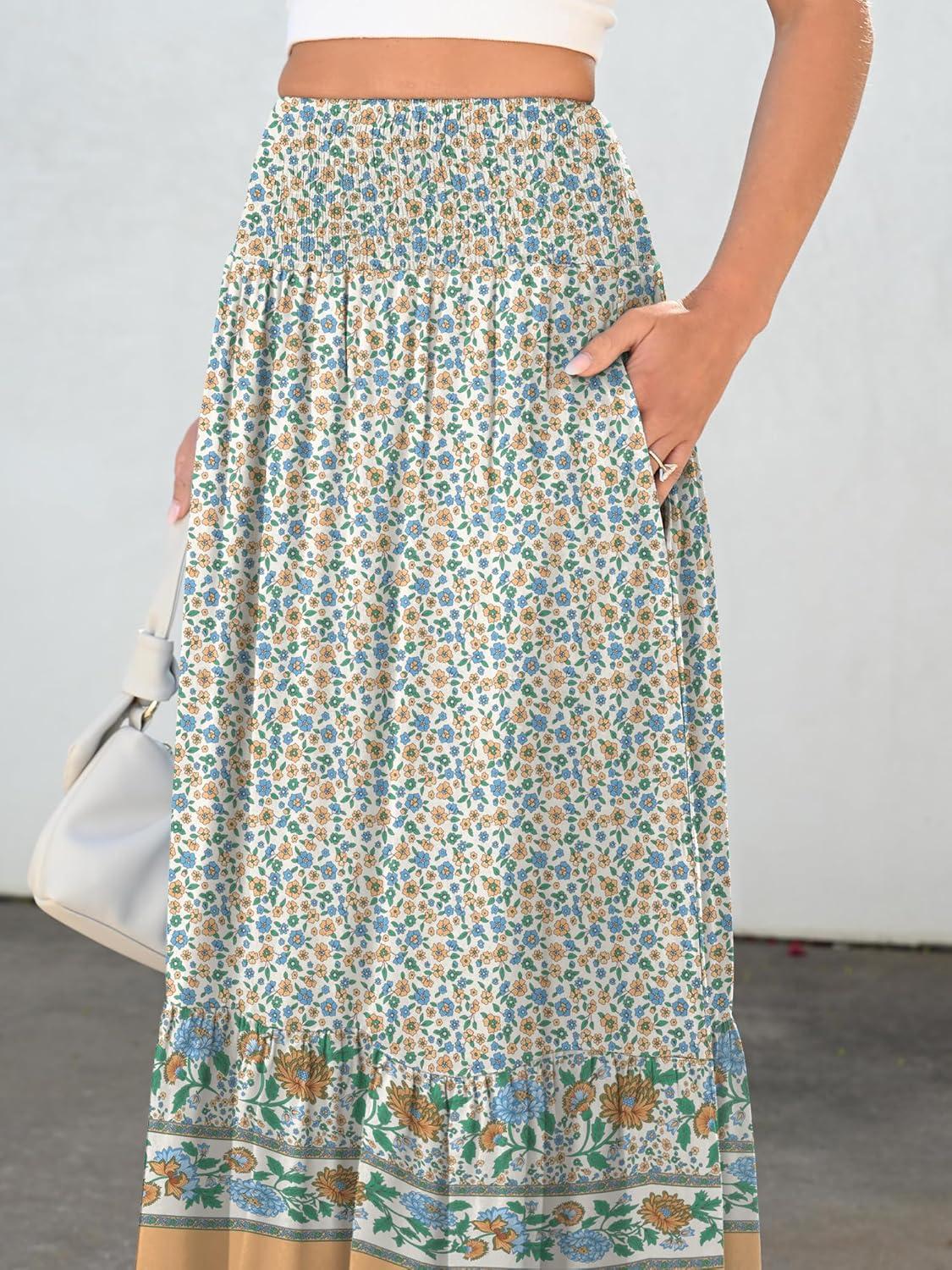 ANRABESS Maxi Skirts for Women 2025 Summer Boho Long Flowy Floral Elastic High Waist Skirt Casual Travel Skirt with Pockets(Blue Floral)
