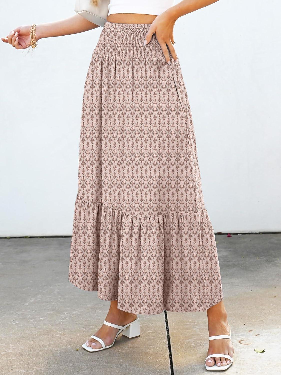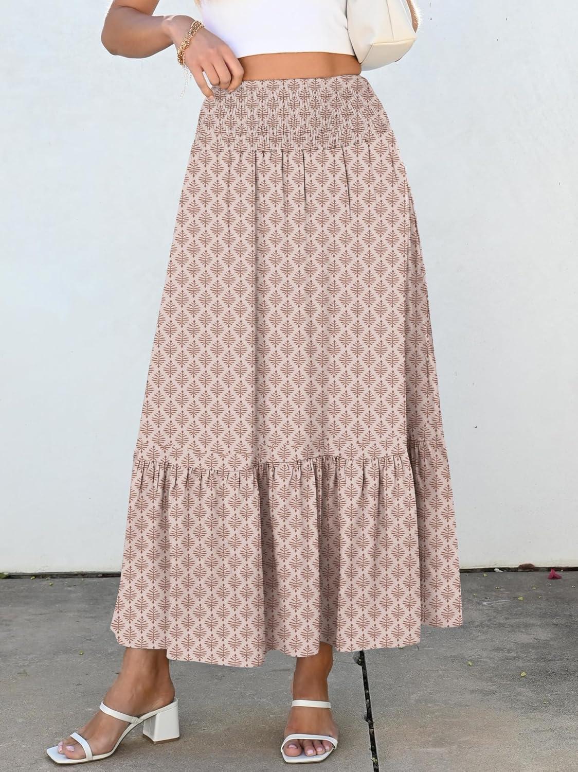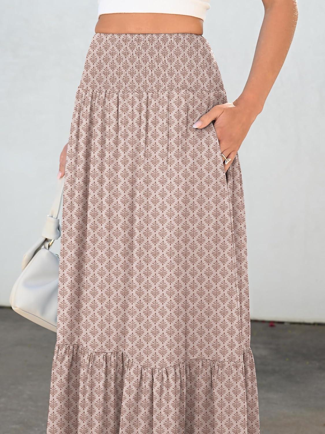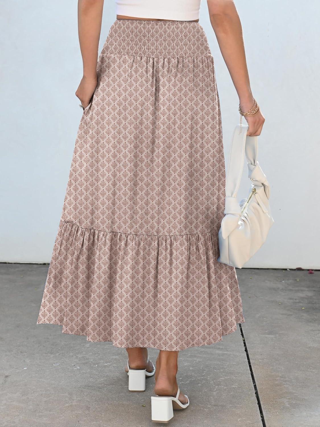 ANRABESS Maxi Skirts for Women 2025 Summer Boho Long Flowy Floral Elastic High Waist Skirt Casual Travel Skirt with Pockets(Brown Khaki)