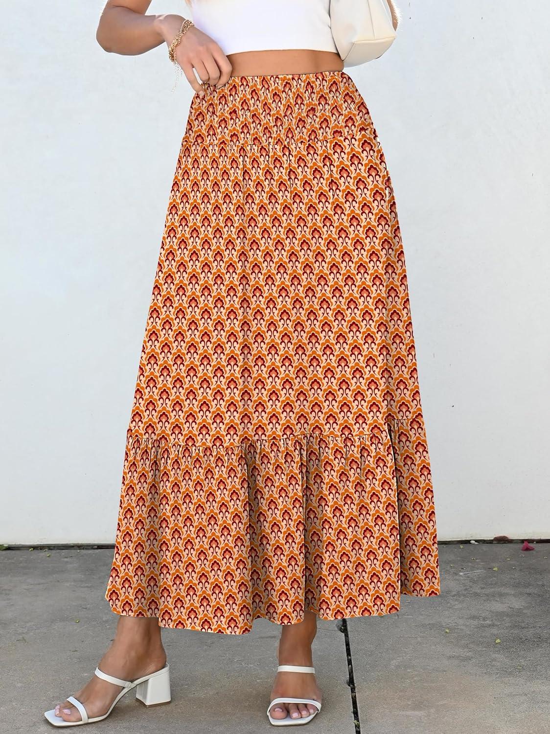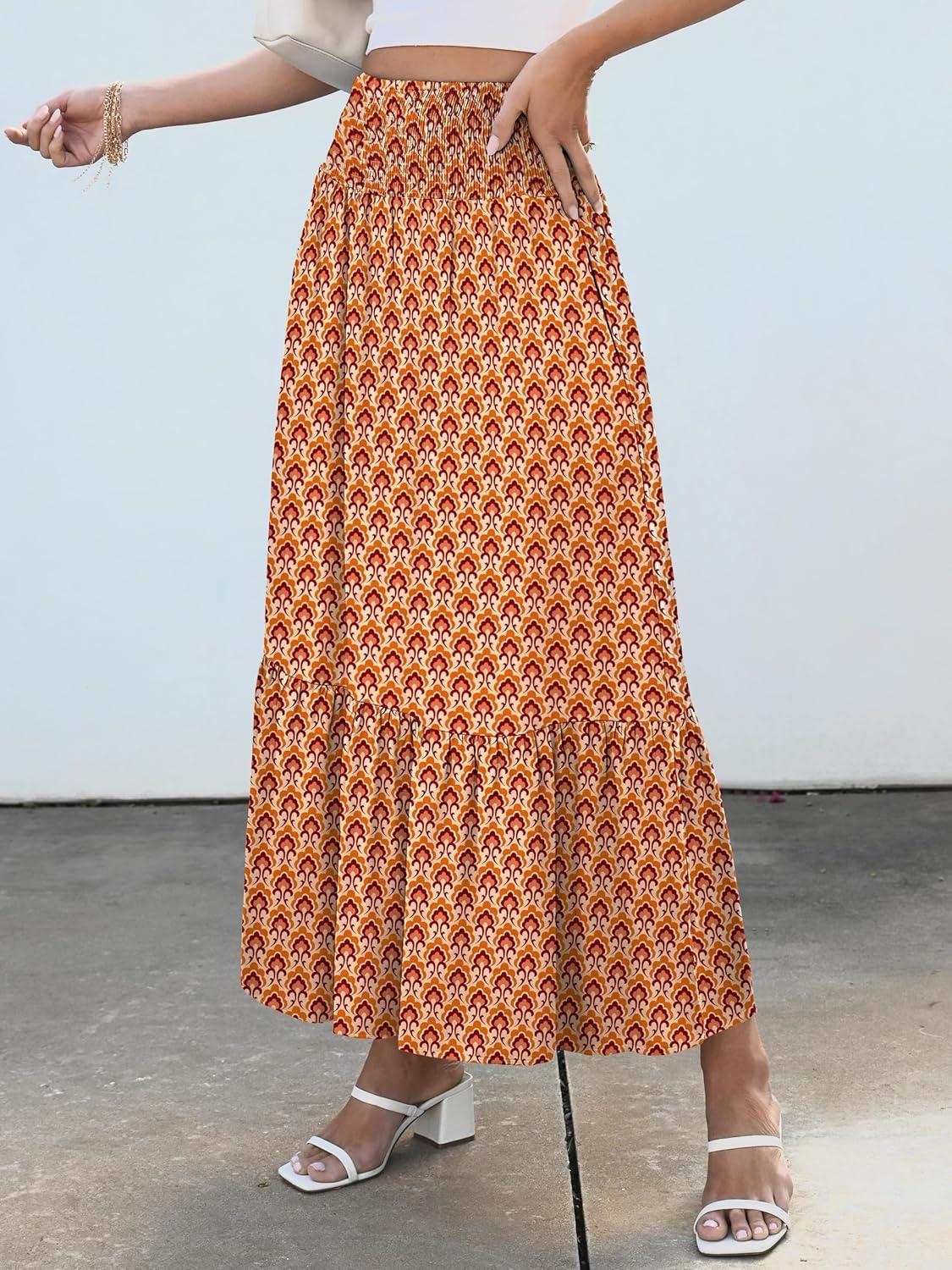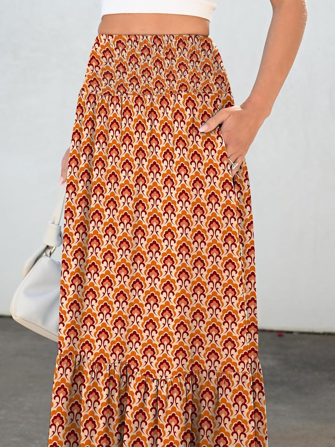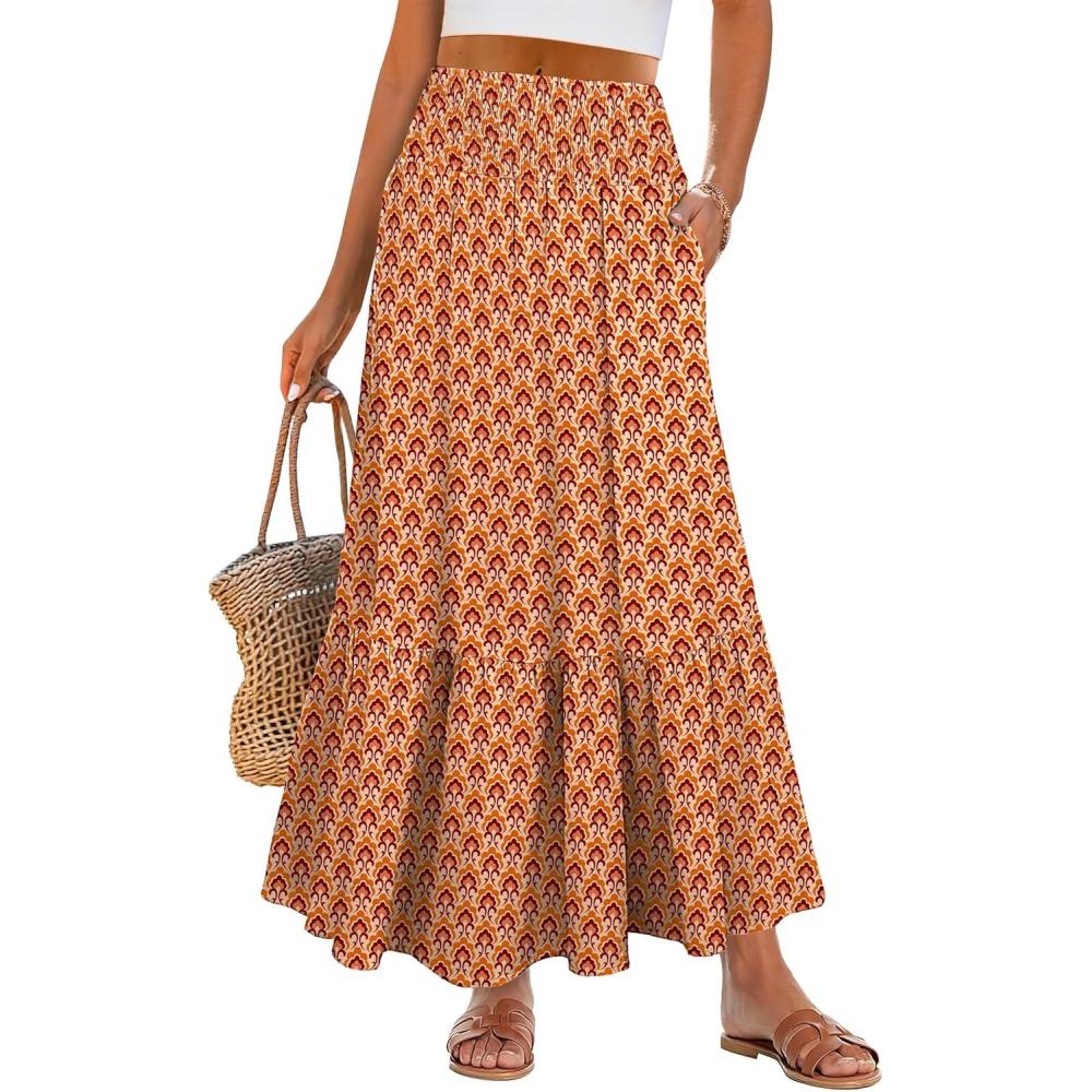 ANRABESS Maxi Skirts for Women 2025 Summer Boho Long Flowy Floral Elastic High Waist Skirt Casual Travel Skirt with Pockets(Orange)