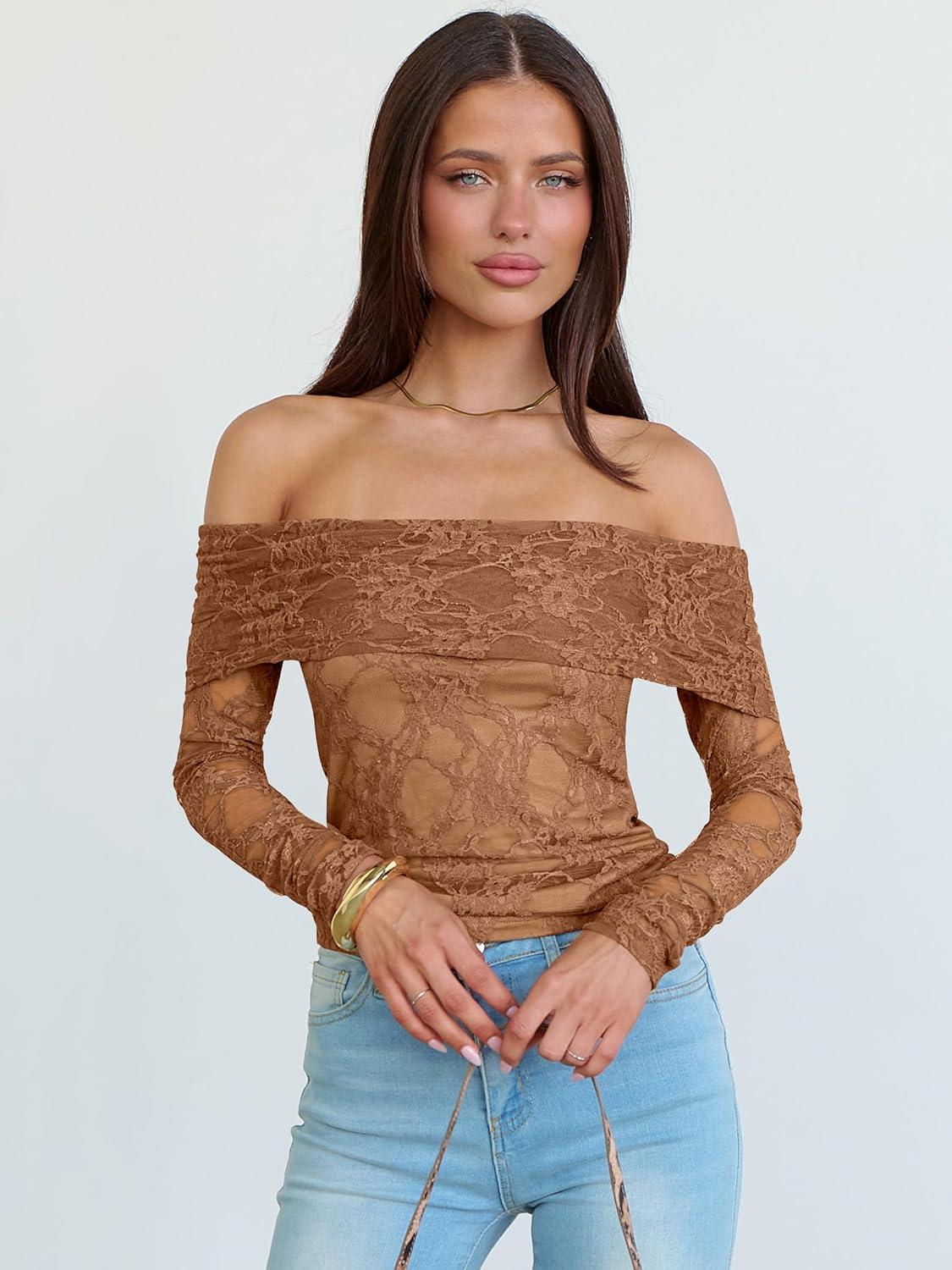 ANRABESS Off Shoulder Tops for Women Mesh Long Sleeve Floral Lace Slim Fit Blouses Shirts 2025 Y2K Going Out Fall Clothes(Brown Floral)