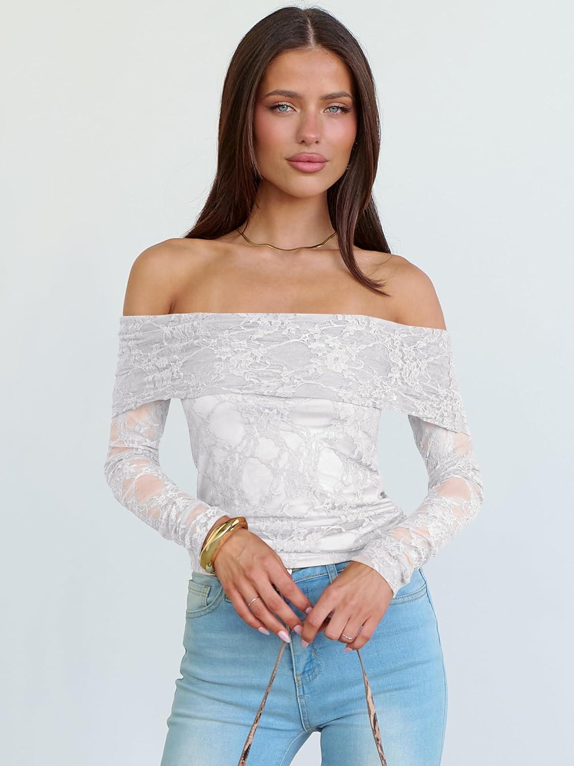ANRABESS Off Shoulder Tops for Women Mesh Long Sleeve Floral Lace Slim Fit Blouses Shirts 2025 Y2K Going Out Fall Clothes(White Floral)
