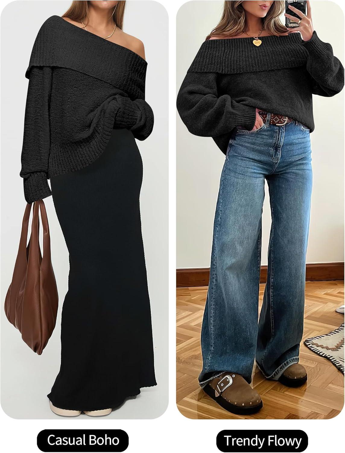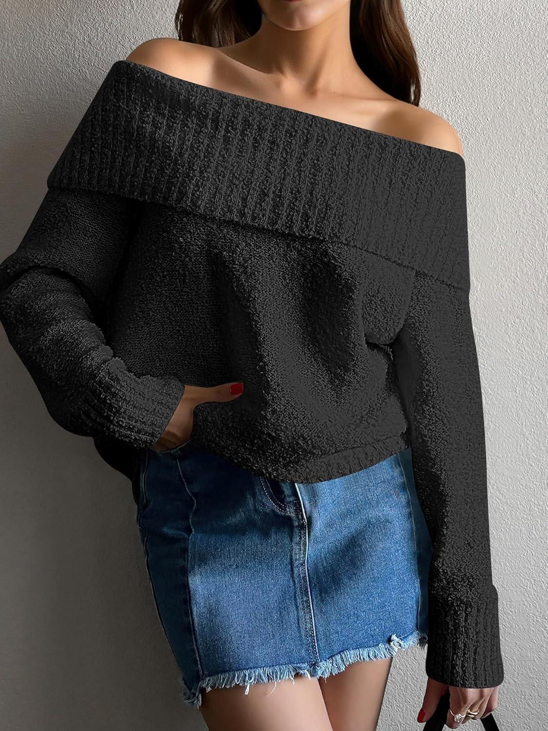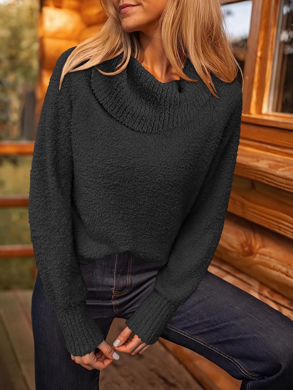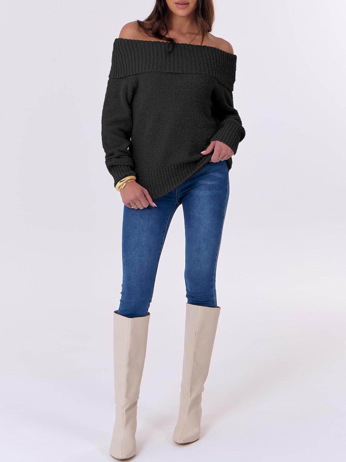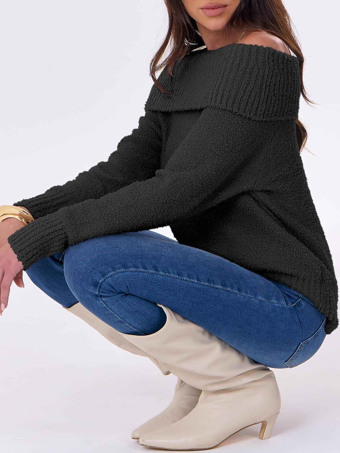 ANRABESS Off The Shoulder Sweaters for Women 2025 Fall Turtleneck Long Sleeve Fuzzy Knit Warm Casual Winter Sweater(Black)