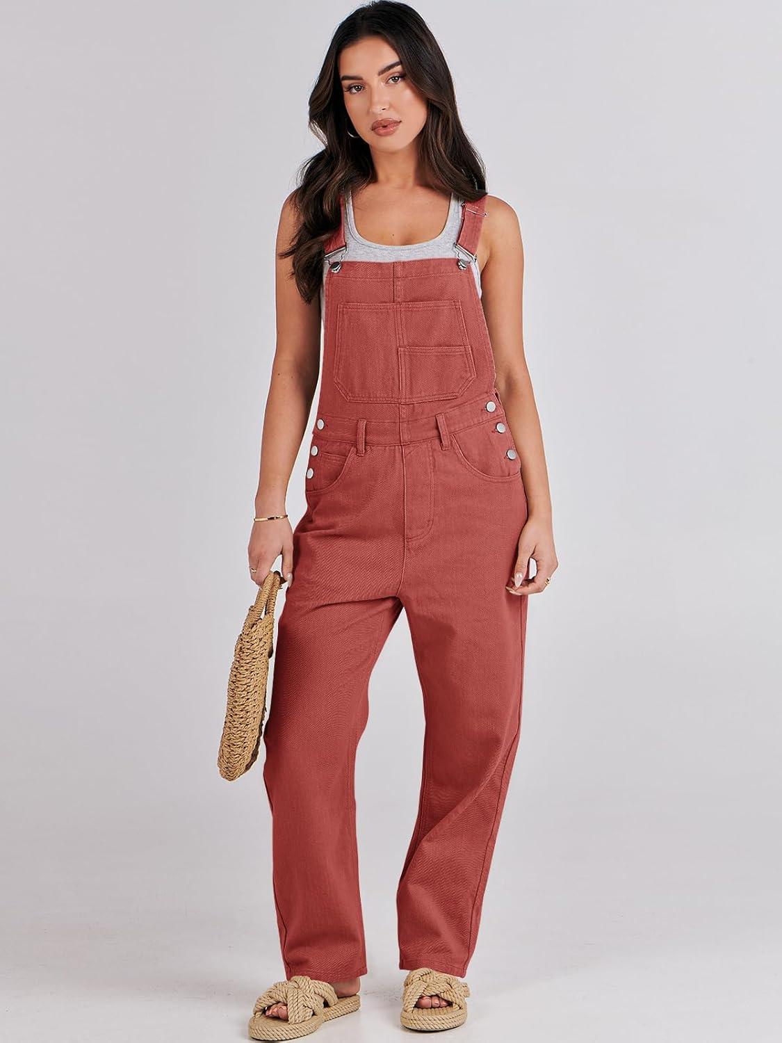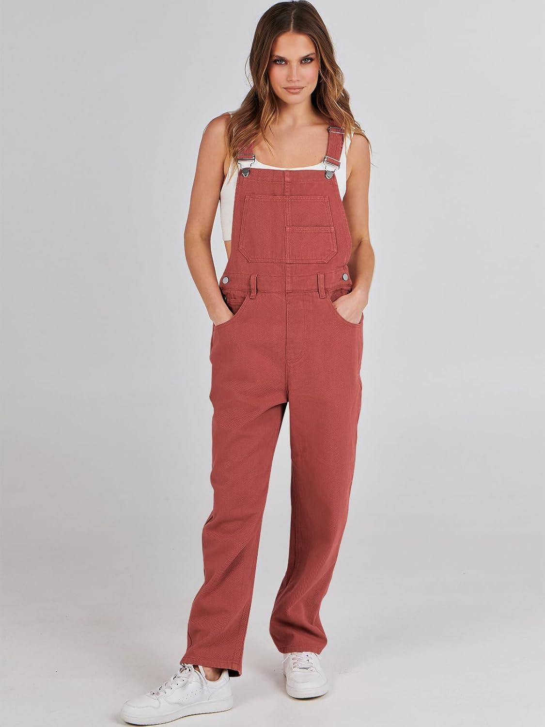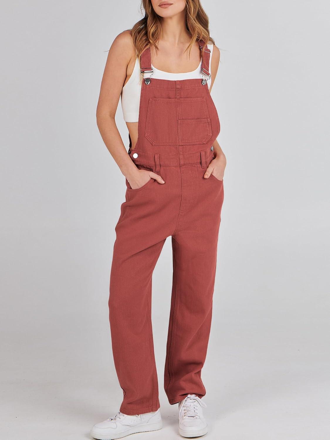 ANRABESS Overalls for Women Loose Fit Denim Overalls Adjustable Strap Jean Jumpsuit Bib Romper 2025 Fall Casual Work Outfits(Rust Red)