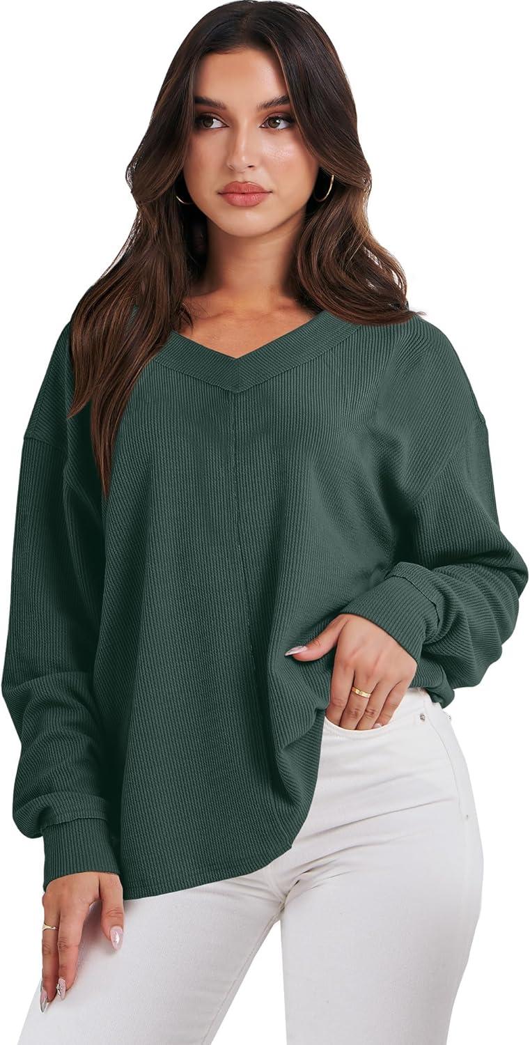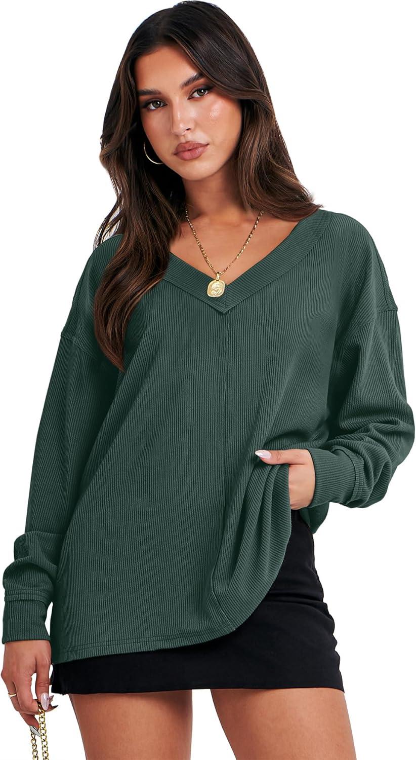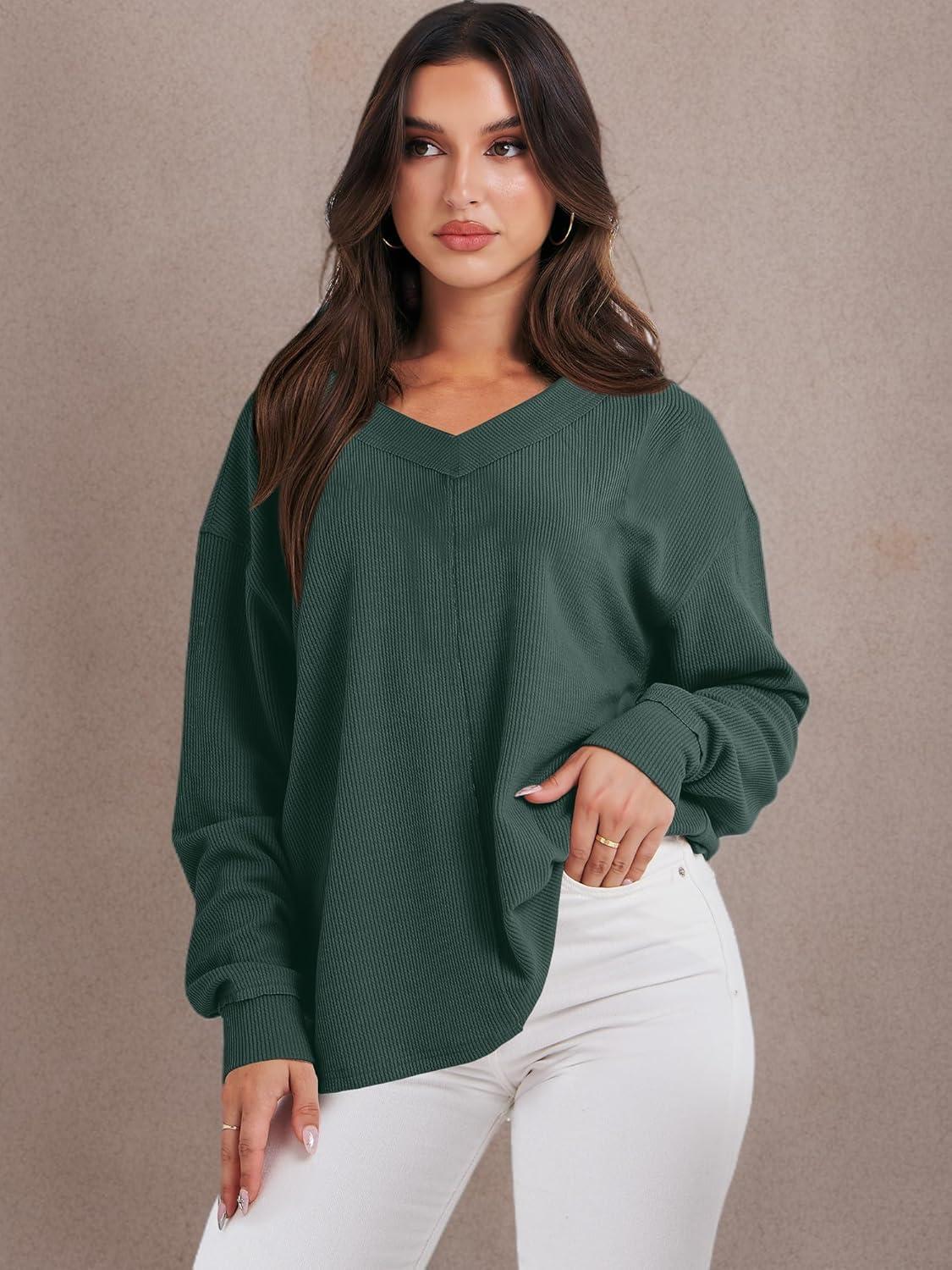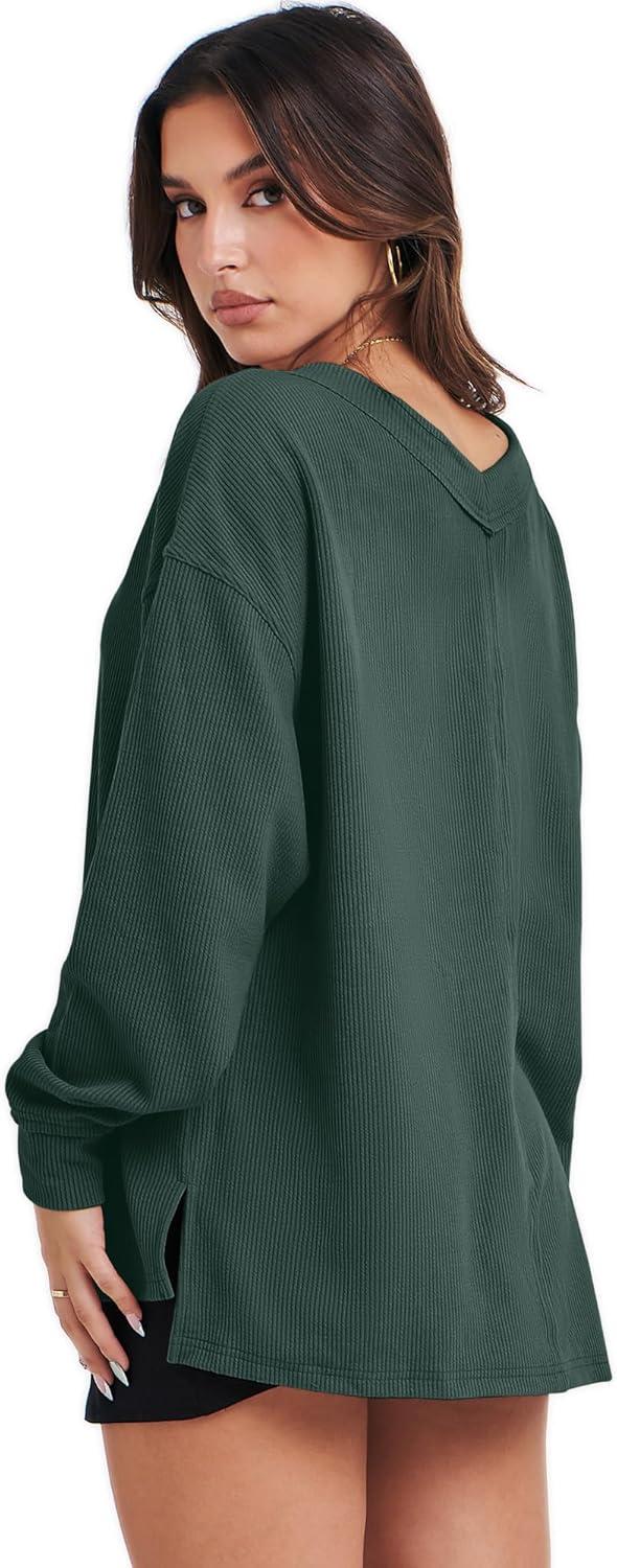 ANRABESS Oversized Long Sleeve Shirts for Women Off the Shoulder Sweatshirt Loose V Neck Tunic Tops High Low Sweater 2025(Dark Green)