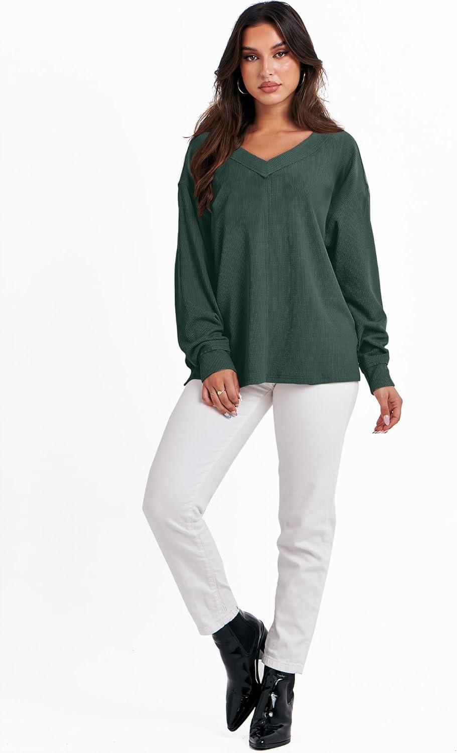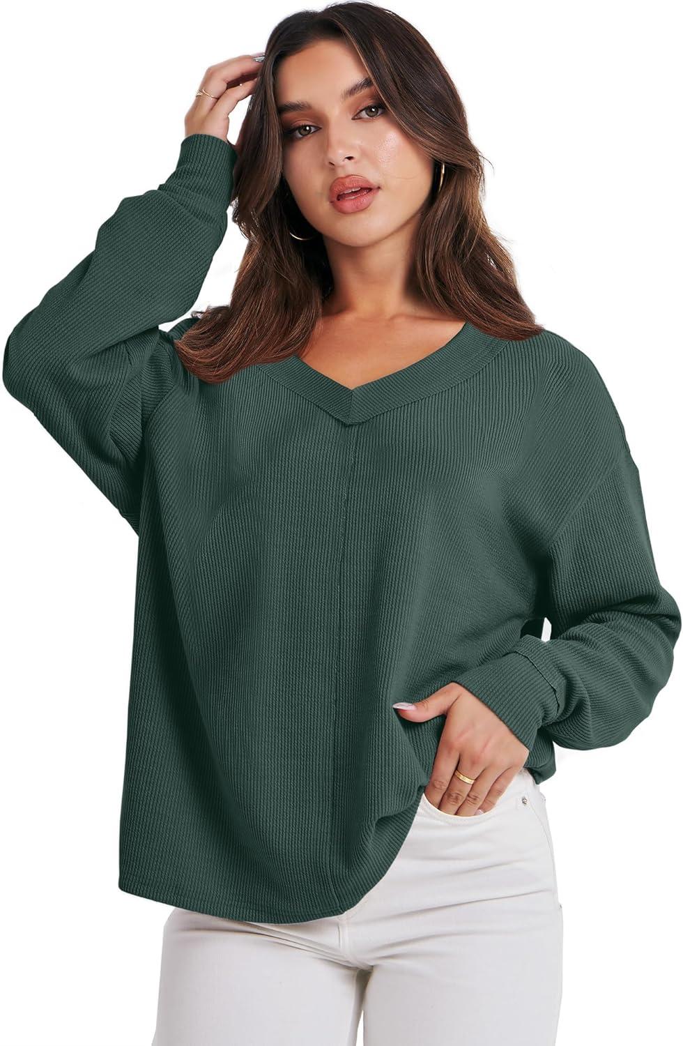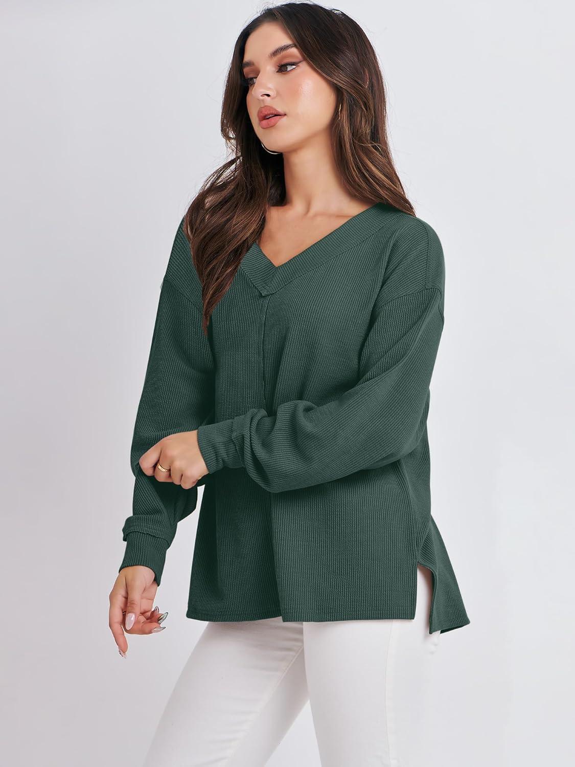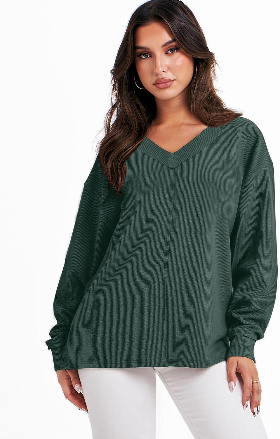 ANRABESS Oversized Long Sleeve Shirts for Women Off the Shoulder Sweatshirt Loose V Neck Tunic Tops High Low Sweater 2025(Dark Green)