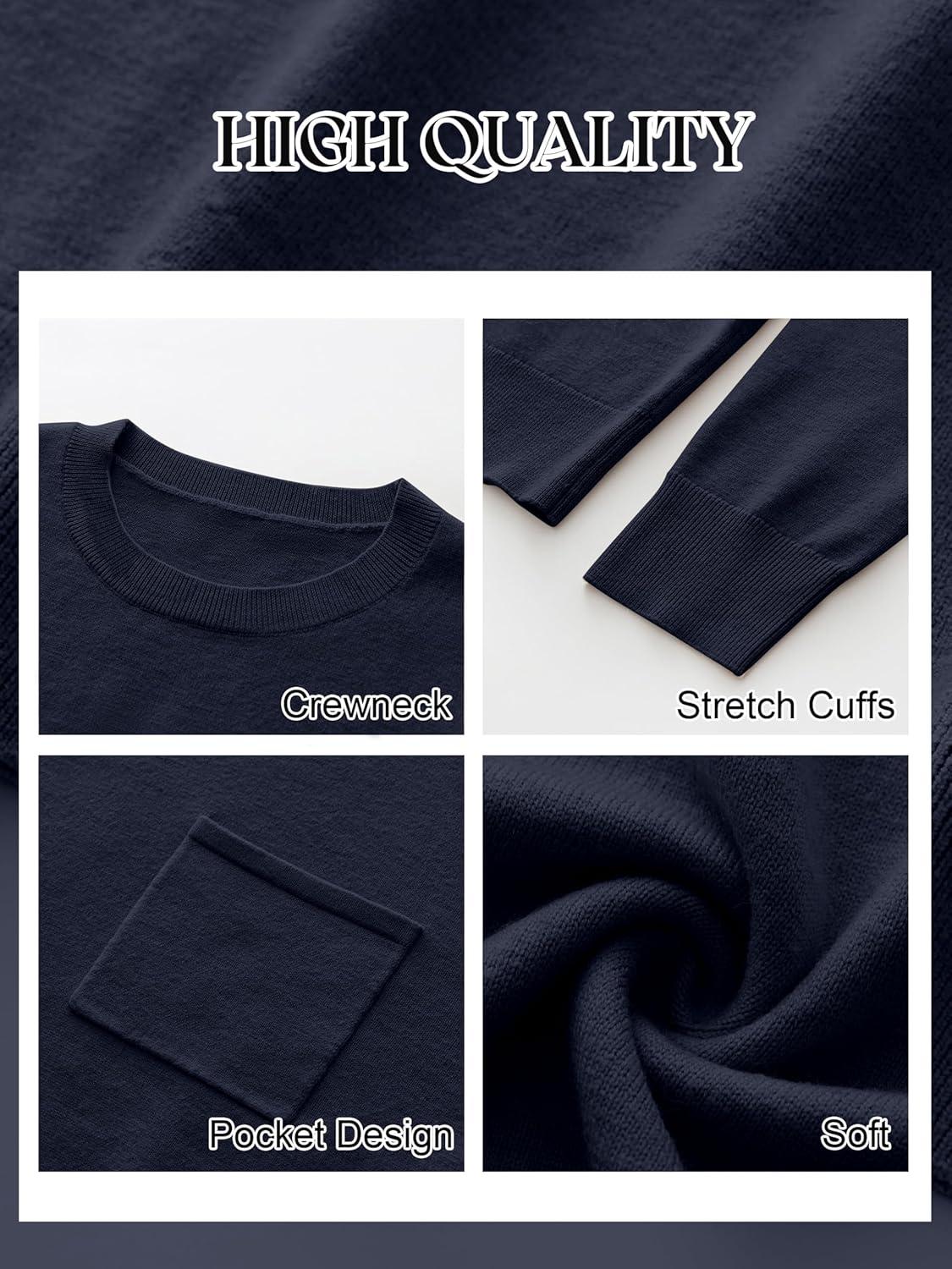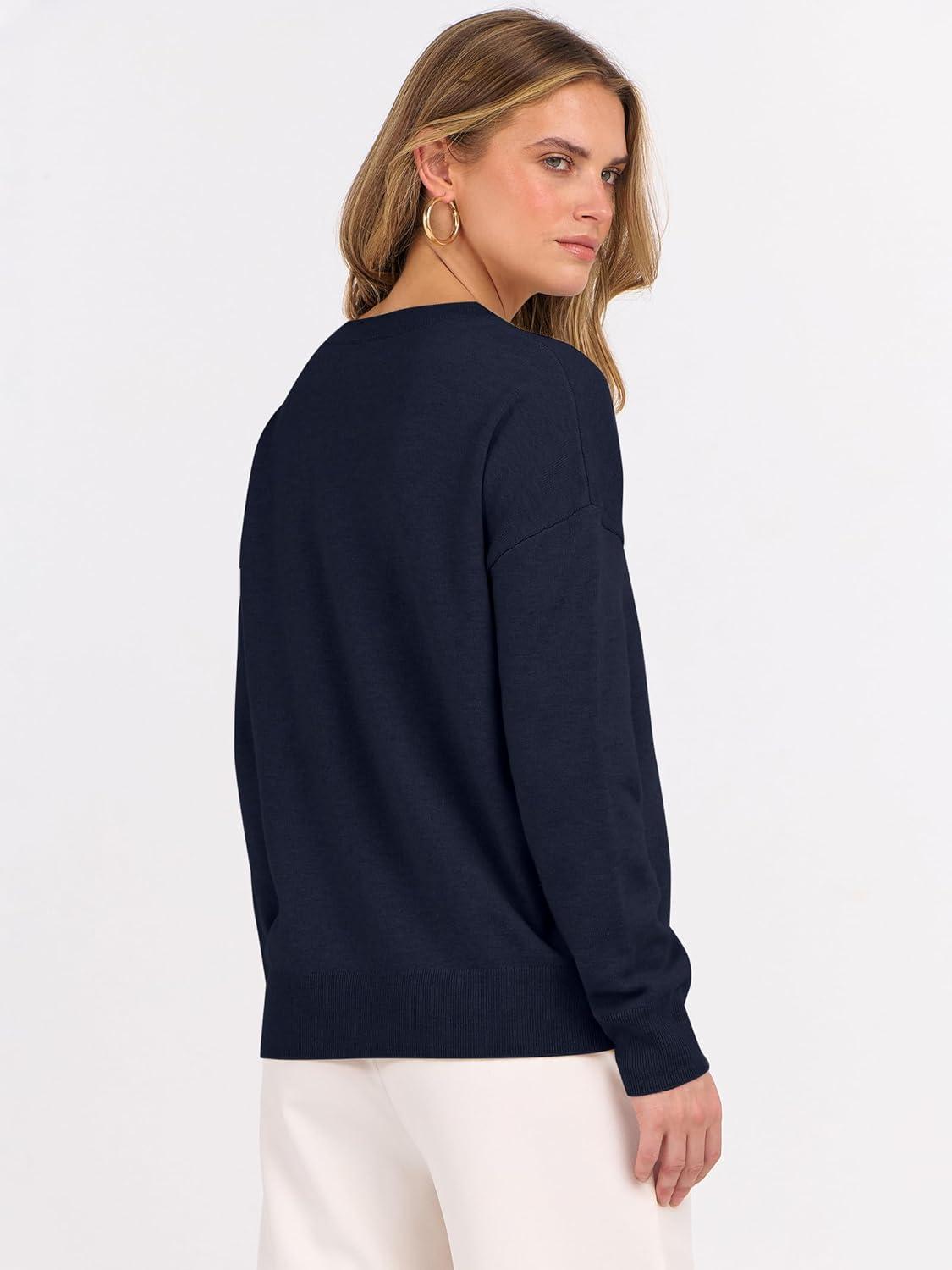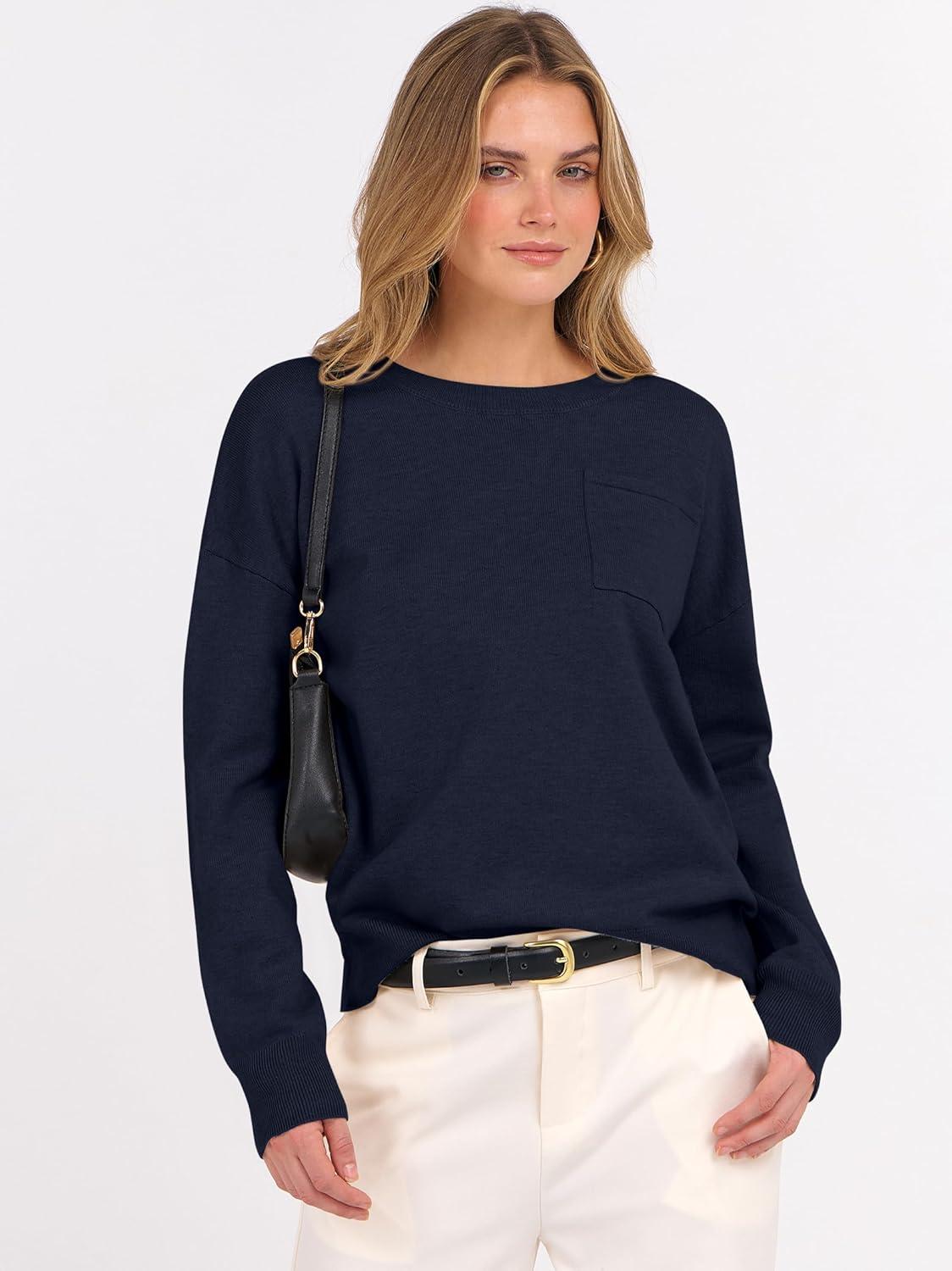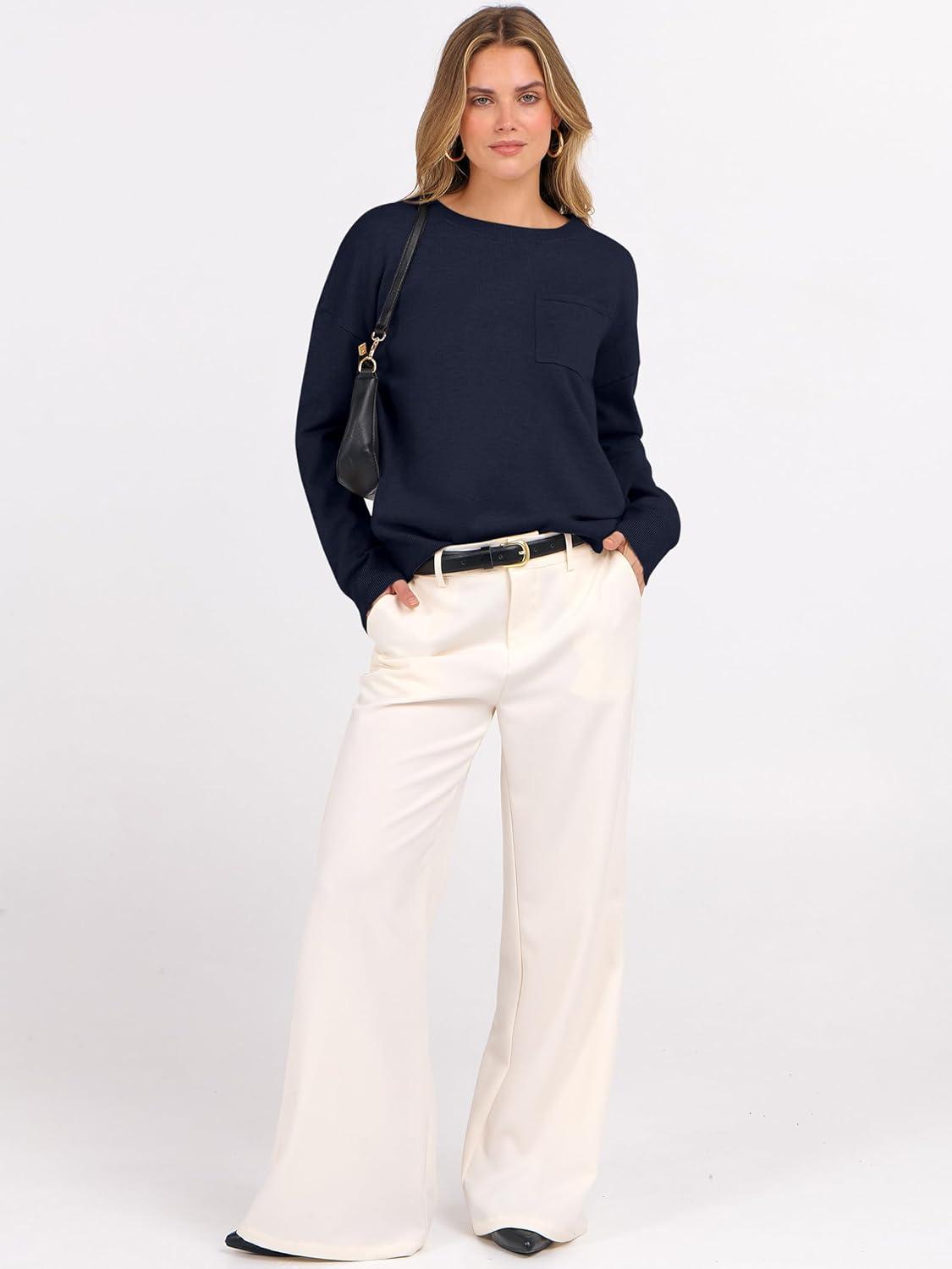 ANRABESS Oversized Sweaters for Women Casual Crewneck Knit Lightweight Chest Pocket Pullover Top 2025 Fall Travel Outfits(Navy Blue)