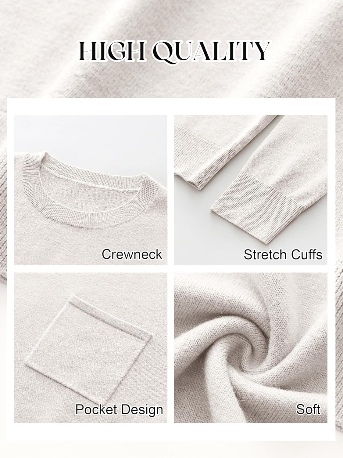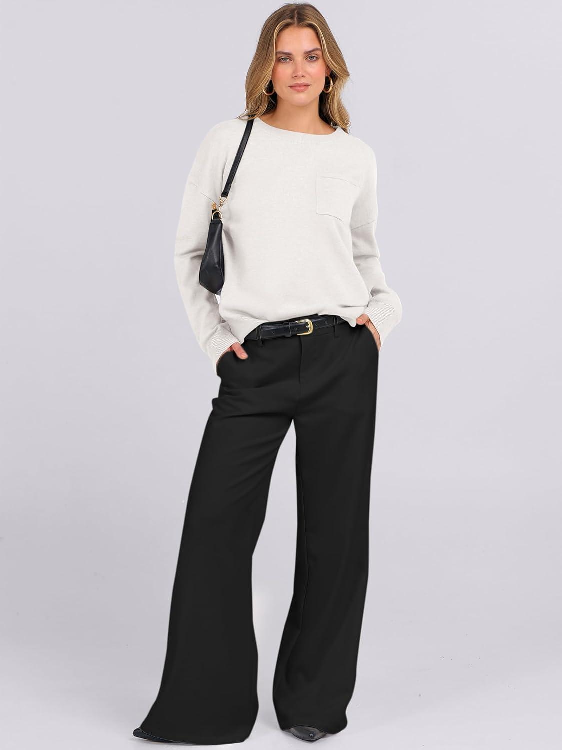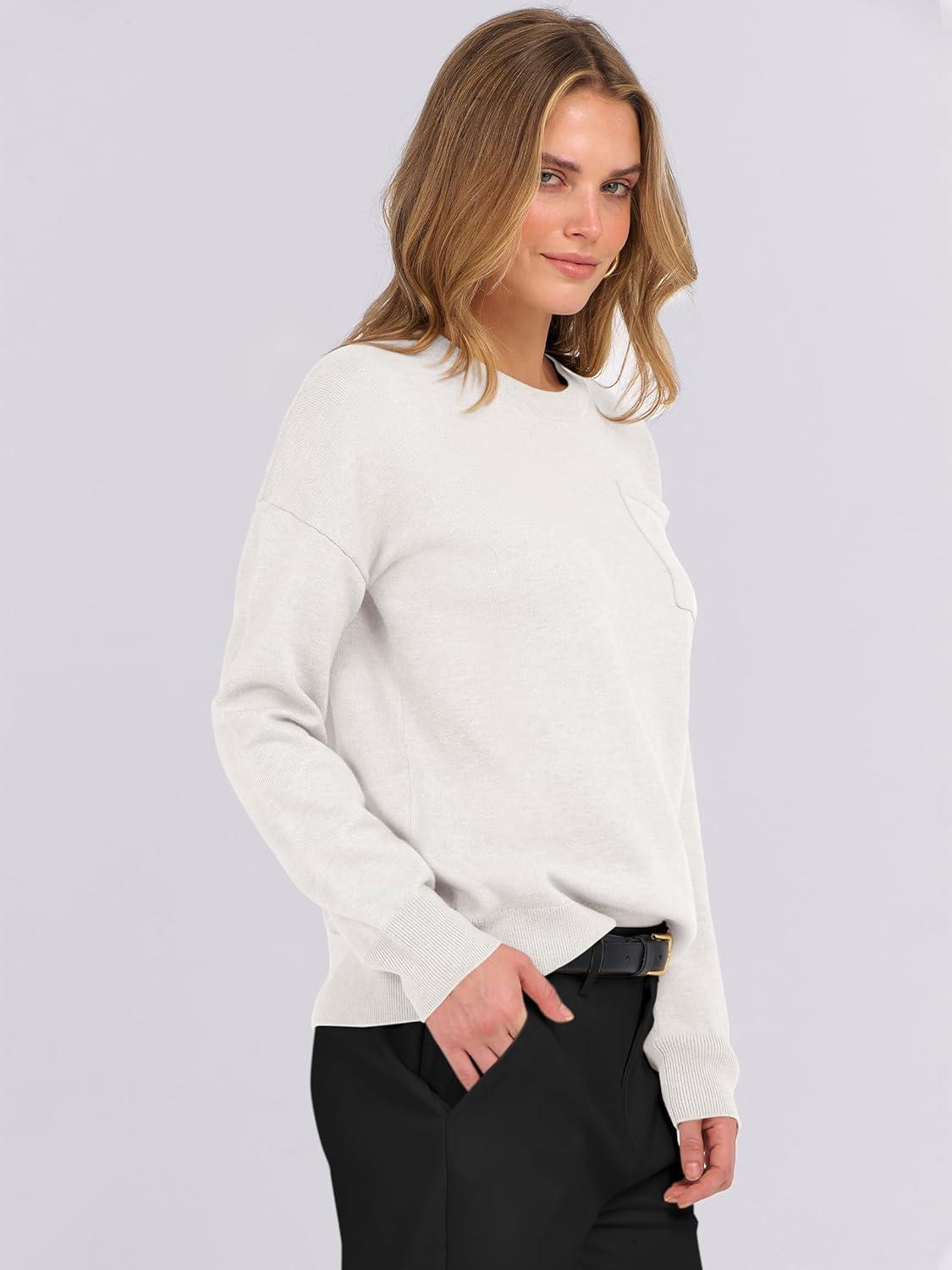 ANRABESS Oversized Sweaters for Women Casual Crewneck Knit Lightweight Chest Pocket Pullover Top 2025 Fall Travel Outfits(Off-white)