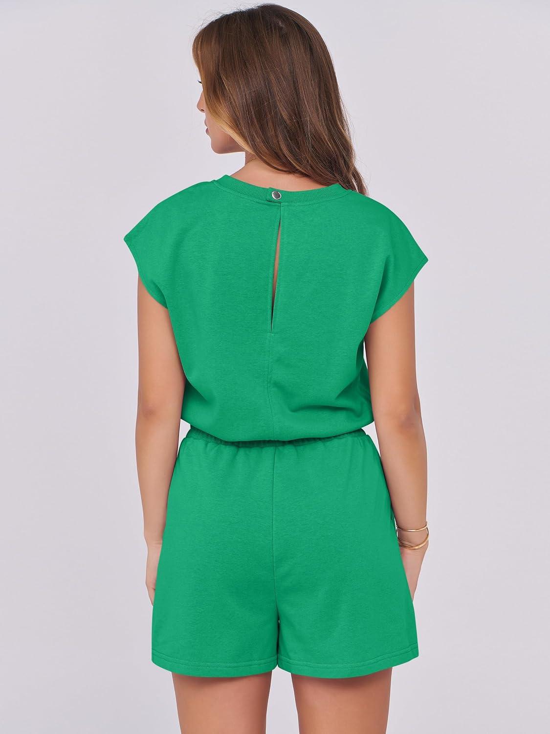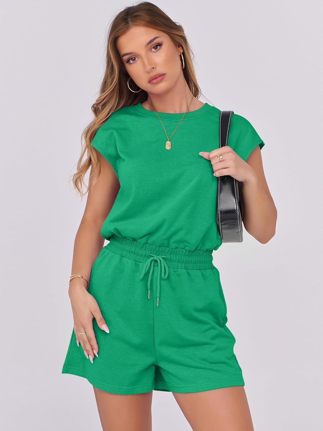 ANRABESS Rompers for Women Summer 2025 Casual Cap Sleeve Crewneck Drawstring One Piece Jumpsuit Outfits with Pockets(Green)