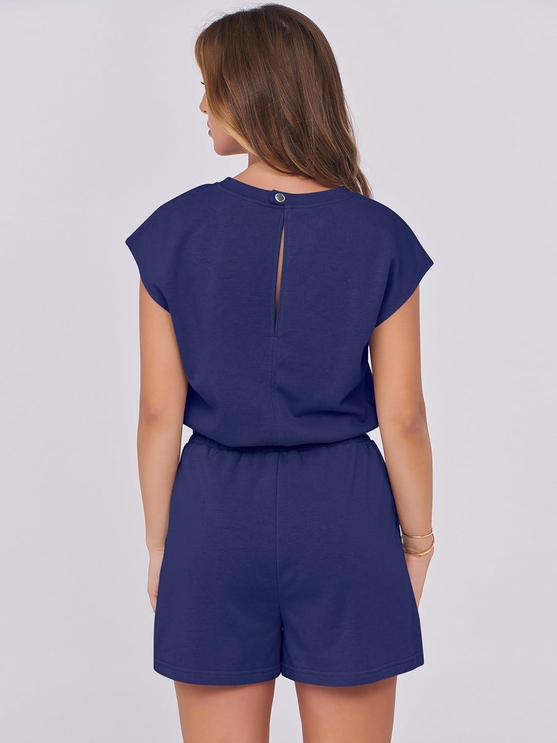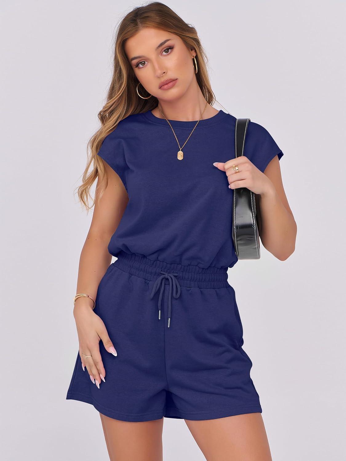 ANRABESS Rompers for Women Summer 2025 Casual Cap Sleeve Crewneck Drawstring One Piece Jumpsuit Outfits with Pockets(Navy Blue)
