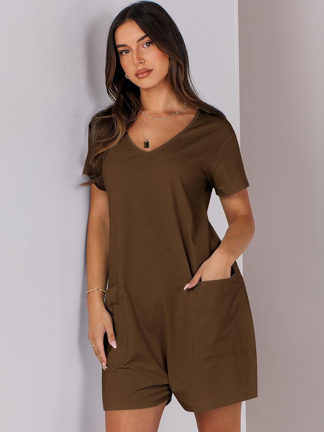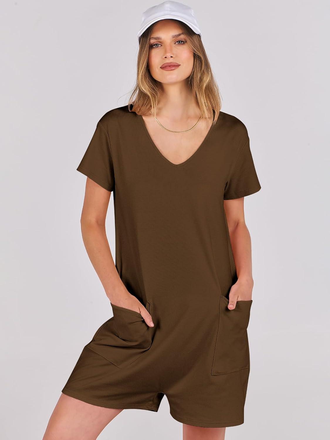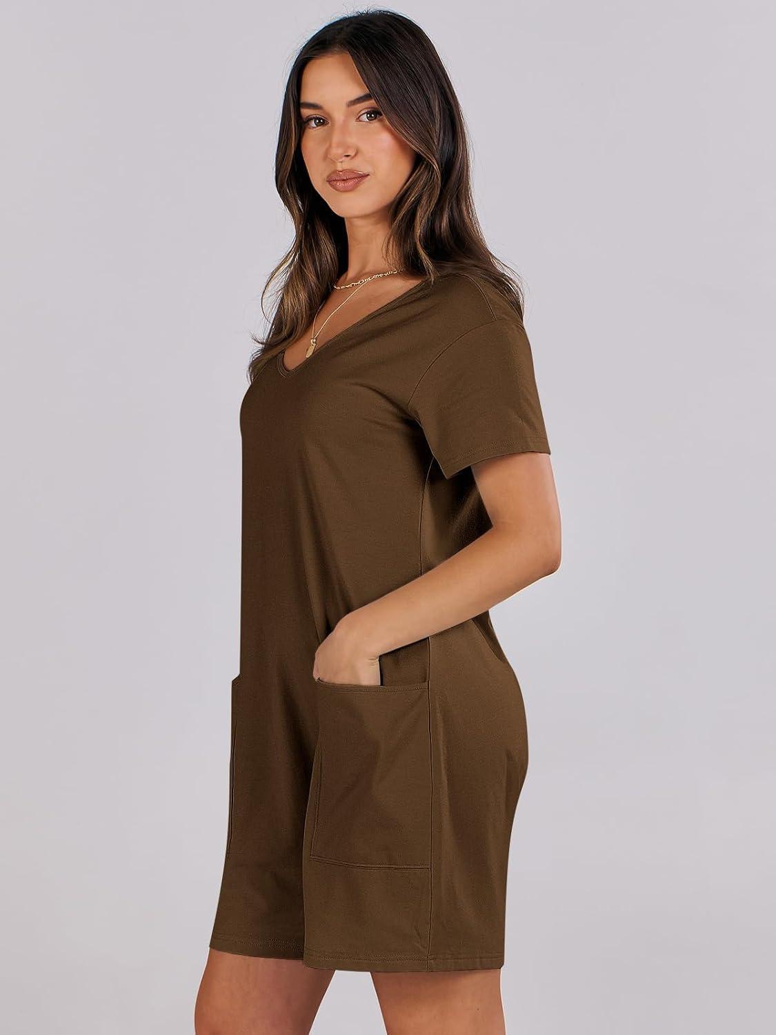 ANRABESS Rompers for Women Summer Casual Short Sleeve Jumpsuits V Neck Loose Fit One Piece Outfits with Pockets 2025 Clothes(Coffee)