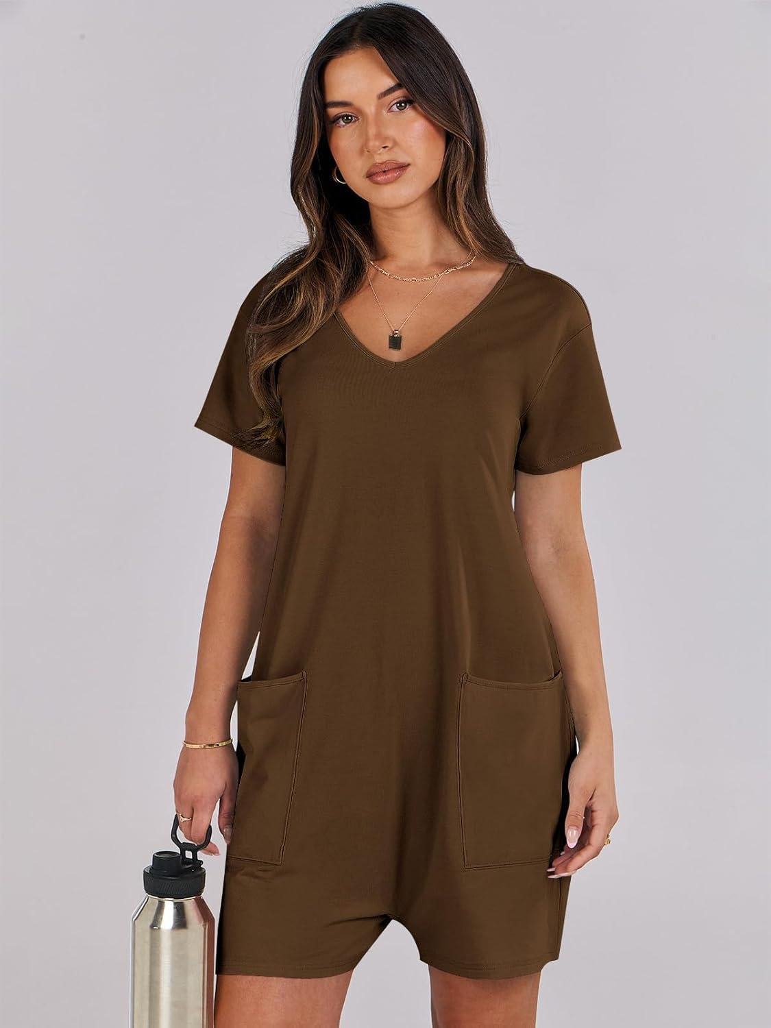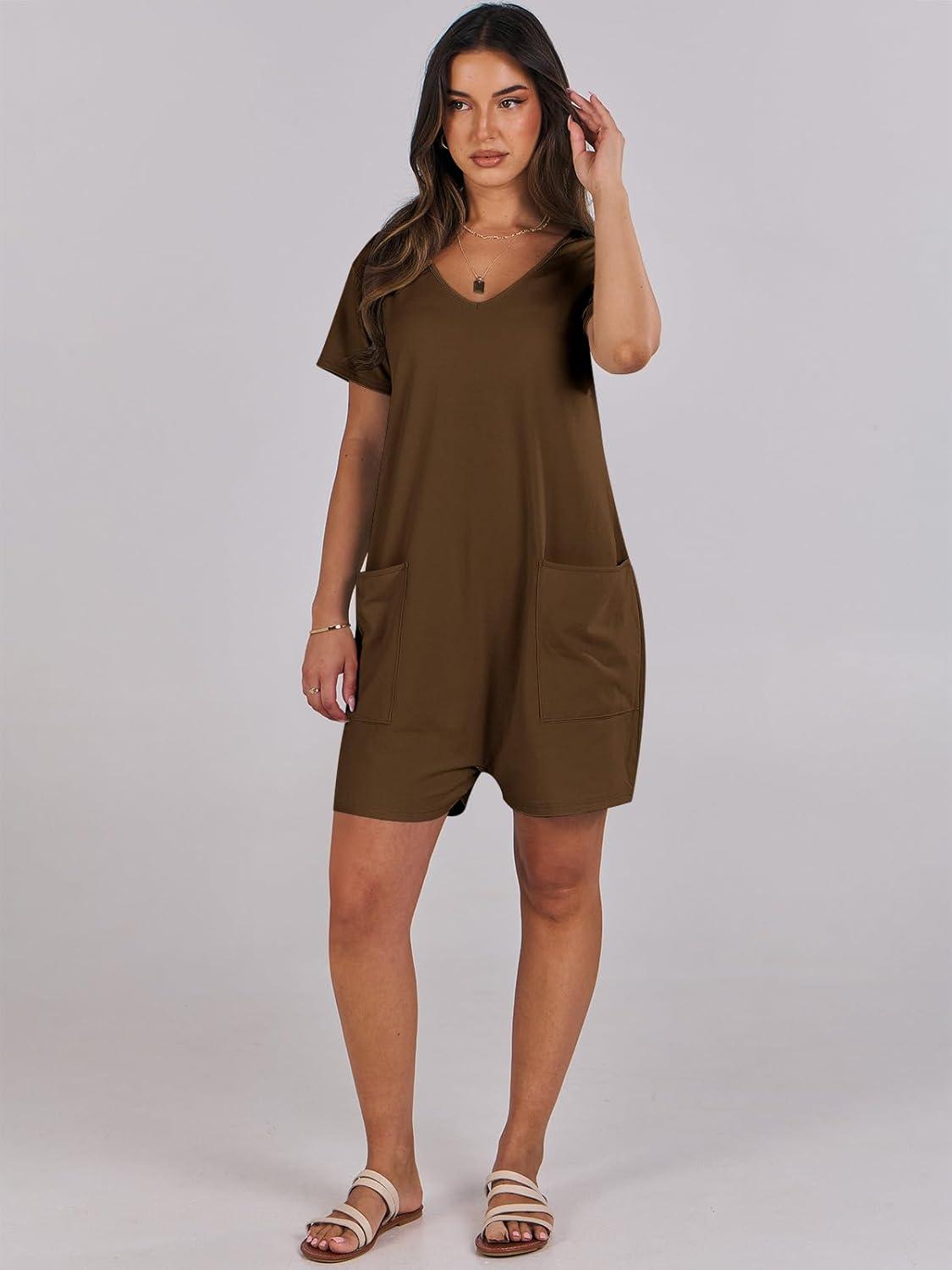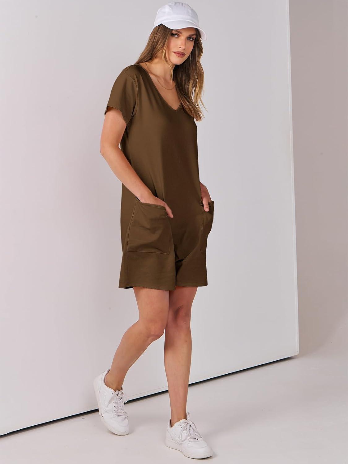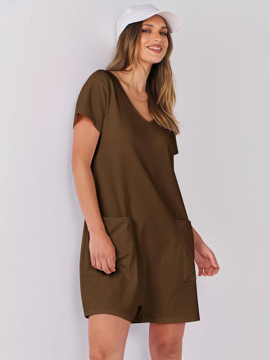 ANRABESS Rompers for Women Summer Casual Short Sleeve Jumpsuits V Neck Loose Fit One Piece Outfits with Pockets 2025 Clothes(Coffee)