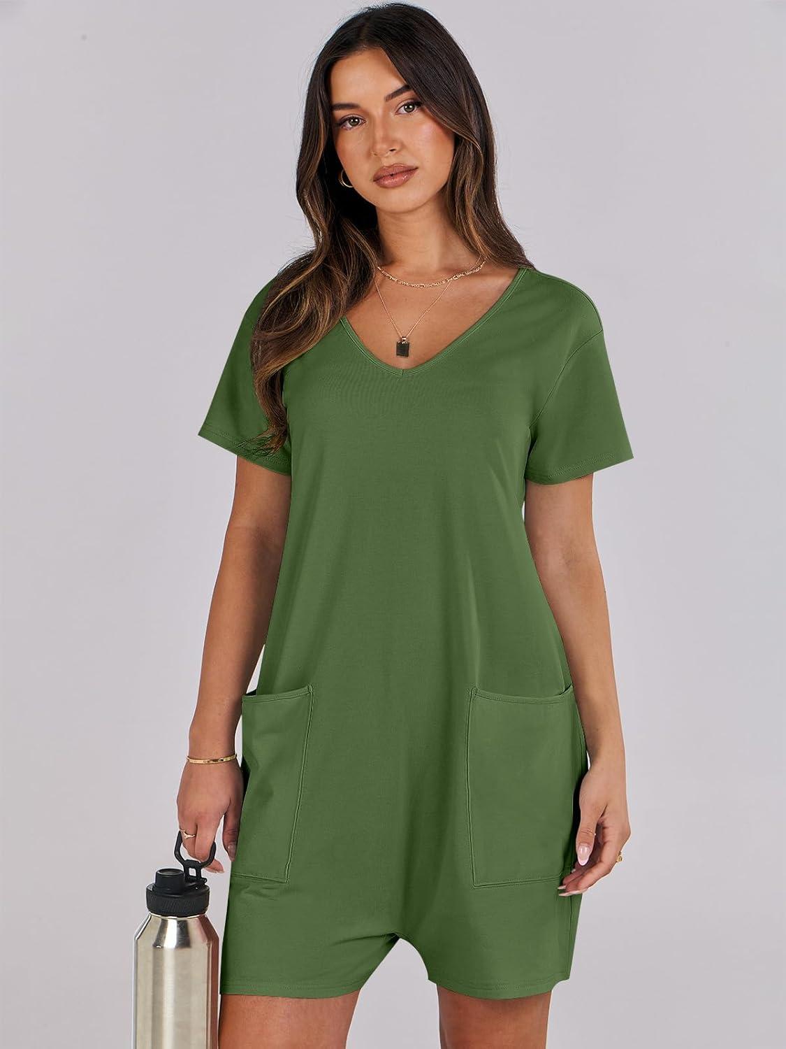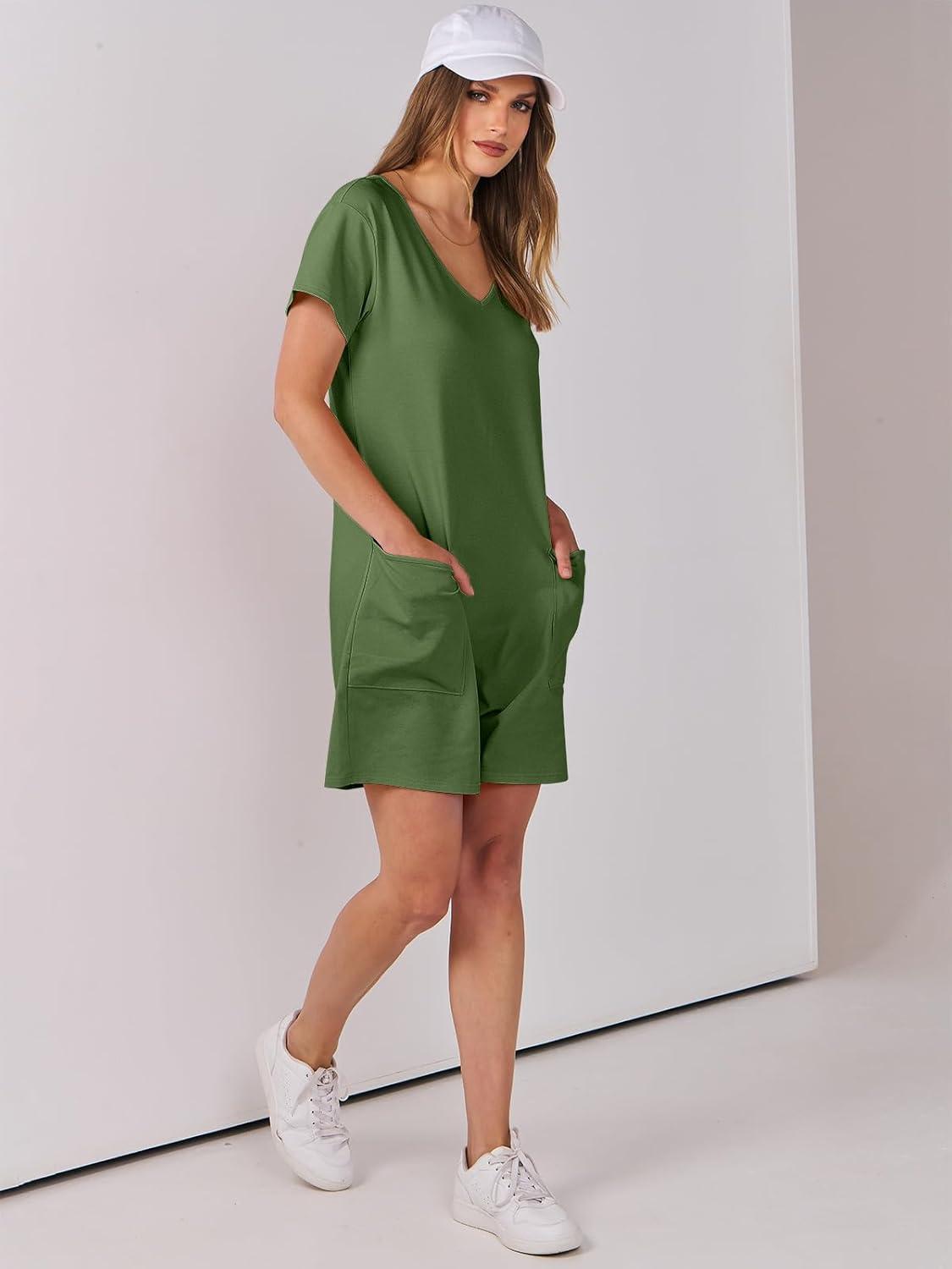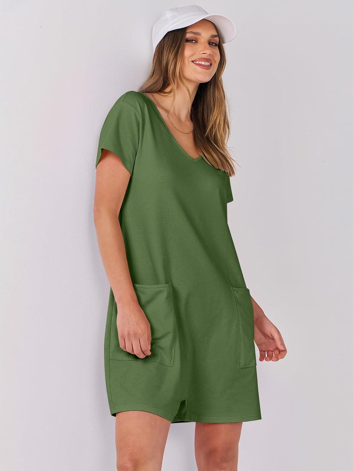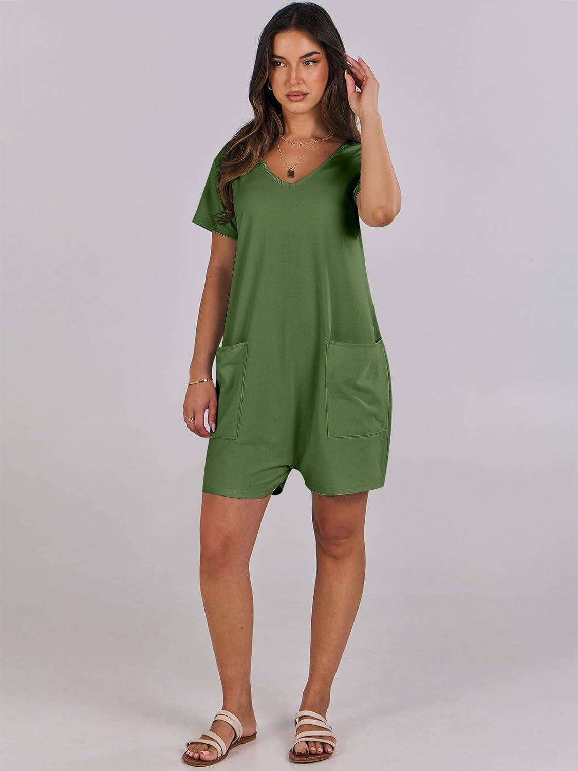 ANRABESS Rompers for Women Summer Casual Short Sleeve Jumpsuits V Neck Loose Fit One Piece Outfits with Pockets 2025 Clothes(Green)