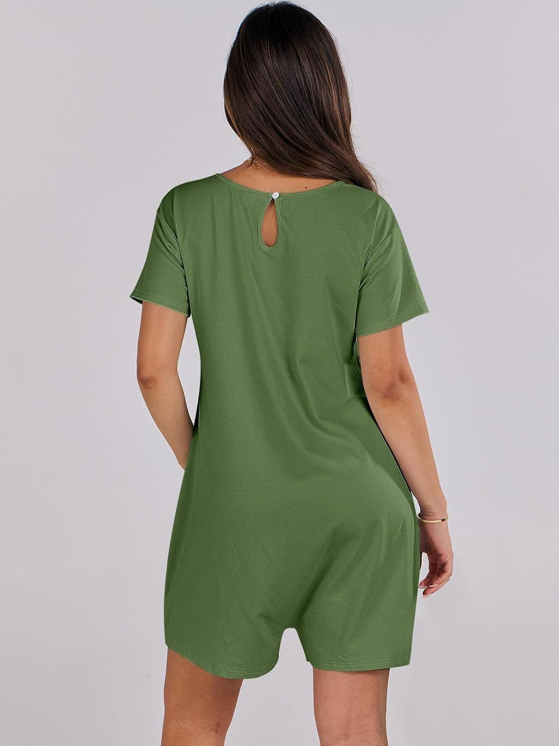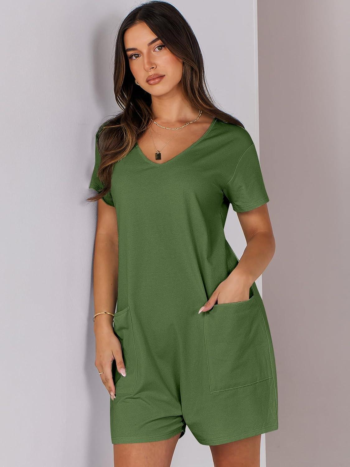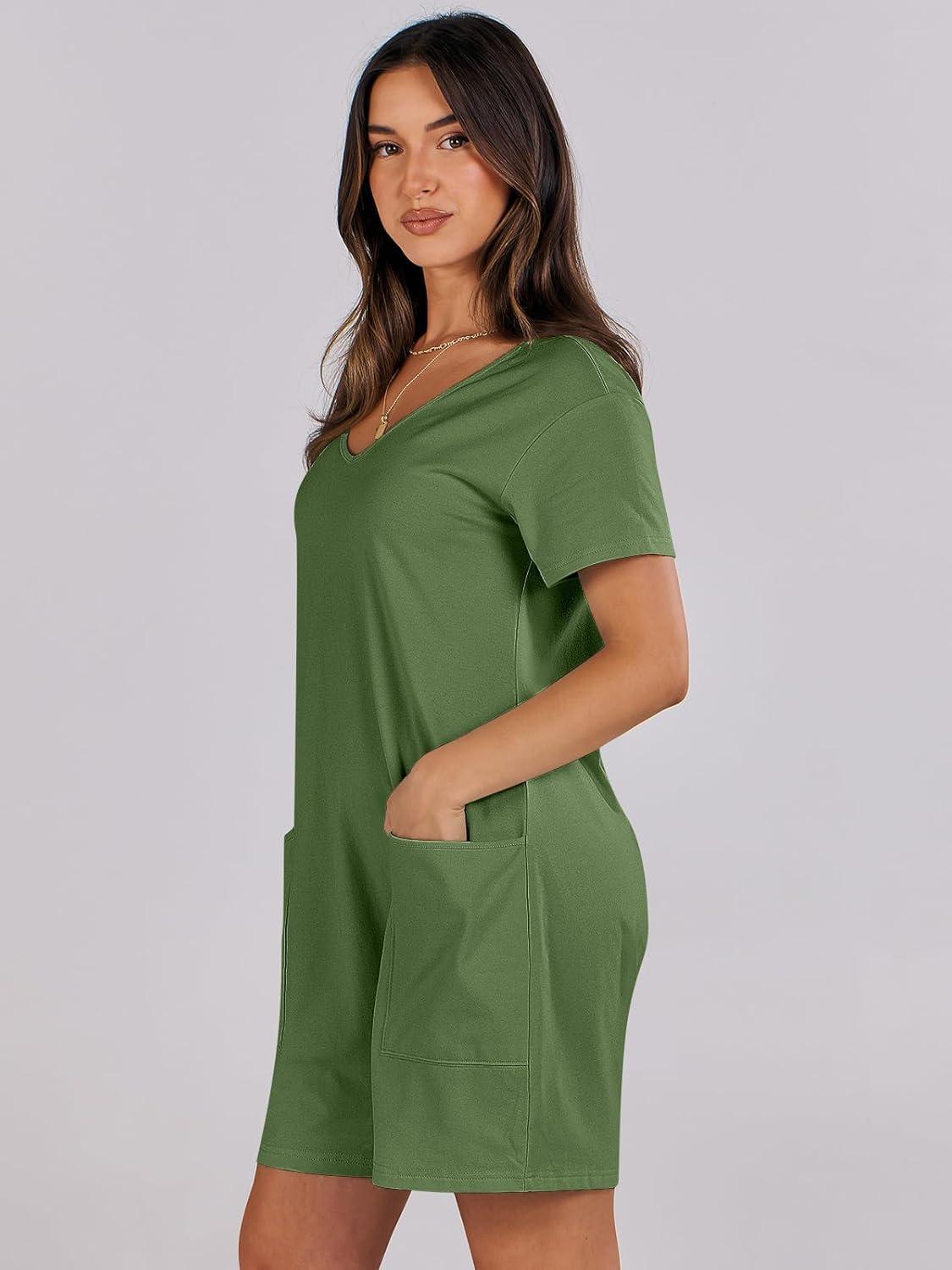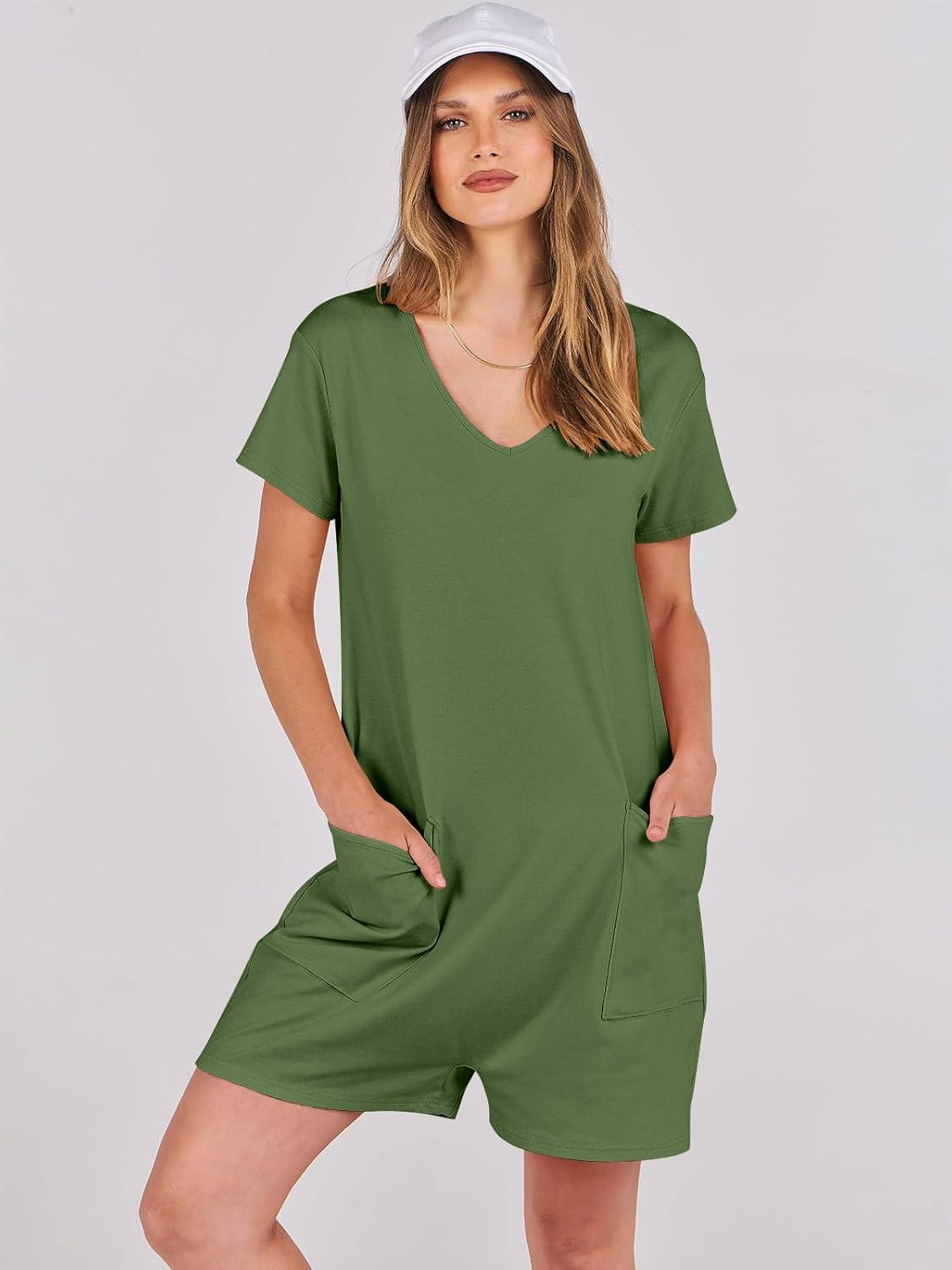 ANRABESS Rompers for Women Summer Casual Short Sleeve Jumpsuits V Neck Loose Fit One Piece Outfits with Pockets 2025 Clothes(Green)