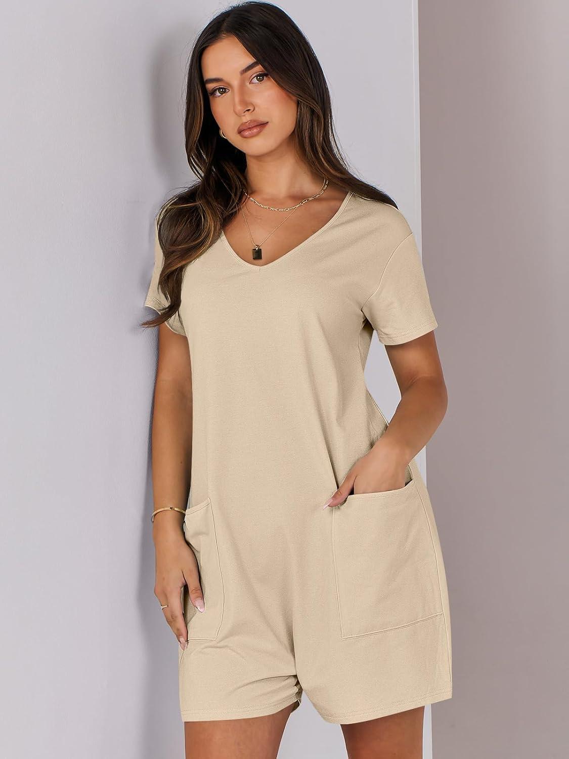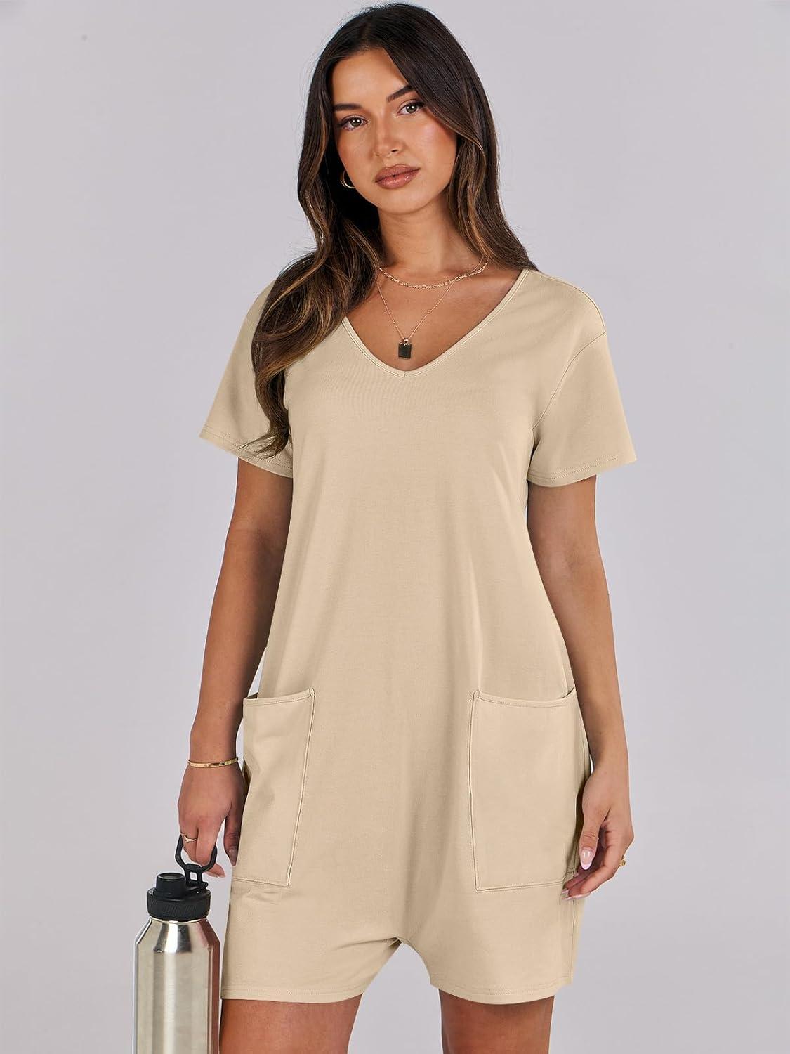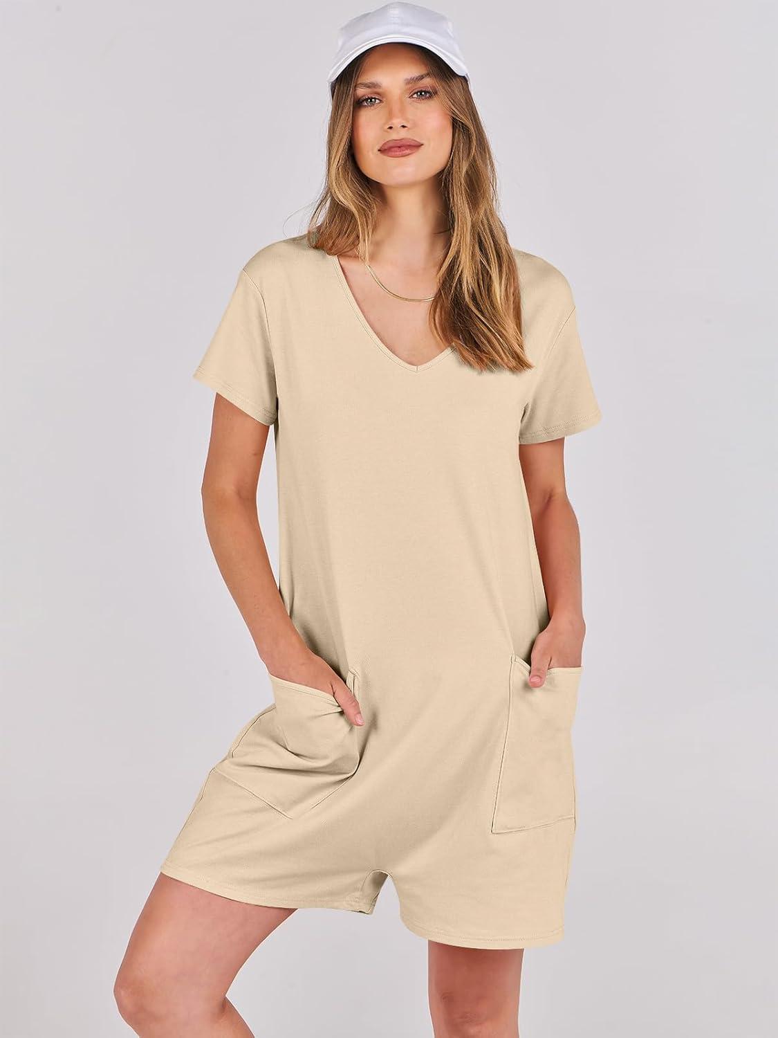 ANRABESS Rompers for Women Summer Casual Short Sleeve Jumpsuits V Neck Loose Fit One Piece Outfits with Pockets 2025 Clothes(Khaki)
