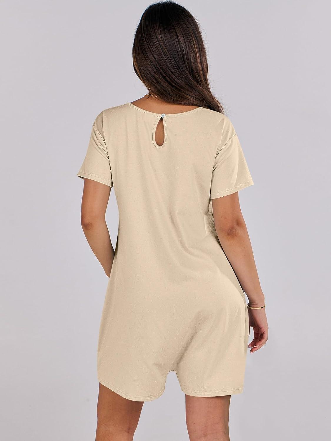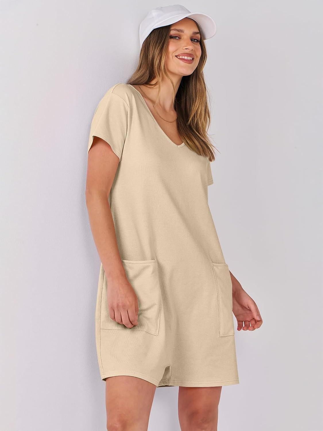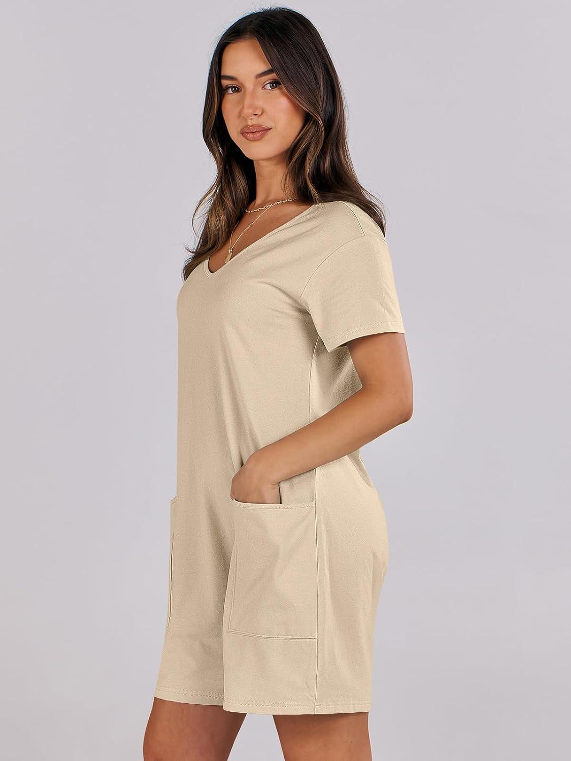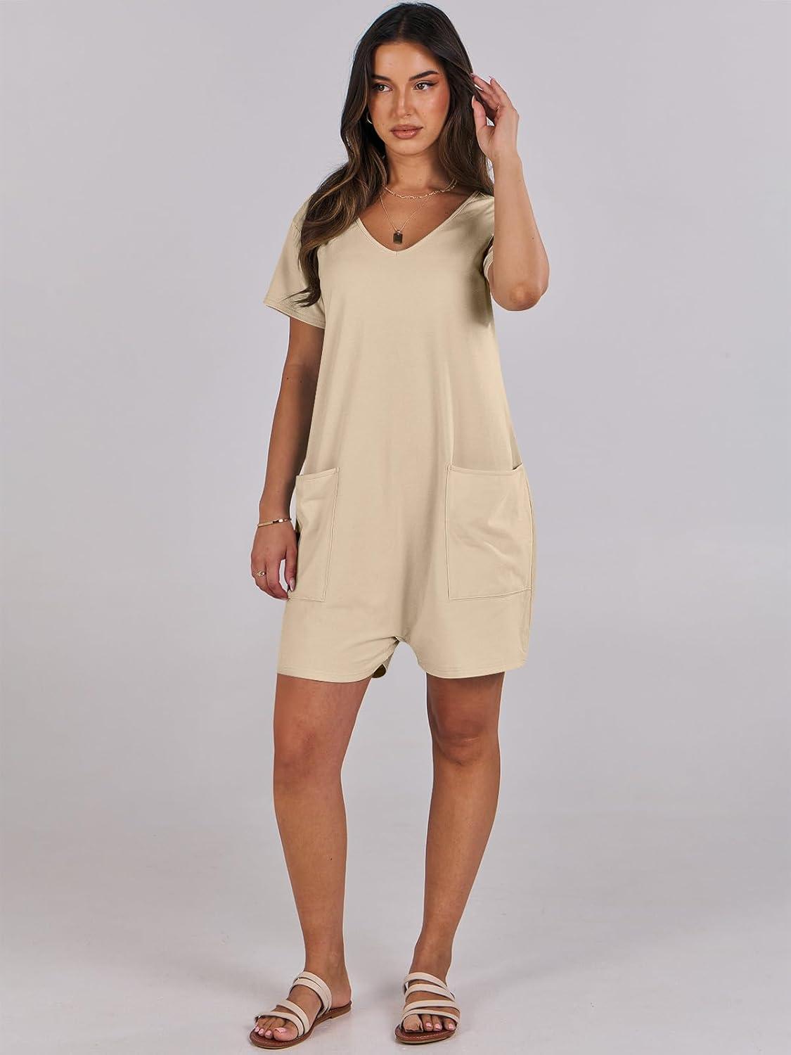 ANRABESS Rompers for Women Summer Casual Short Sleeve Jumpsuits V Neck Loose Fit One Piece Outfits with Pockets 2025 Clothes(Khaki)