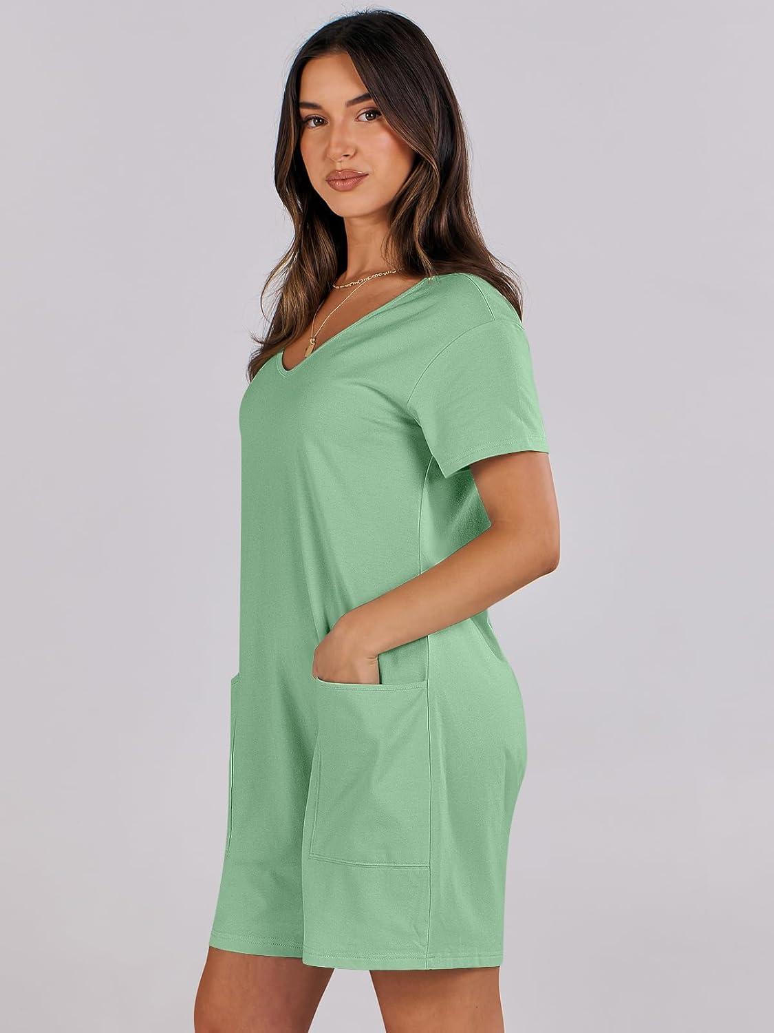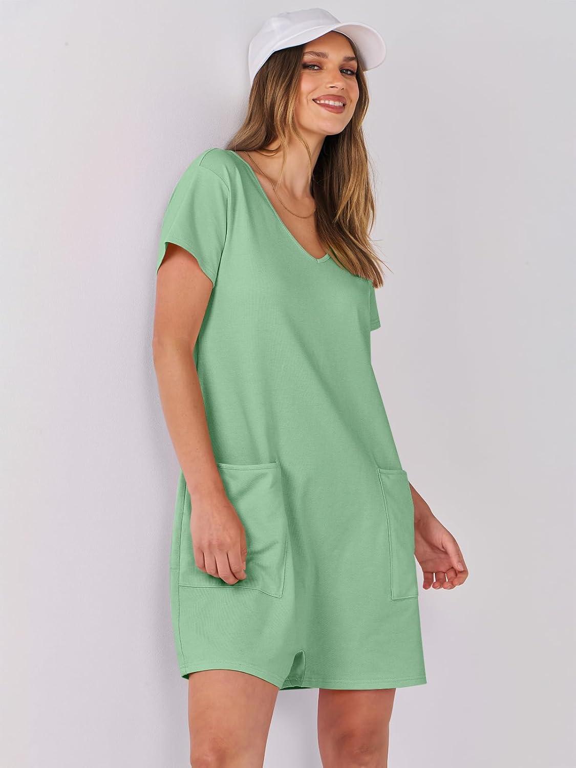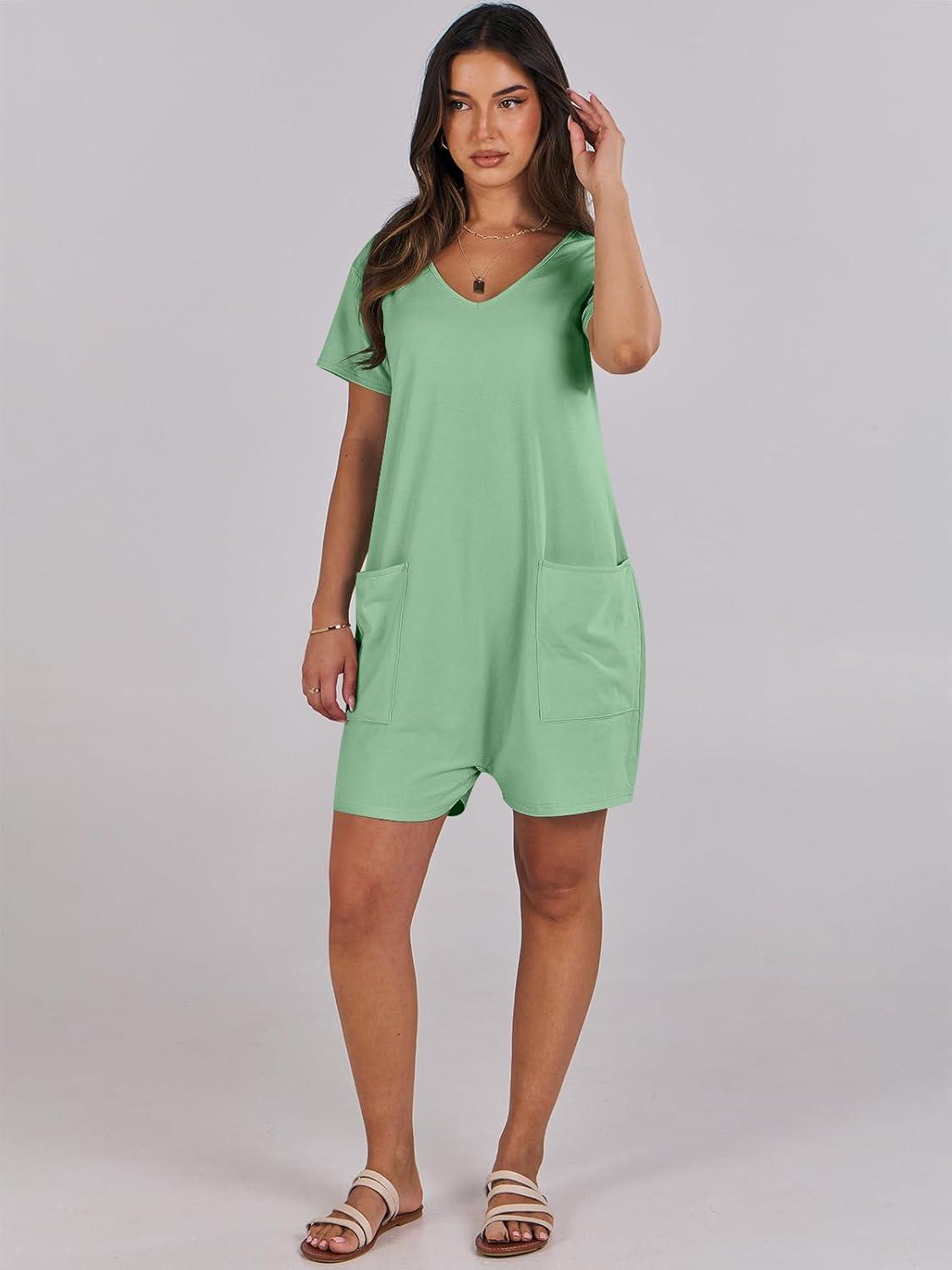ANRABESS Rompers for Women Summer Casual Short Sleeve Jumpsuits V Neck Loose Fit One Piece Outfits with Pockets 2025 Clothes(Light Green)