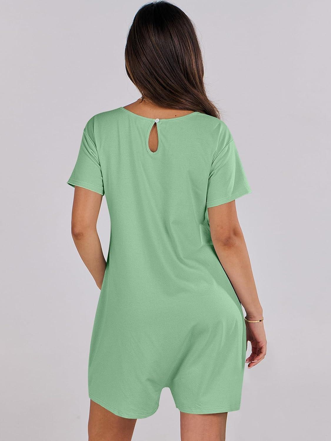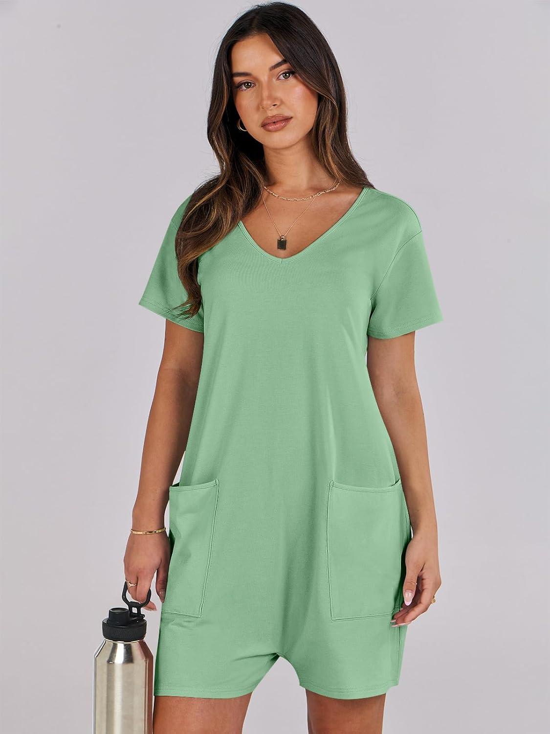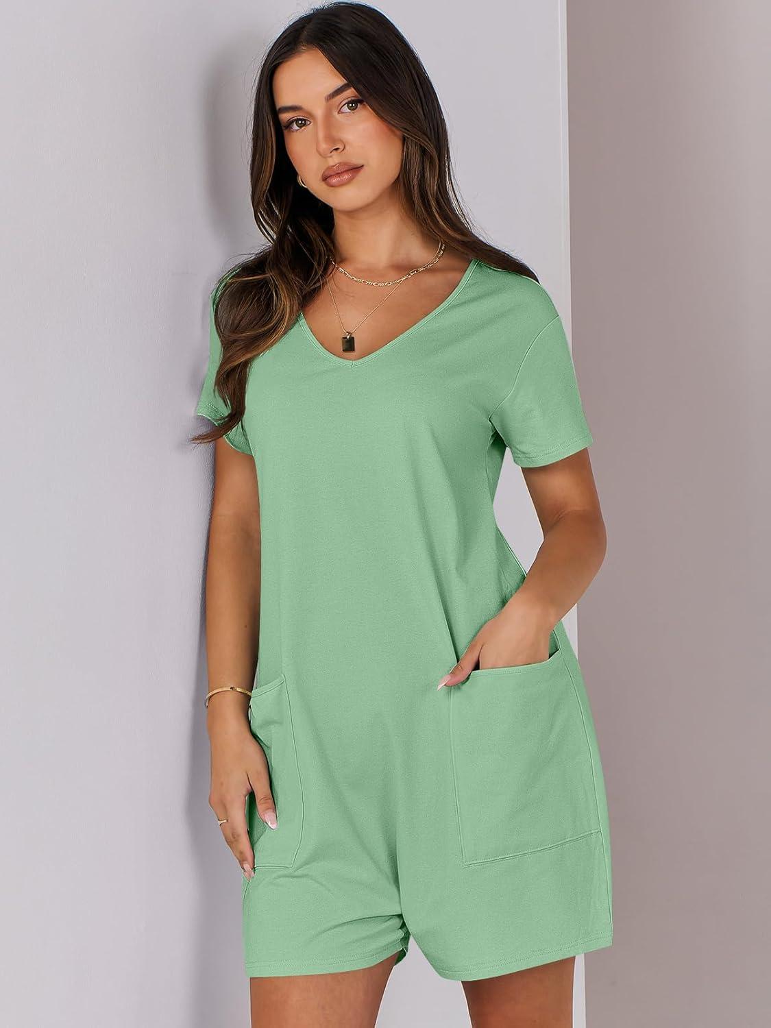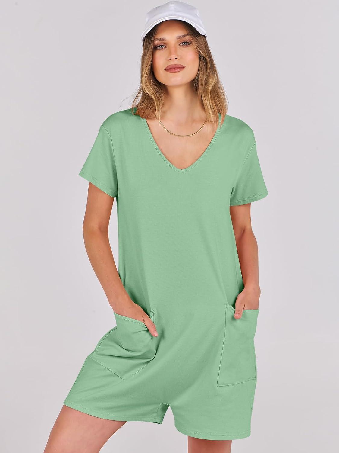 ANRABESS Rompers for Women Summer Casual Short Sleeve Jumpsuits V Neck Loose Fit One Piece Outfits with Pockets 2025 Clothes(Light Green)