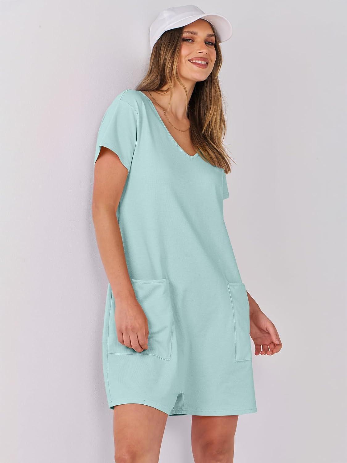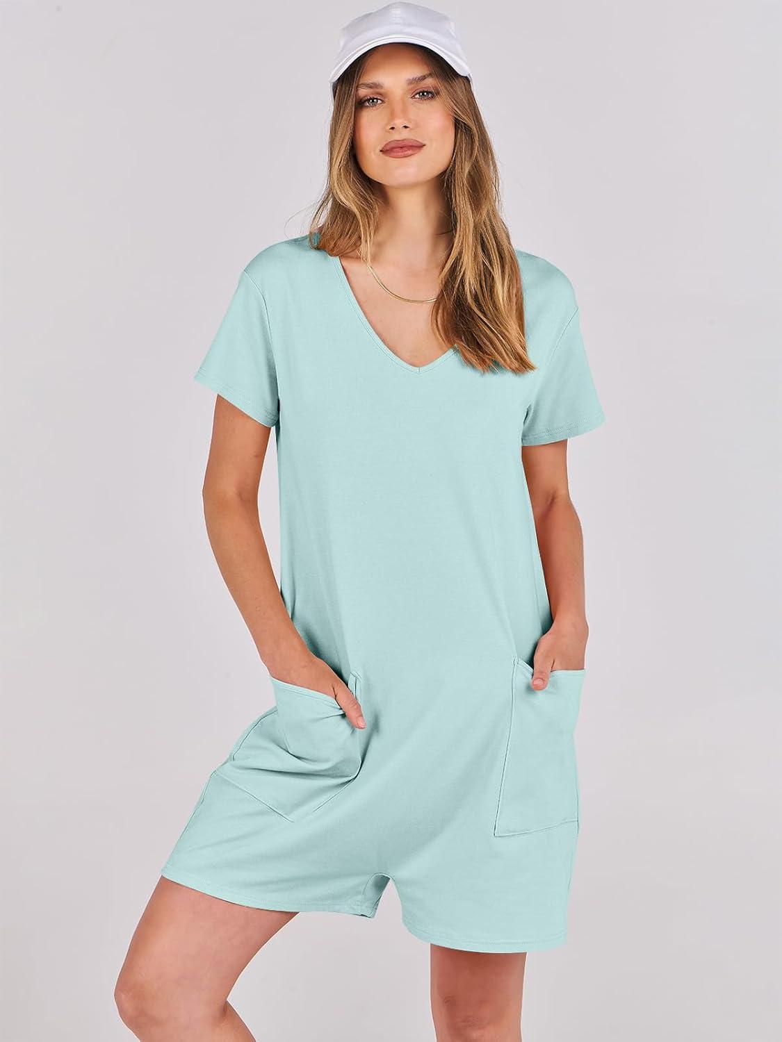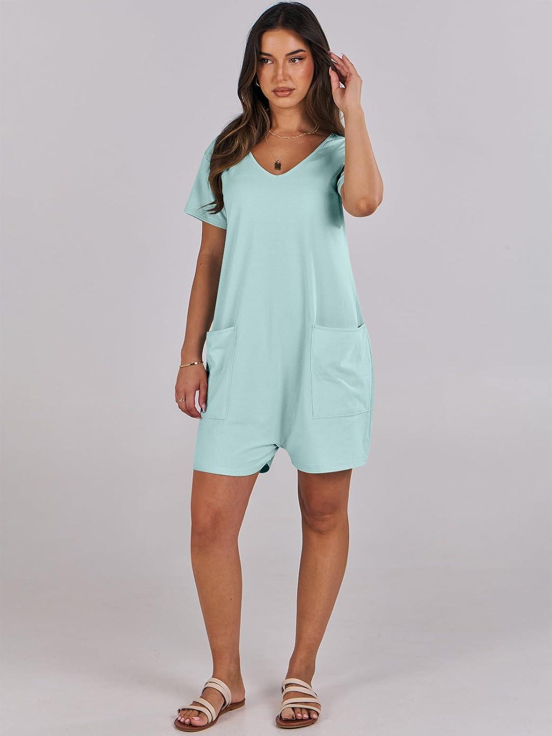 ANRABESS Rompers for Women Summer Casual Short Sleeve Jumpsuits V Neck Loose Fit One Piece Outfits with Pockets 2025 Clothes(Mint Green)