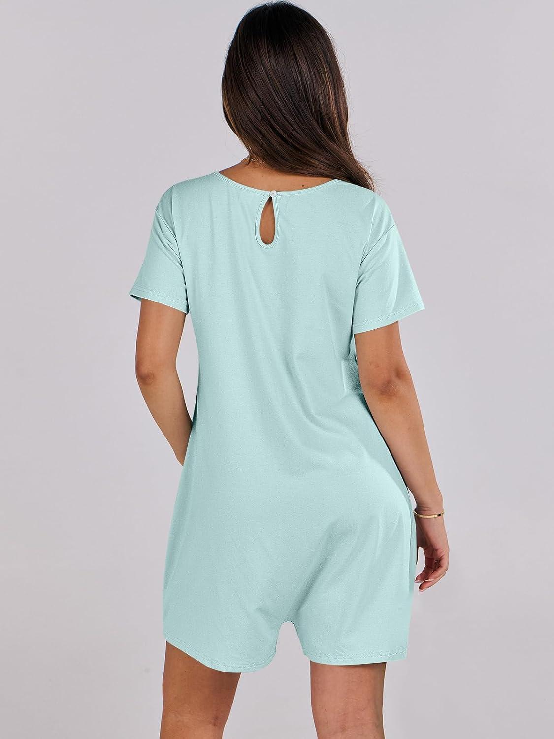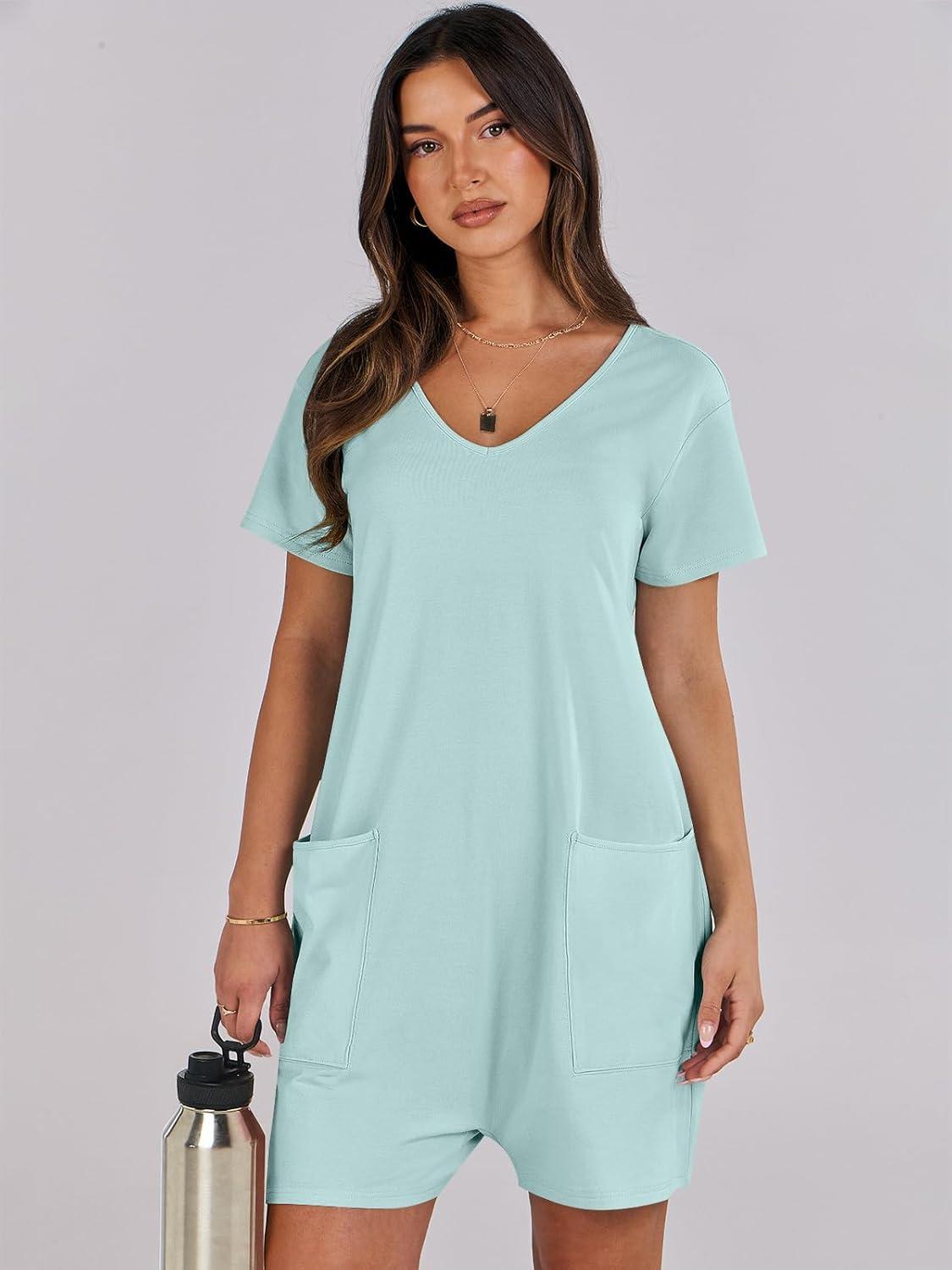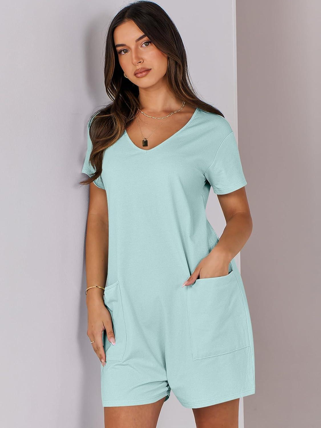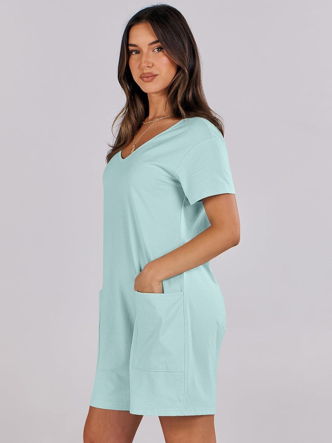 ANRABESS Rompers for Women Summer Casual Short Sleeve Jumpsuits V Neck Loose Fit One Piece Outfits with Pockets 2025 Clothes(Mint Green)