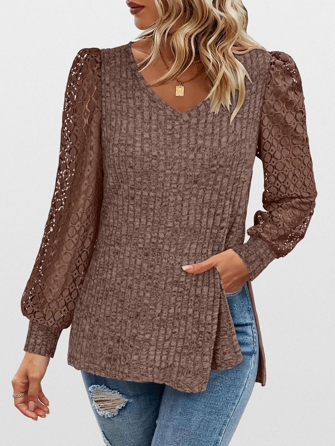 ANRABESS Shirts for Women Lace Long Sleeve V Neck Tunic Tops Casual Loose Fit Blouses Lightweight Sweaters 2025 Fall Clothes(Brown)