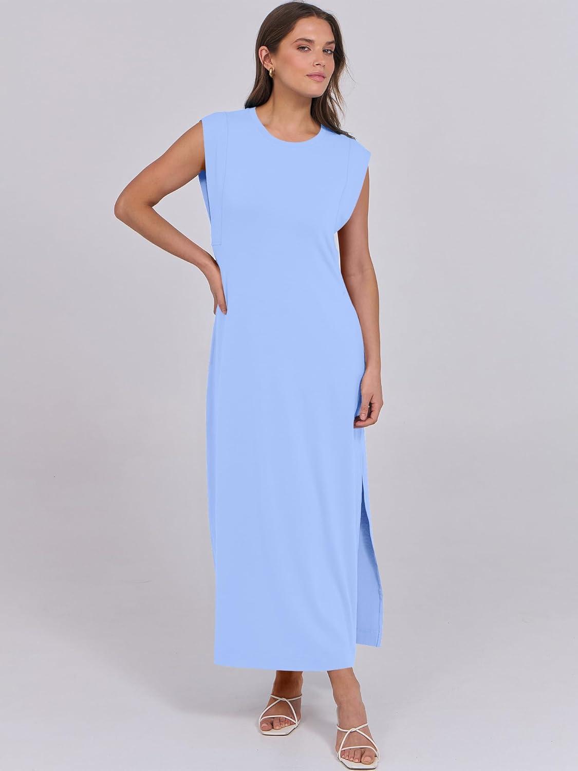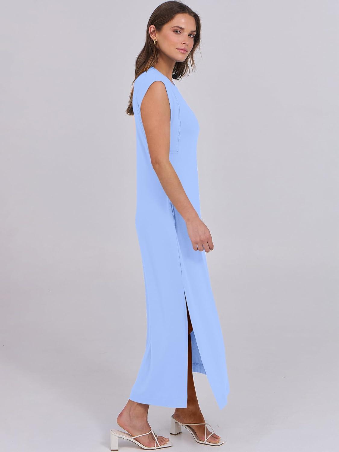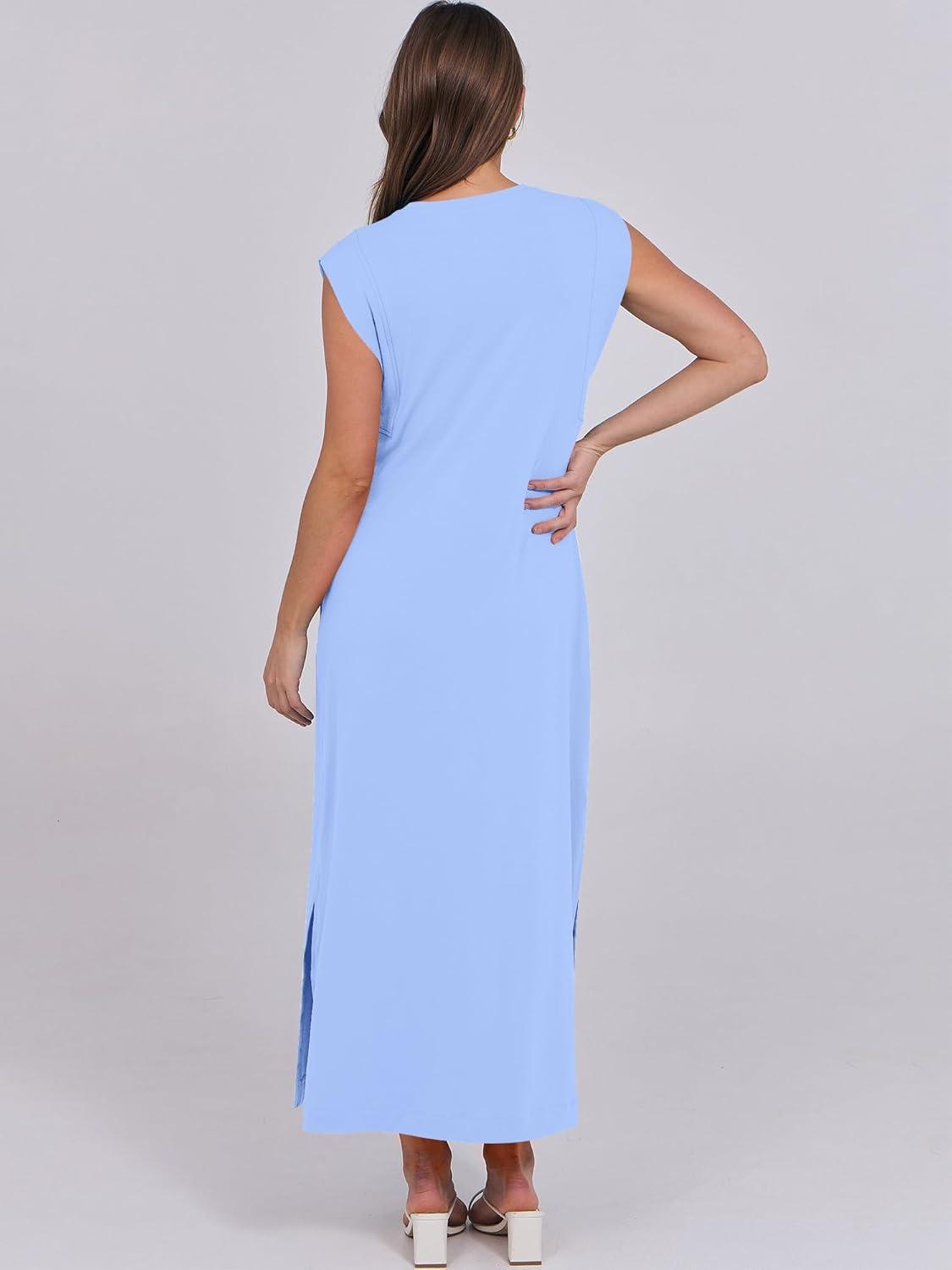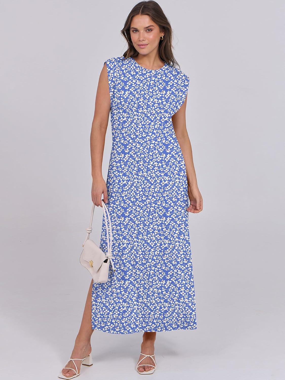 ANRABESS Summer Dress for Women 2025 Maxi Sundresses Casual Cap Sleeve Crew Neck Loose Split Beach Travel Vacation Outfits(Floral Blue White)