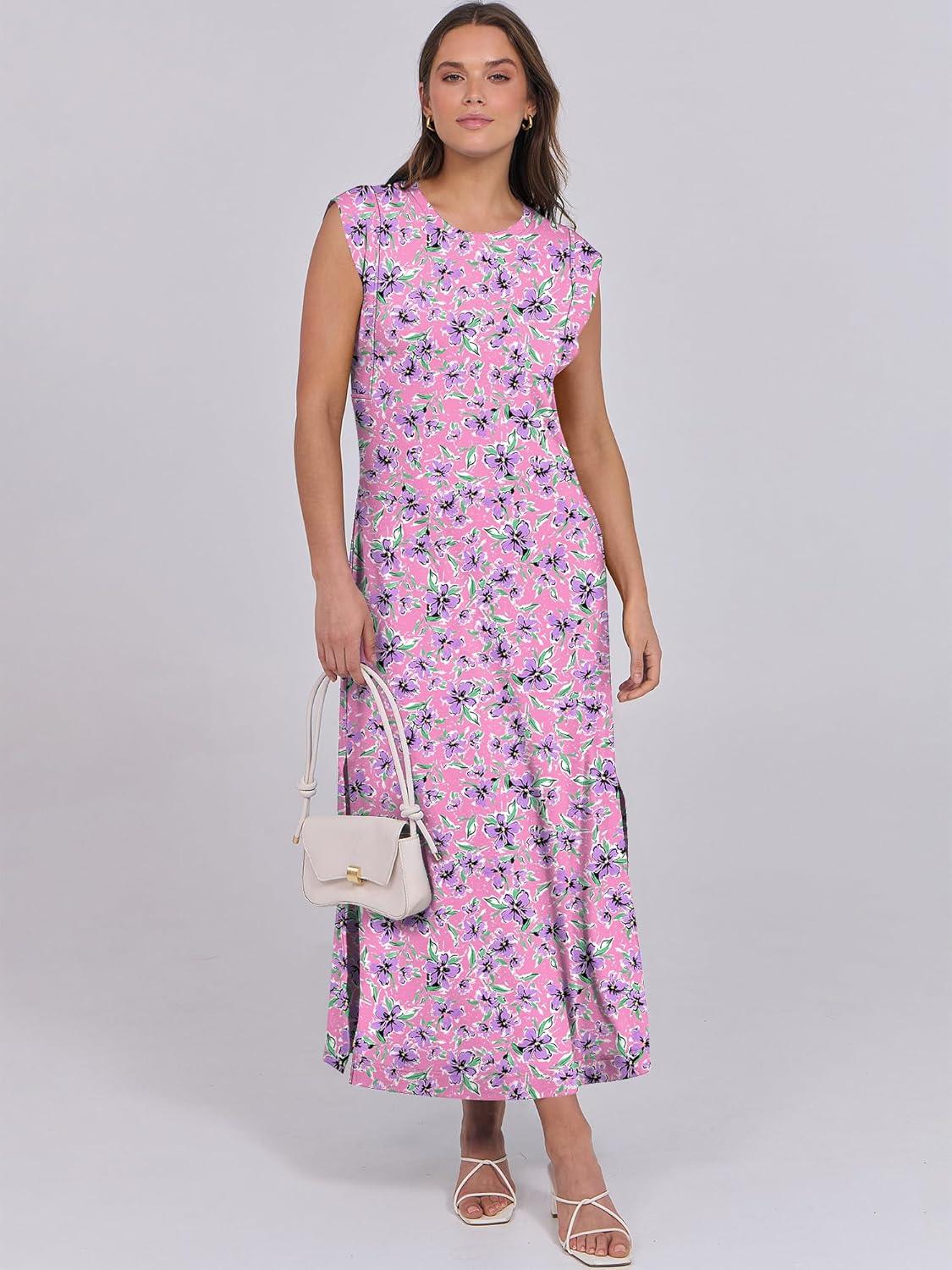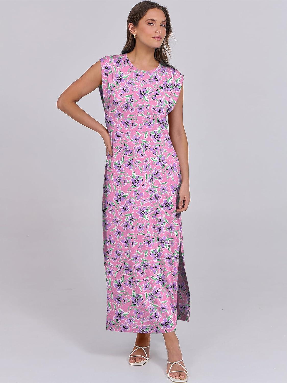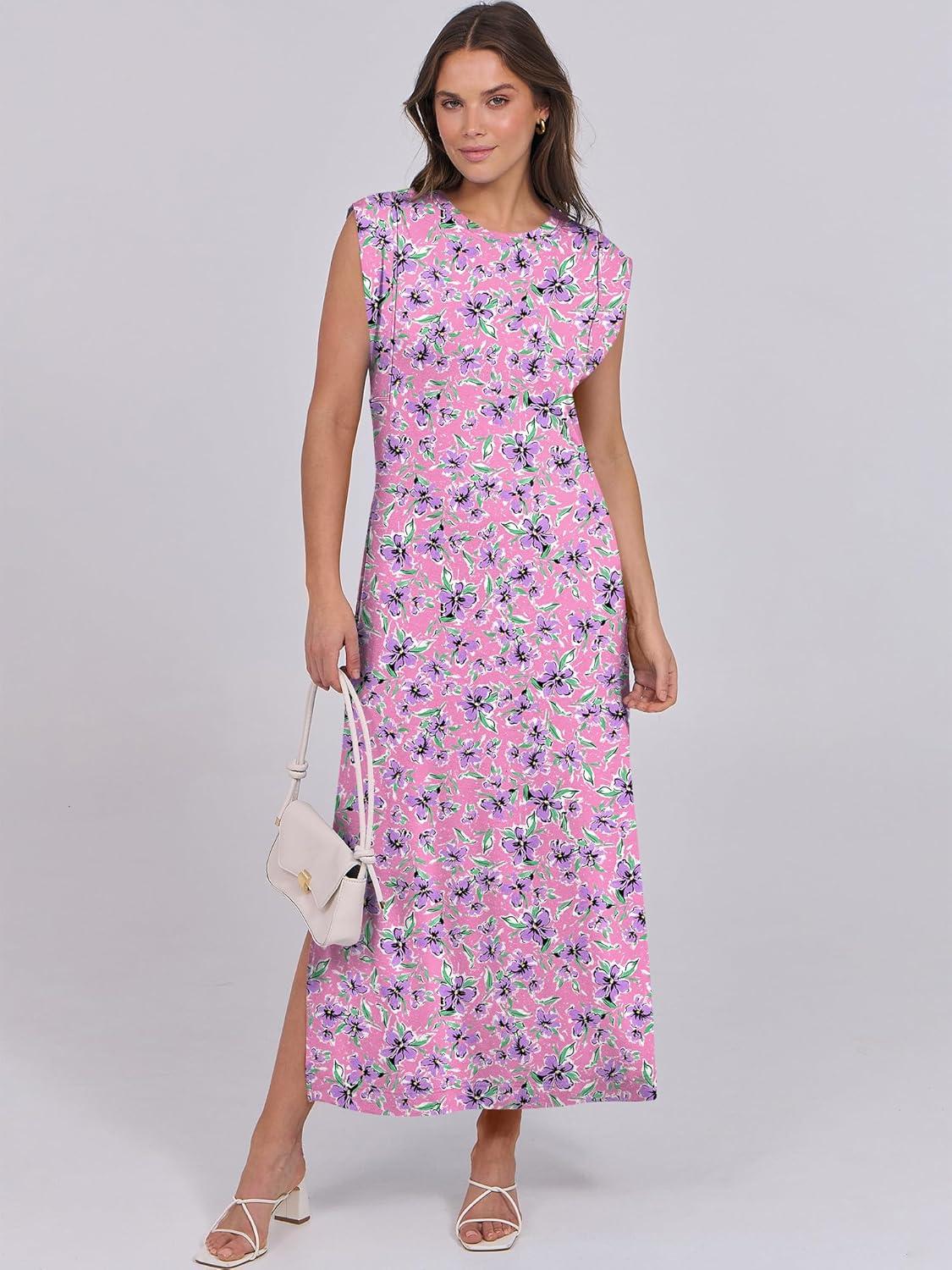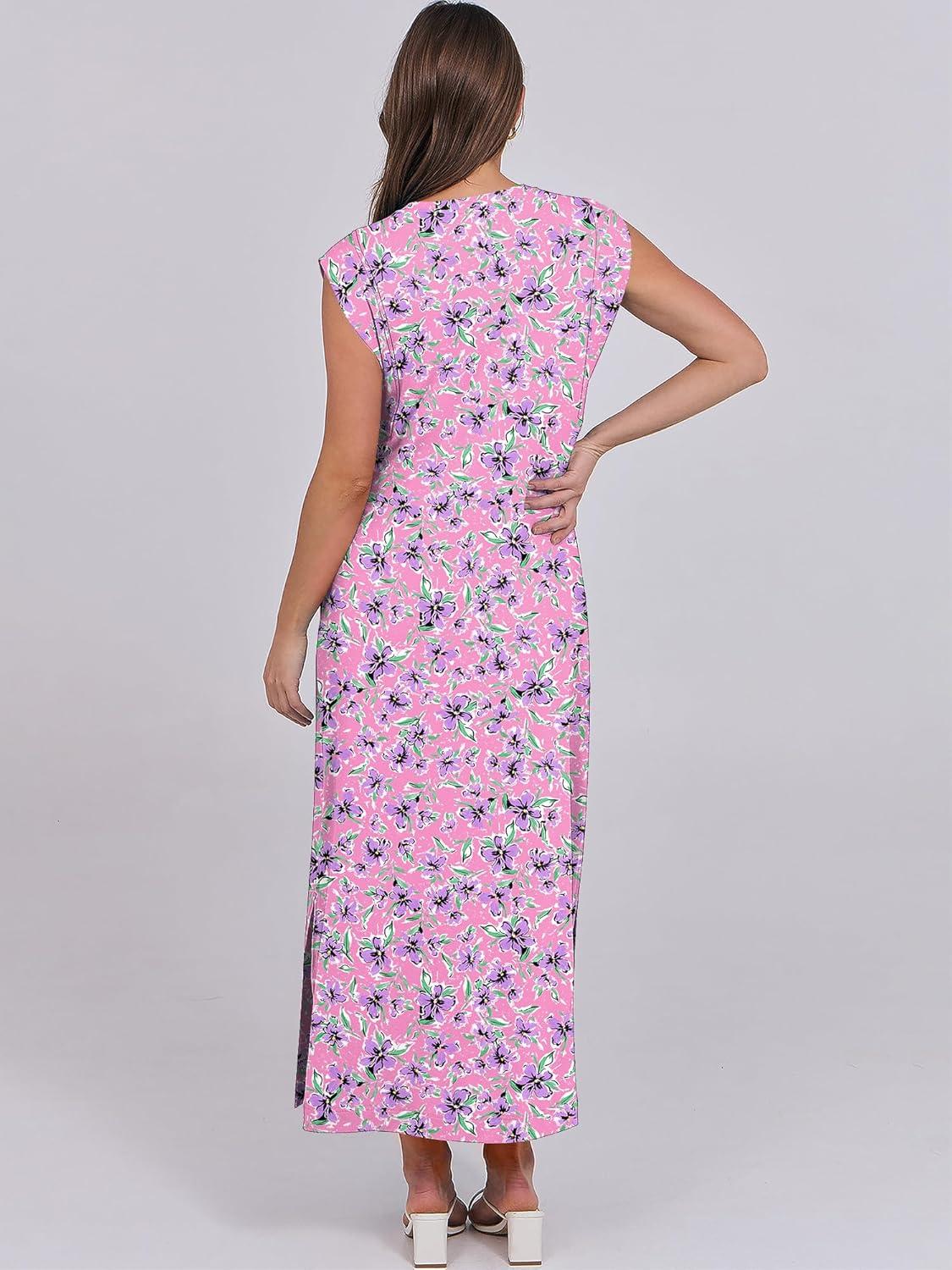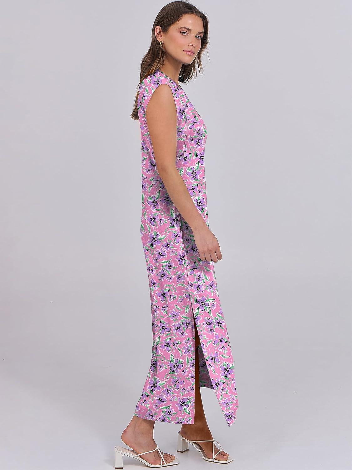 ANRABESS Summer Dress for Women 2025 Maxi Sundresses Casual Cap Sleeve Crew Neck Loose Split Beach Travel Vacation Outfits(Floral Purple Pink)