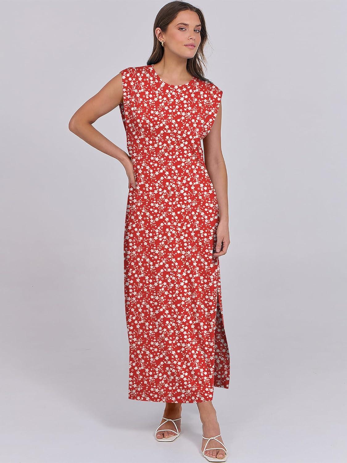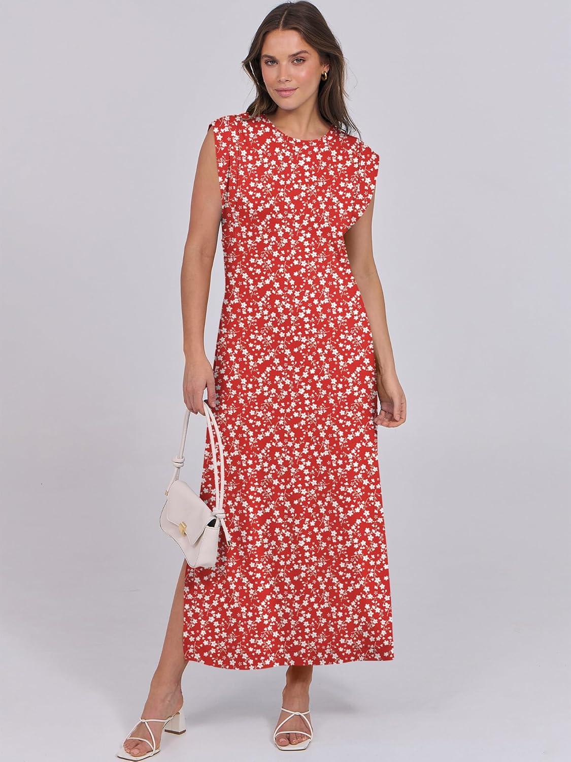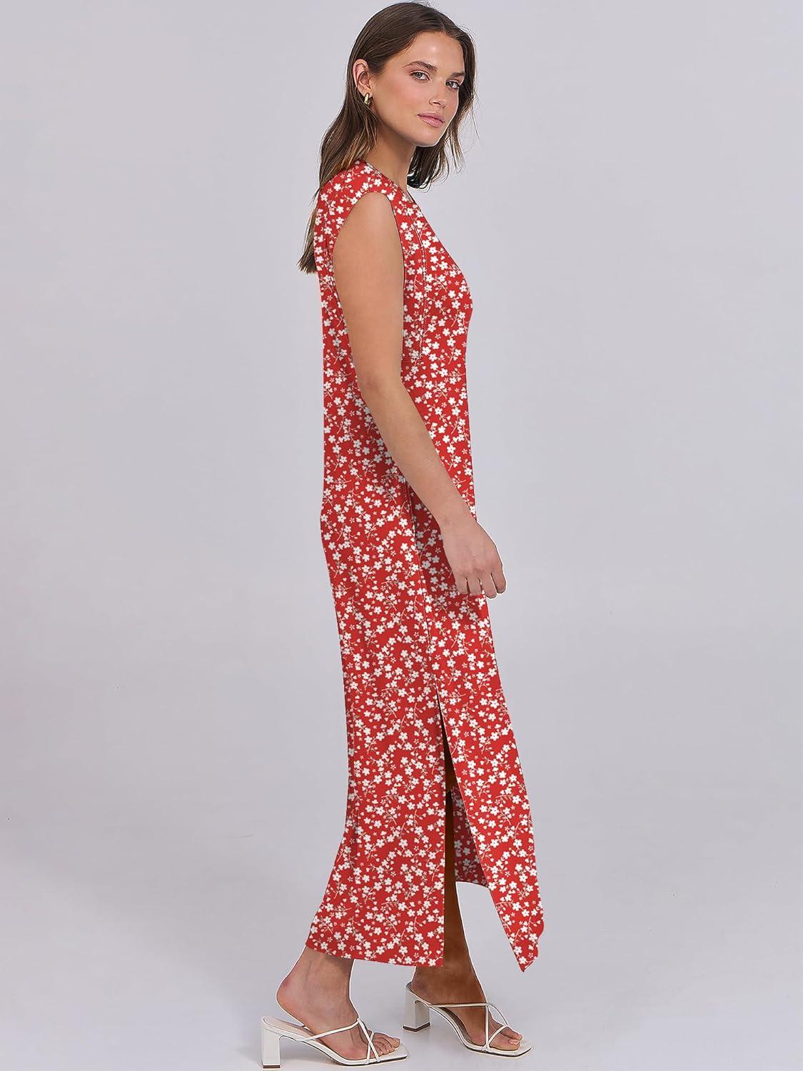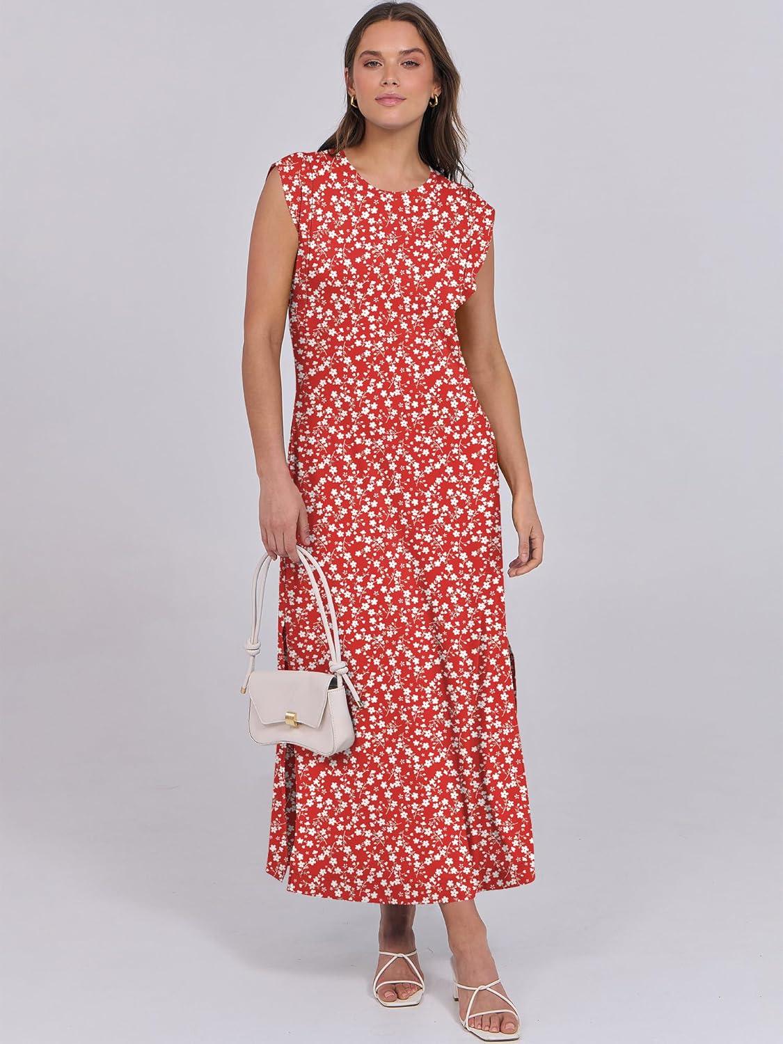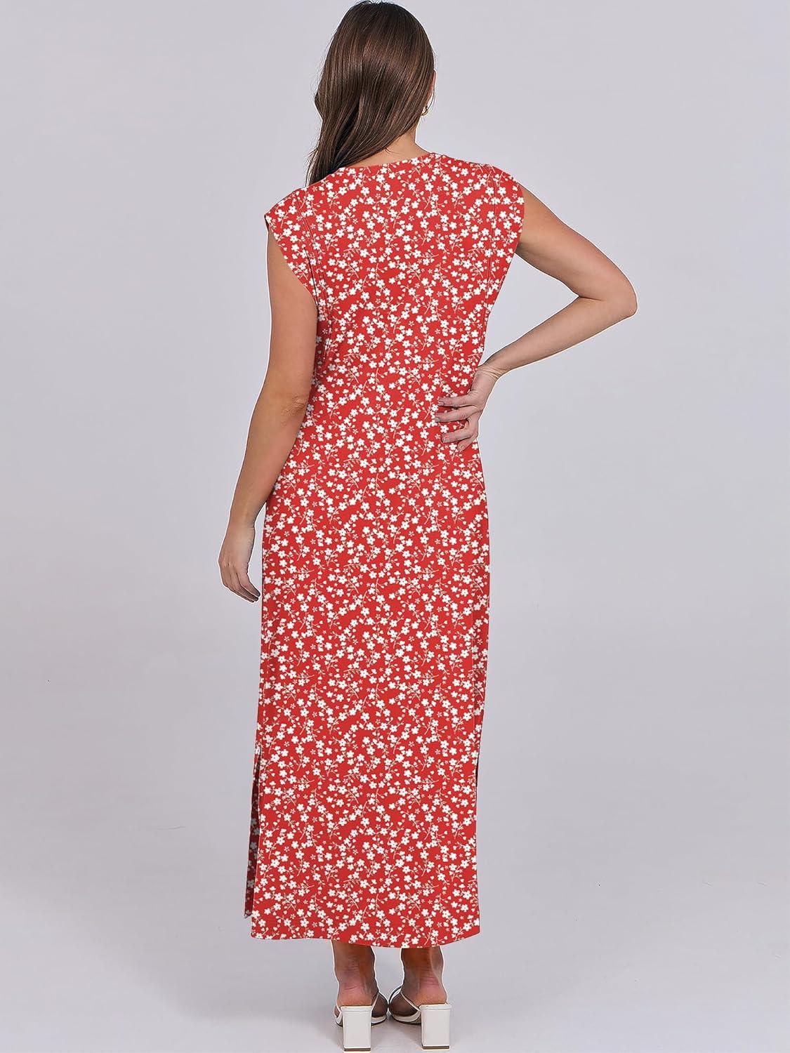 ANRABESS Summer Dress for Women 2025 Maxi Sundresses Casual Cap Sleeve Crew Neck Loose Split Beach Travel Vacation Outfits(Floral Red)