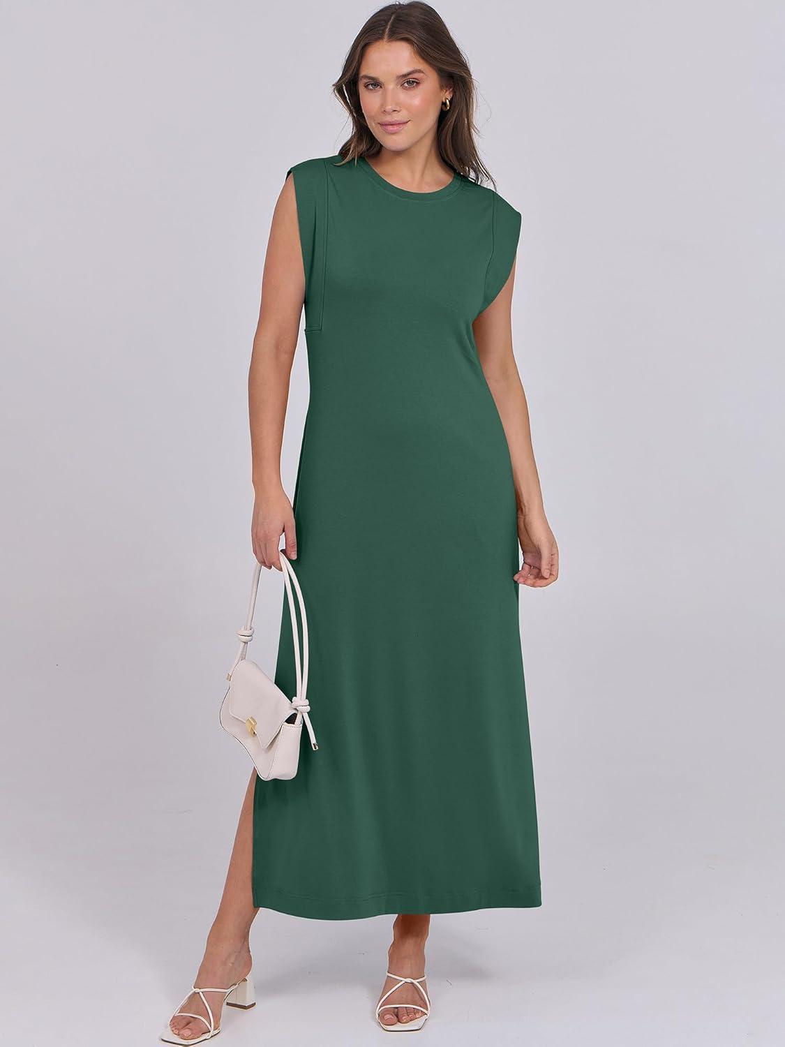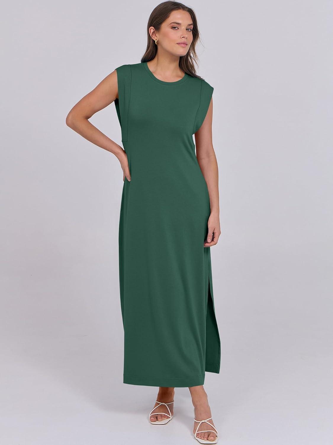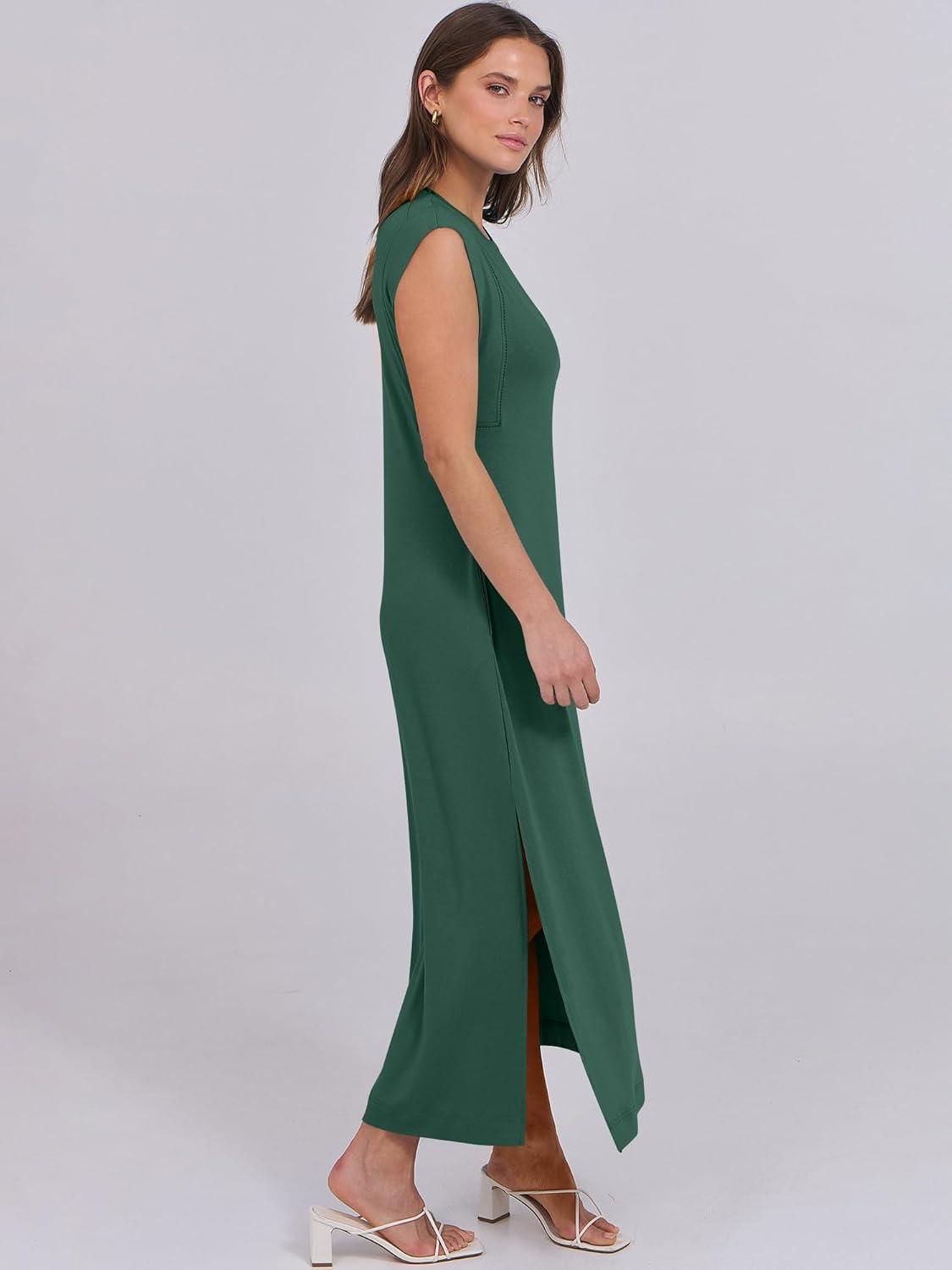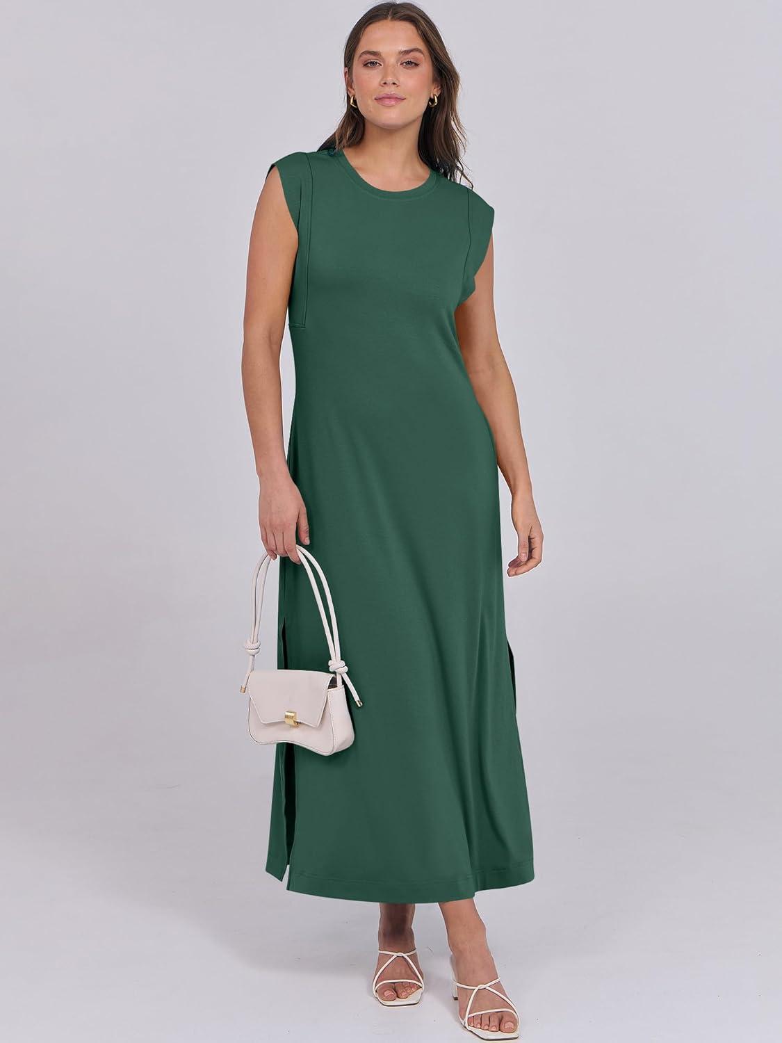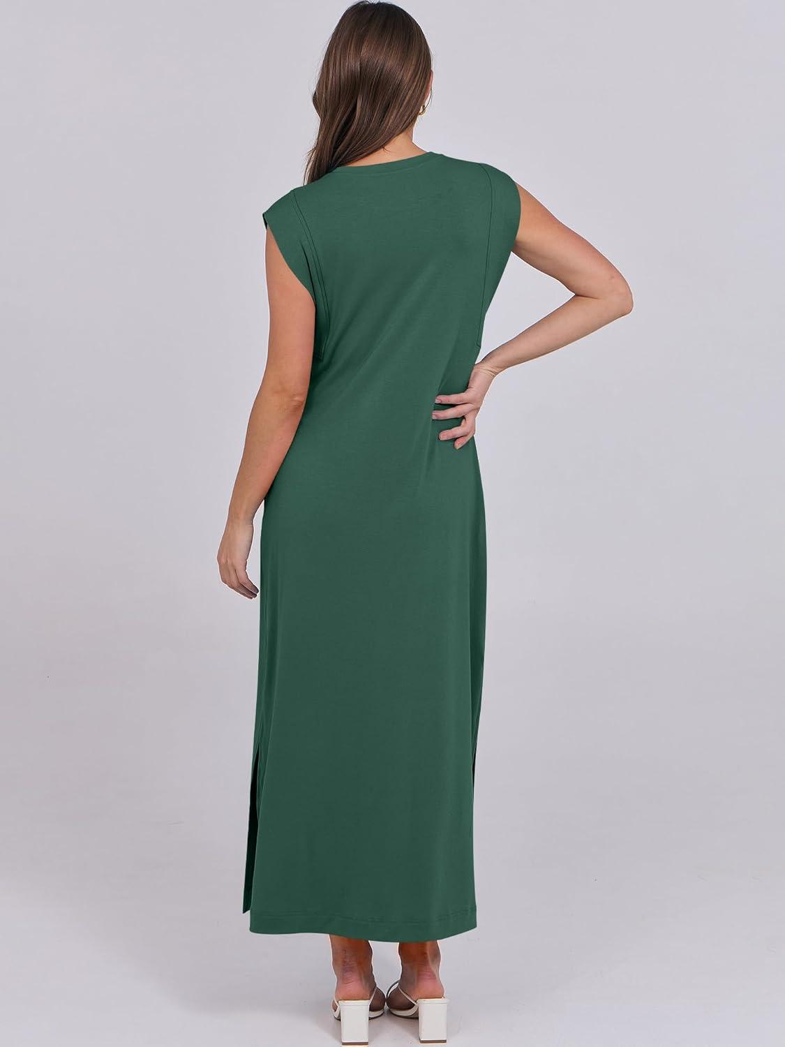 ANRABESS Summer Dress for Women 2025 Maxi Sundresses Casual Cap Sleeve Crew Neck Loose Split Beach Travel Vacation Outfits(Forest Green)
