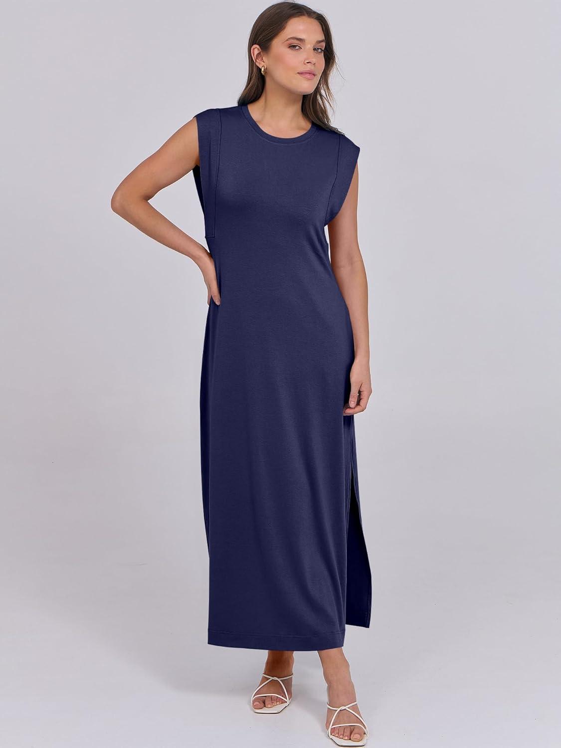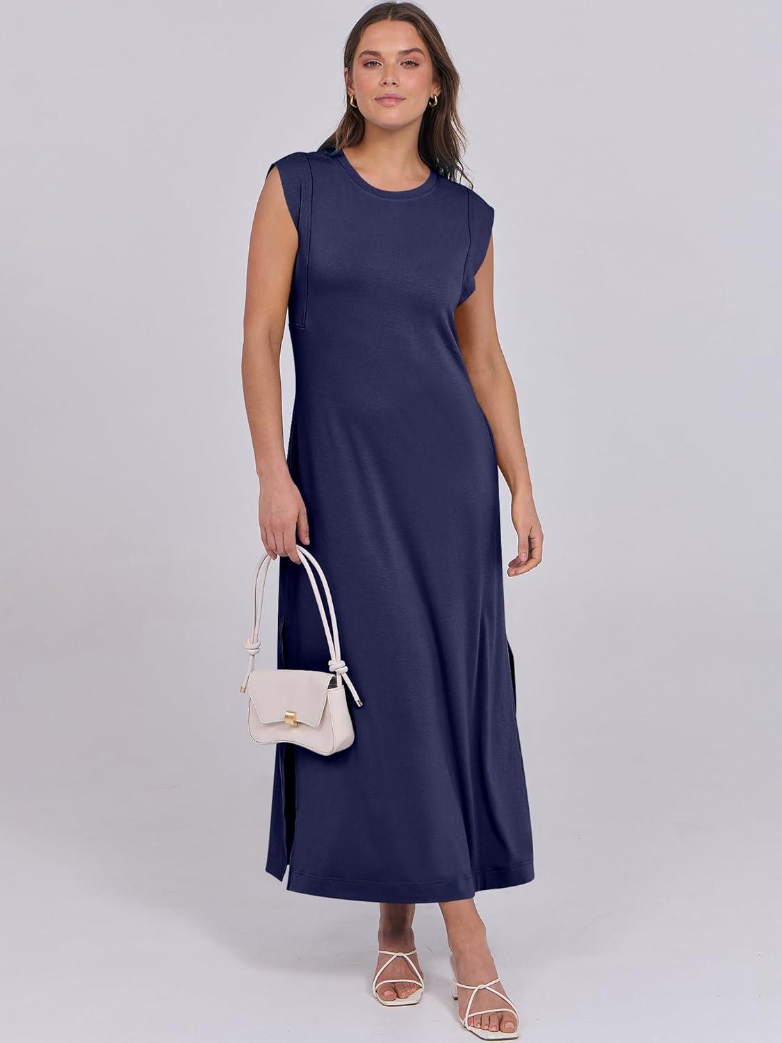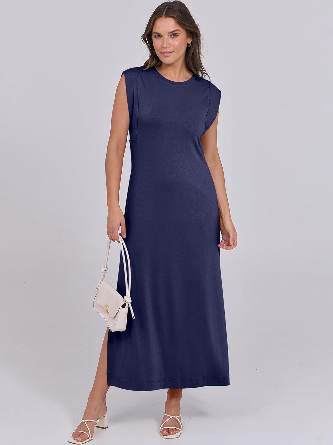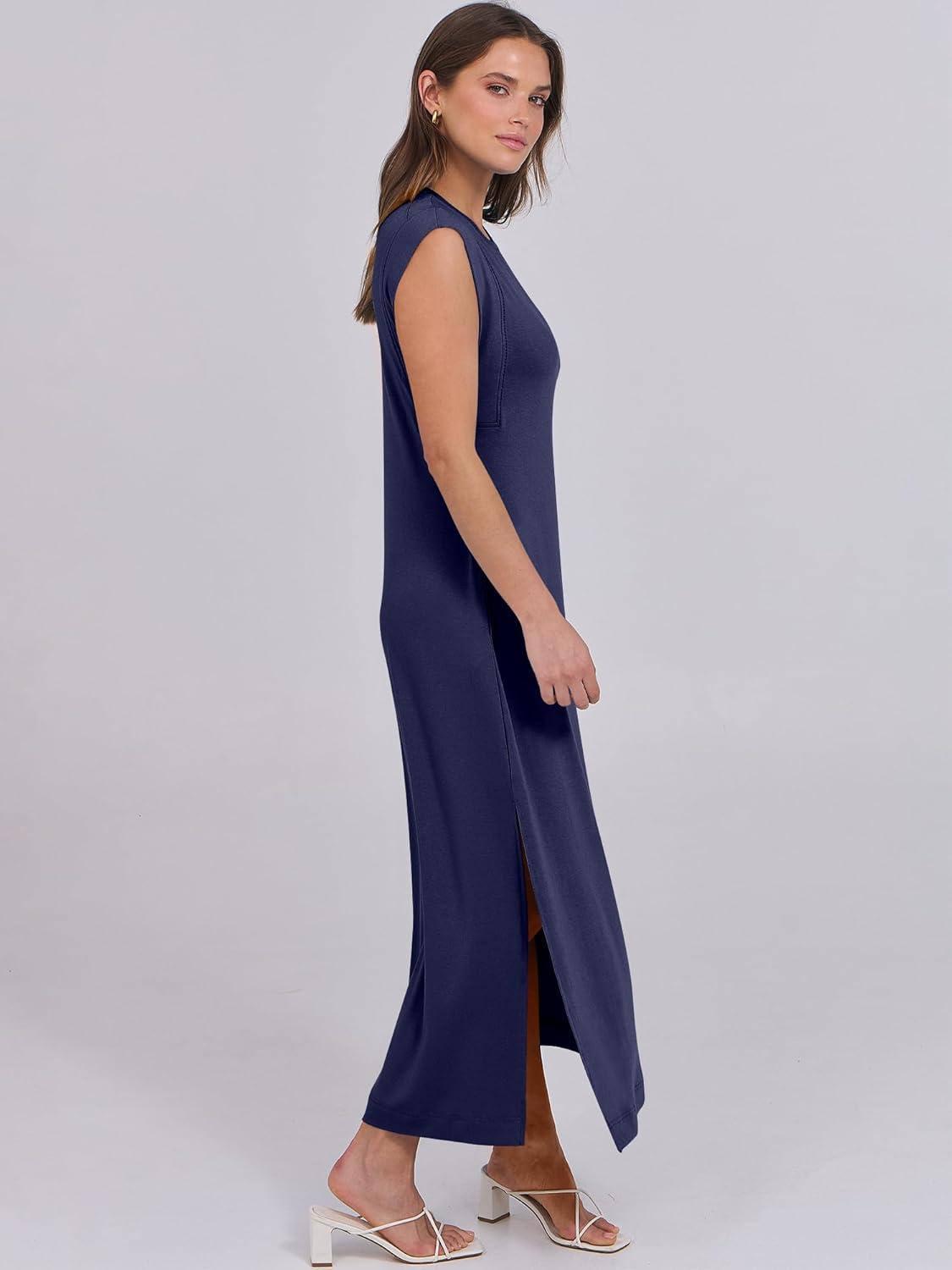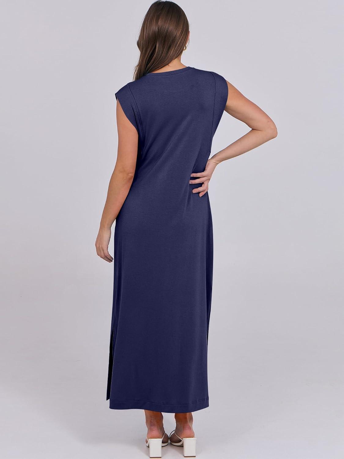 ANRABESS Summer Dress for Women 2025 Maxi Sundresses Casual Cap Sleeve Crew Neck Loose Split Beach Travel Vacation Outfits(Navy Blue)