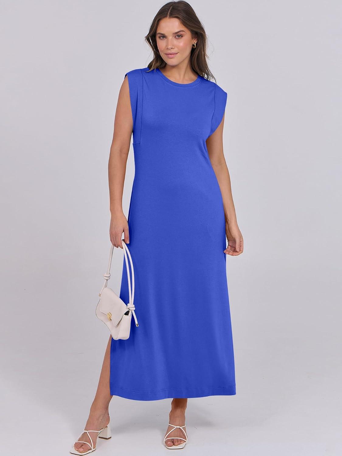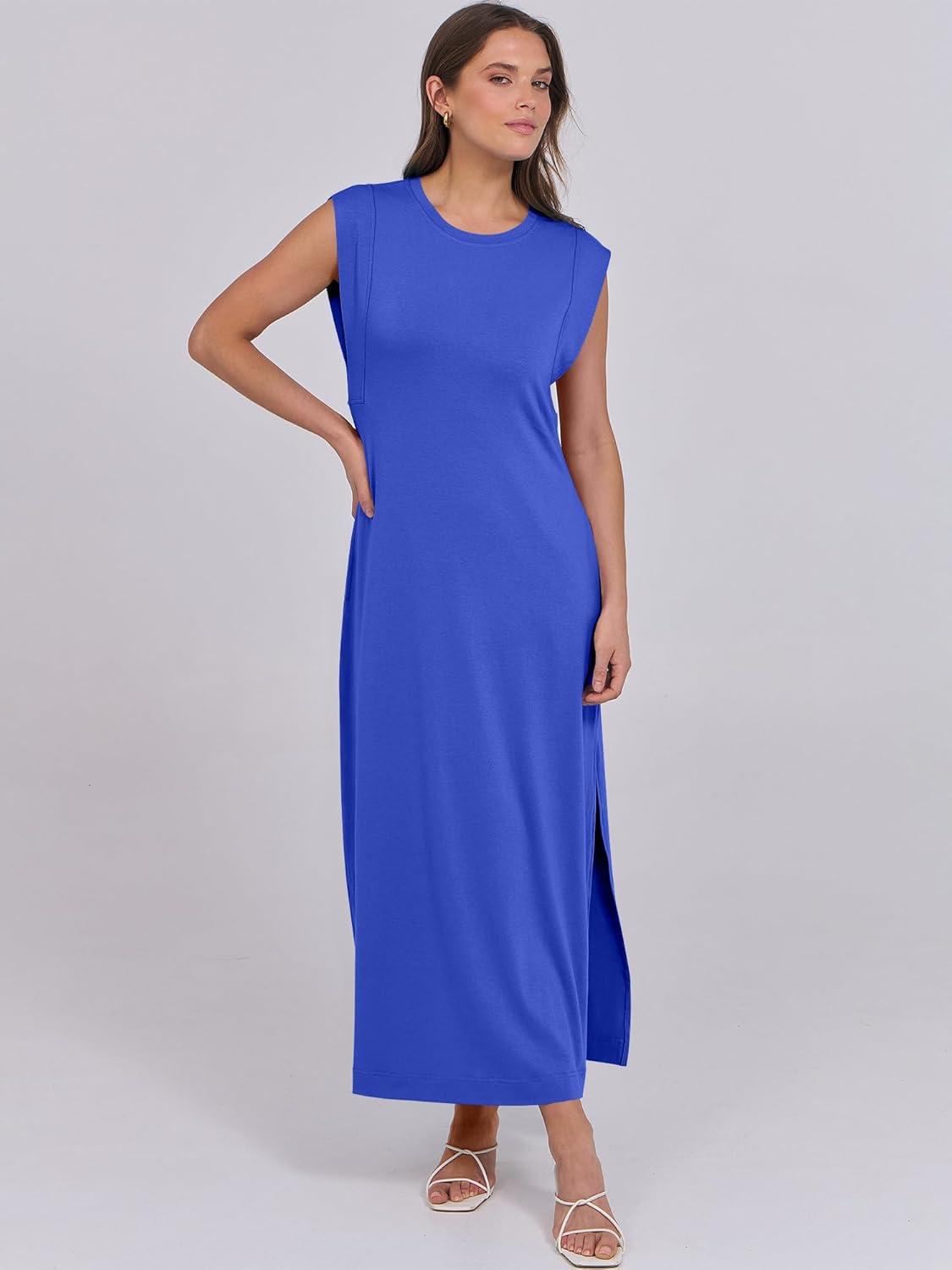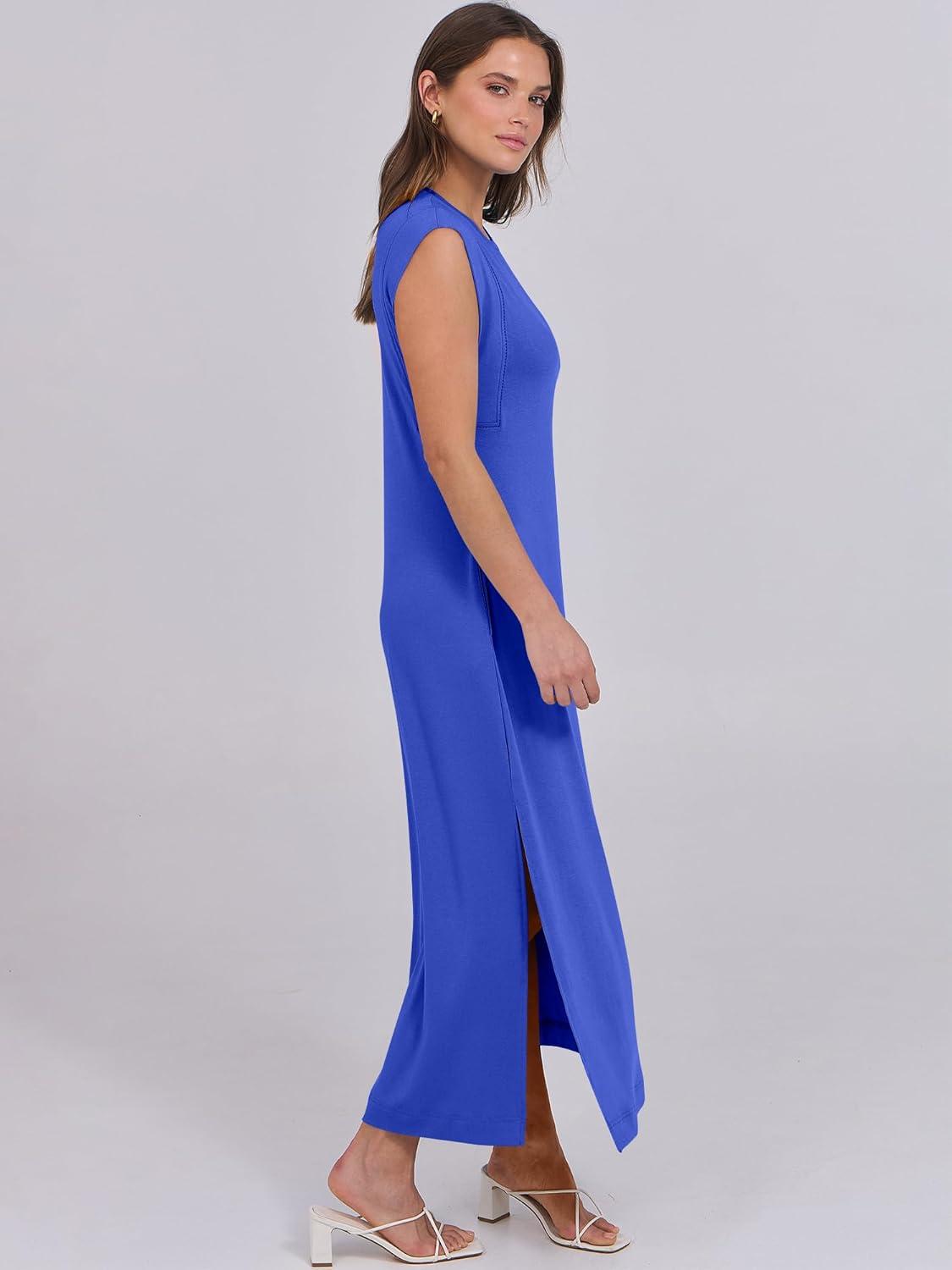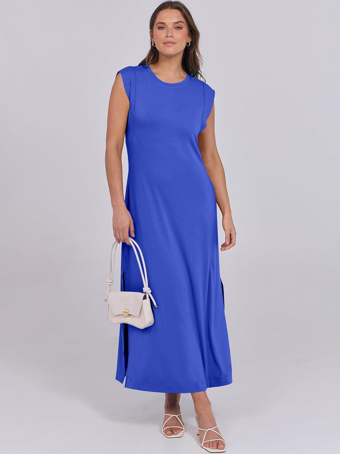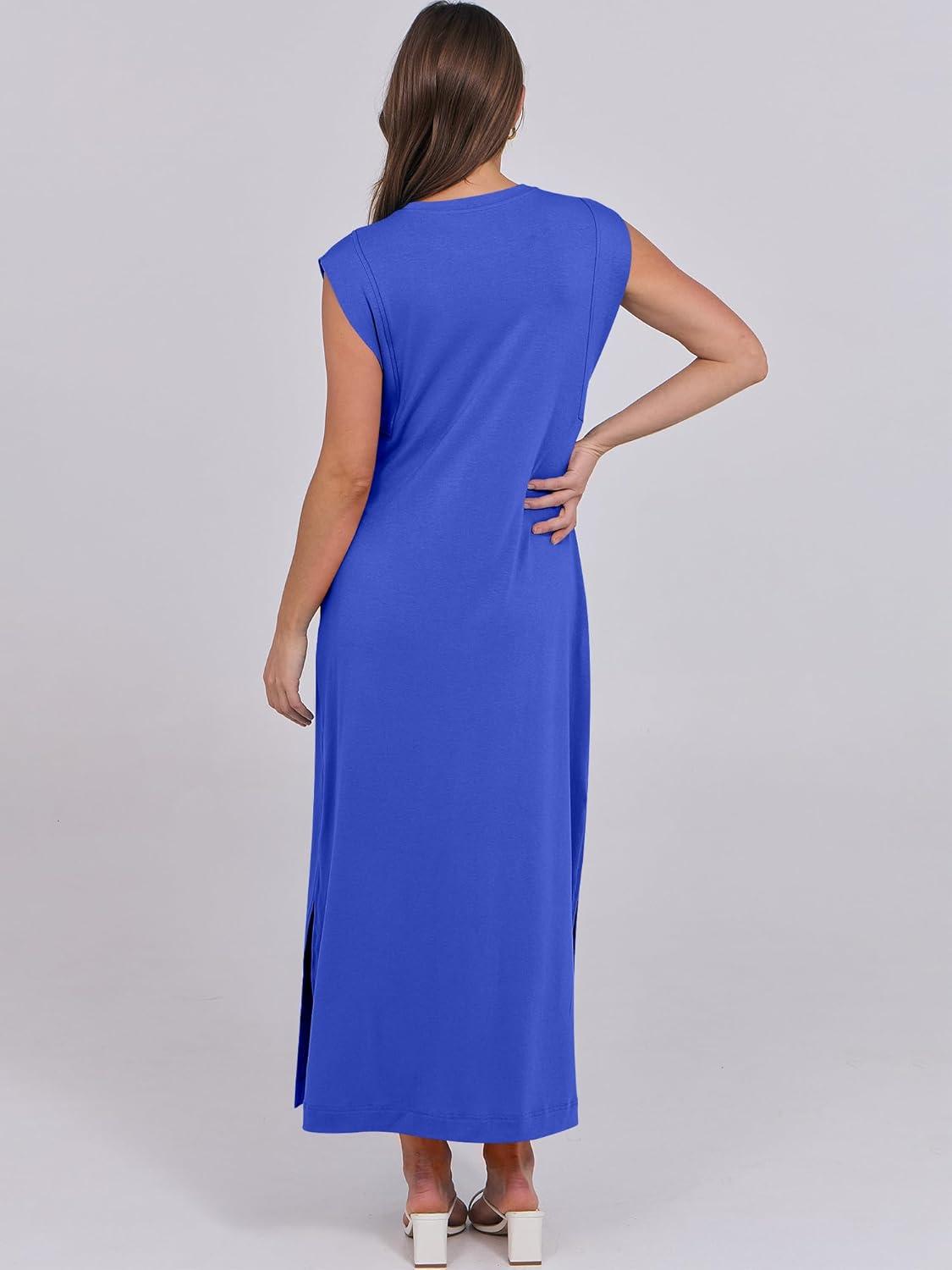 ANRABESS Summer Dress for Women 2025 Maxi Sundresses Casual Cap Sleeve Crew Neck Loose Split Beach Travel Vacation Outfits(Royal Blue)
