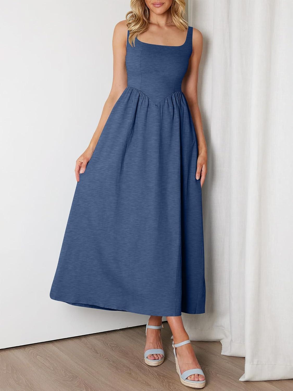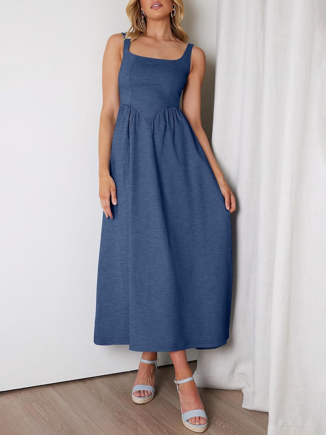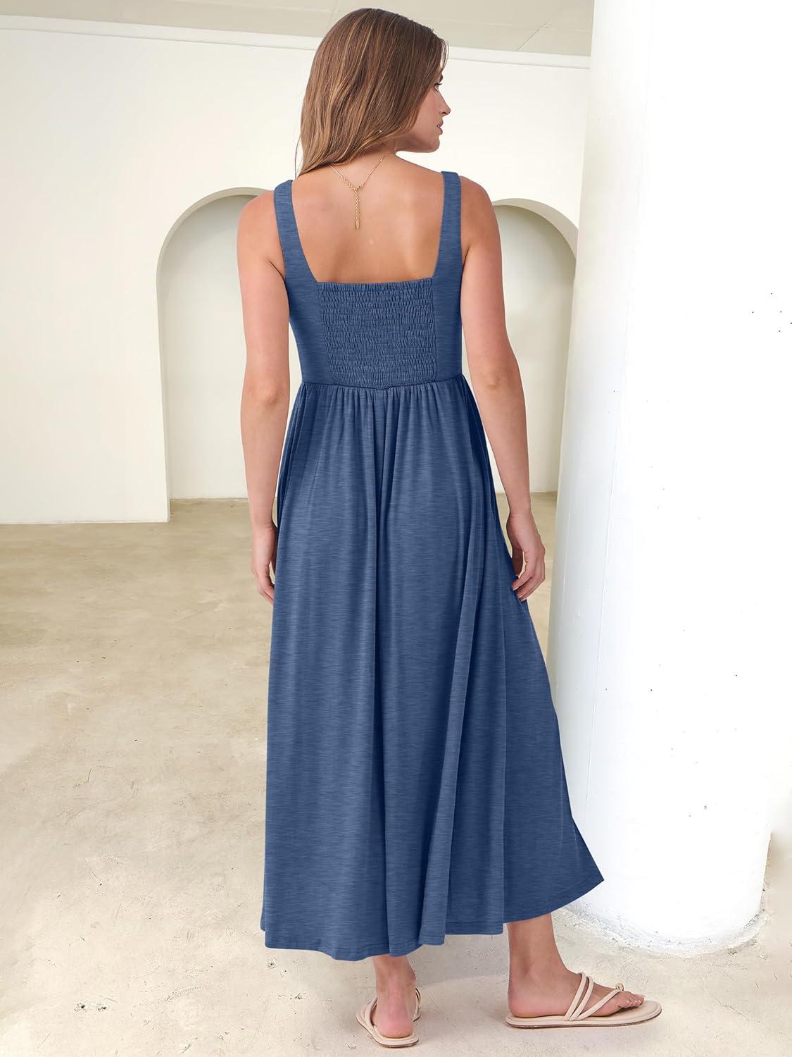 ANRABESS Sundresses for Women 2025 Summer Casual Sleeveless Square Neck Smocked Flowy Beach Vacation Midi Dress with Pockets(Blue)