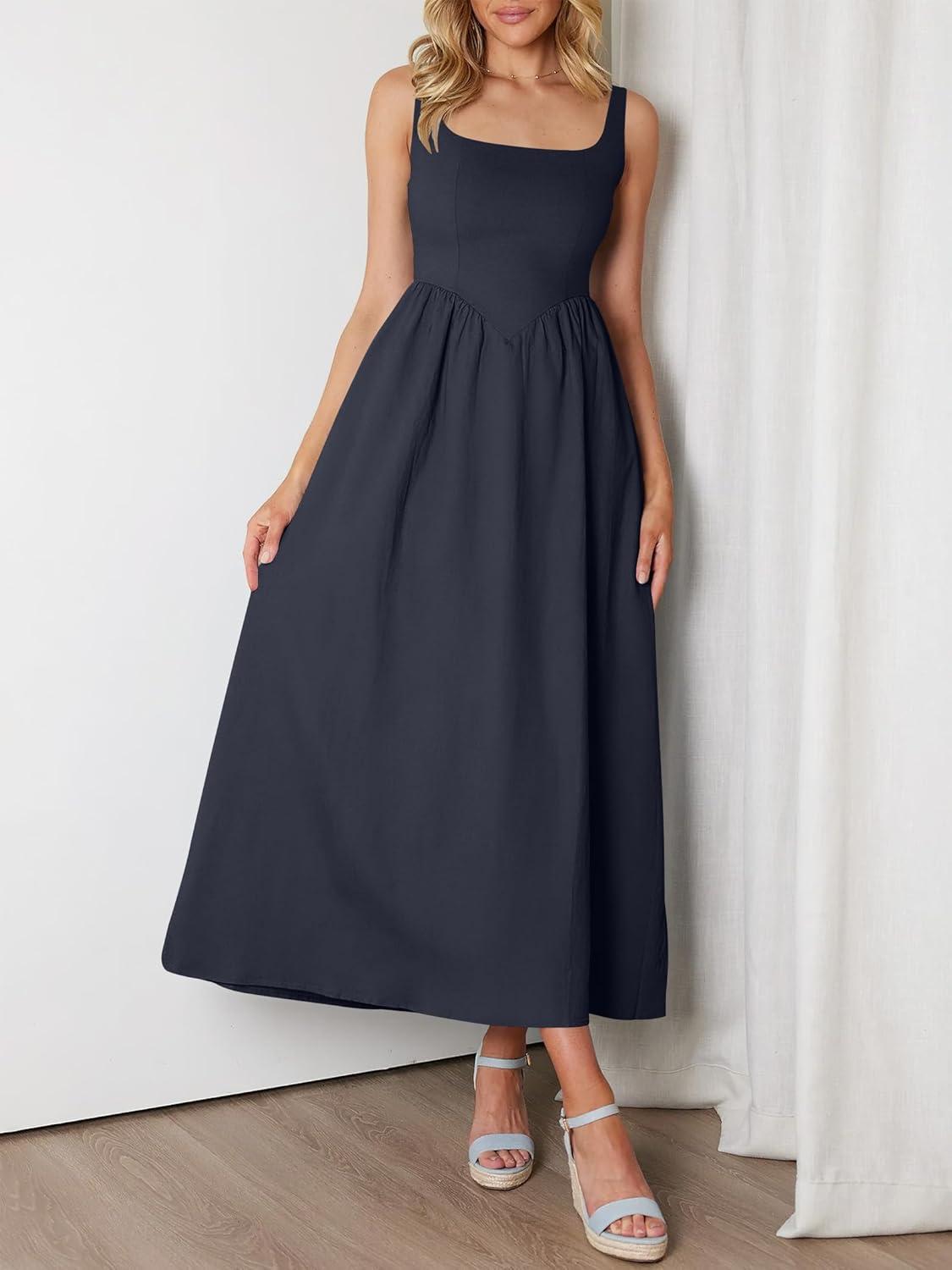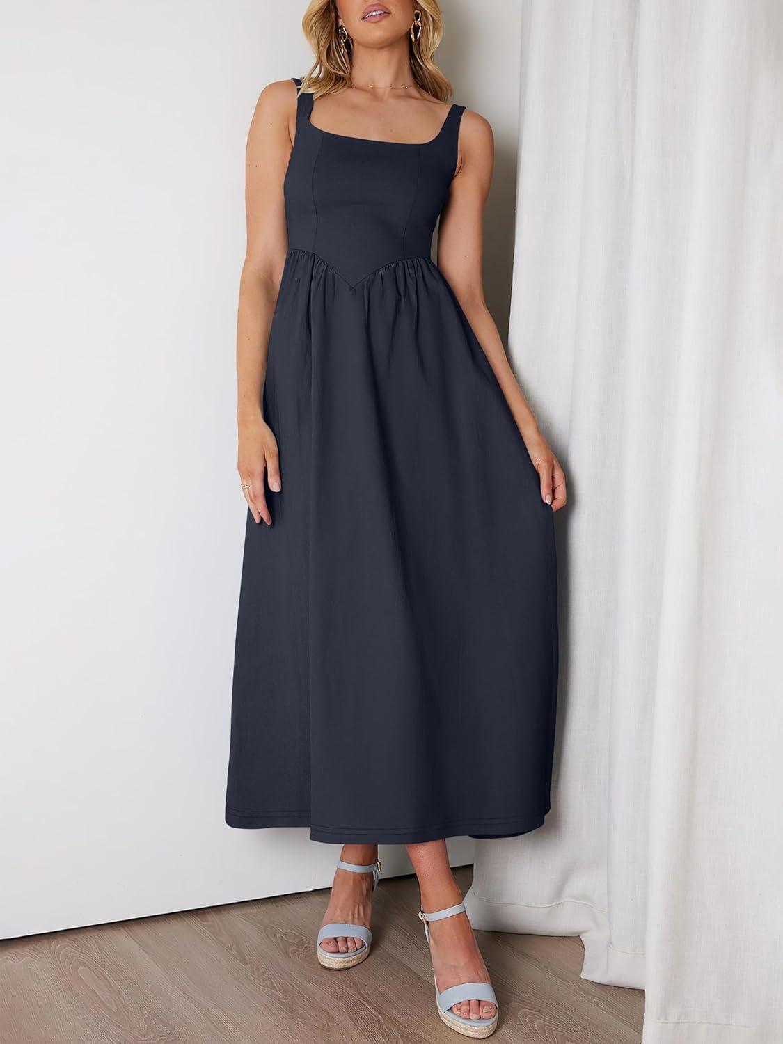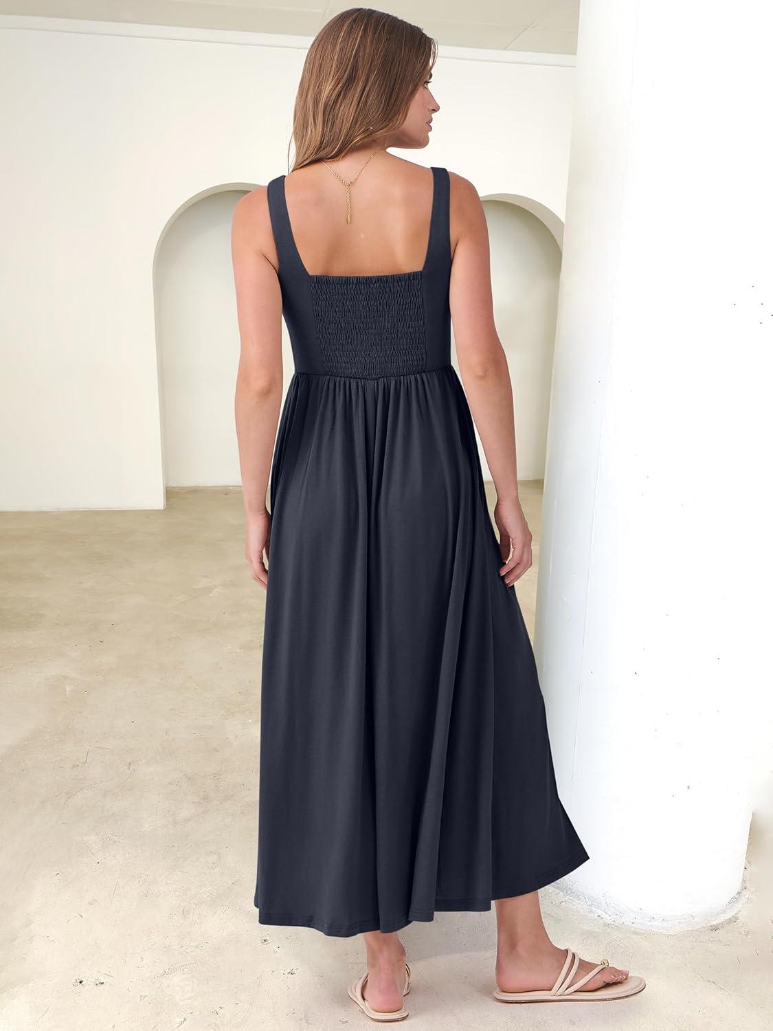 ANRABESS Sundresses for Women 2025 Summer Casual Sleeveless Square Neck Smocked Flowy Beach Vacation Midi Dress with Pockets(Navy Blue)