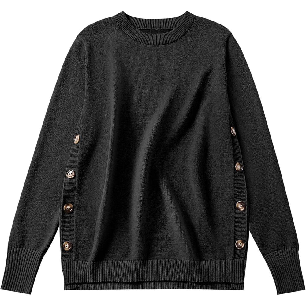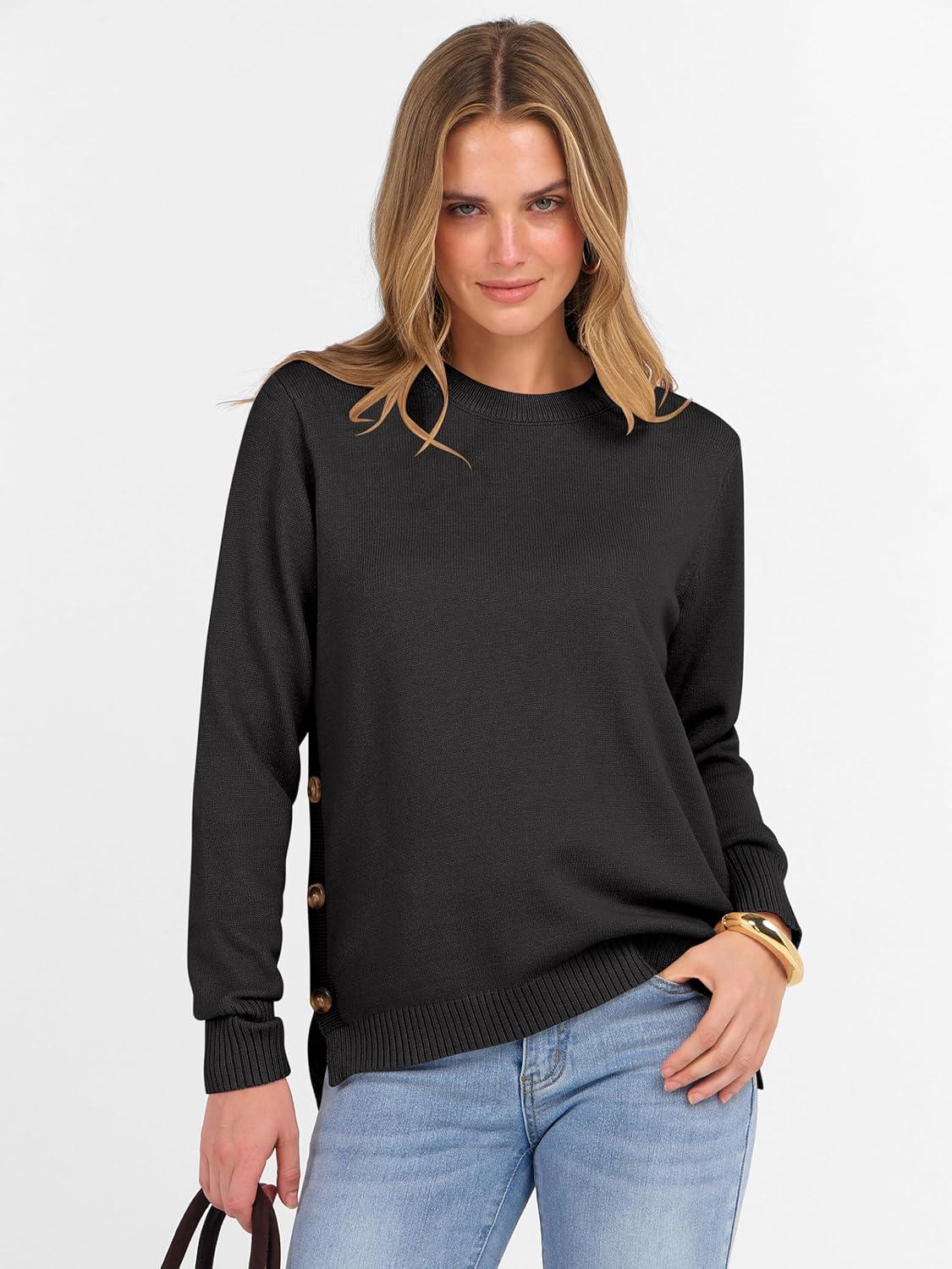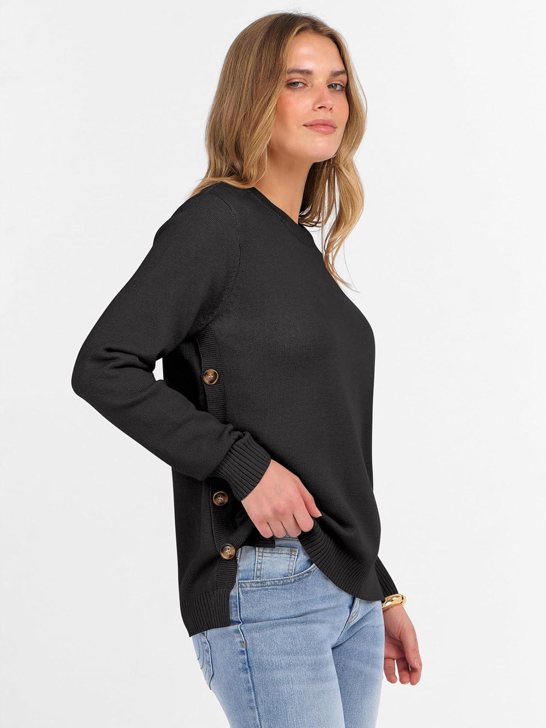 ANRABESS Sweaters for Women 2025 Fall Long Sleeve Crewneck Knit Casual Loose Side Button Basic Pullover Tops Trendy Outfits(Black)