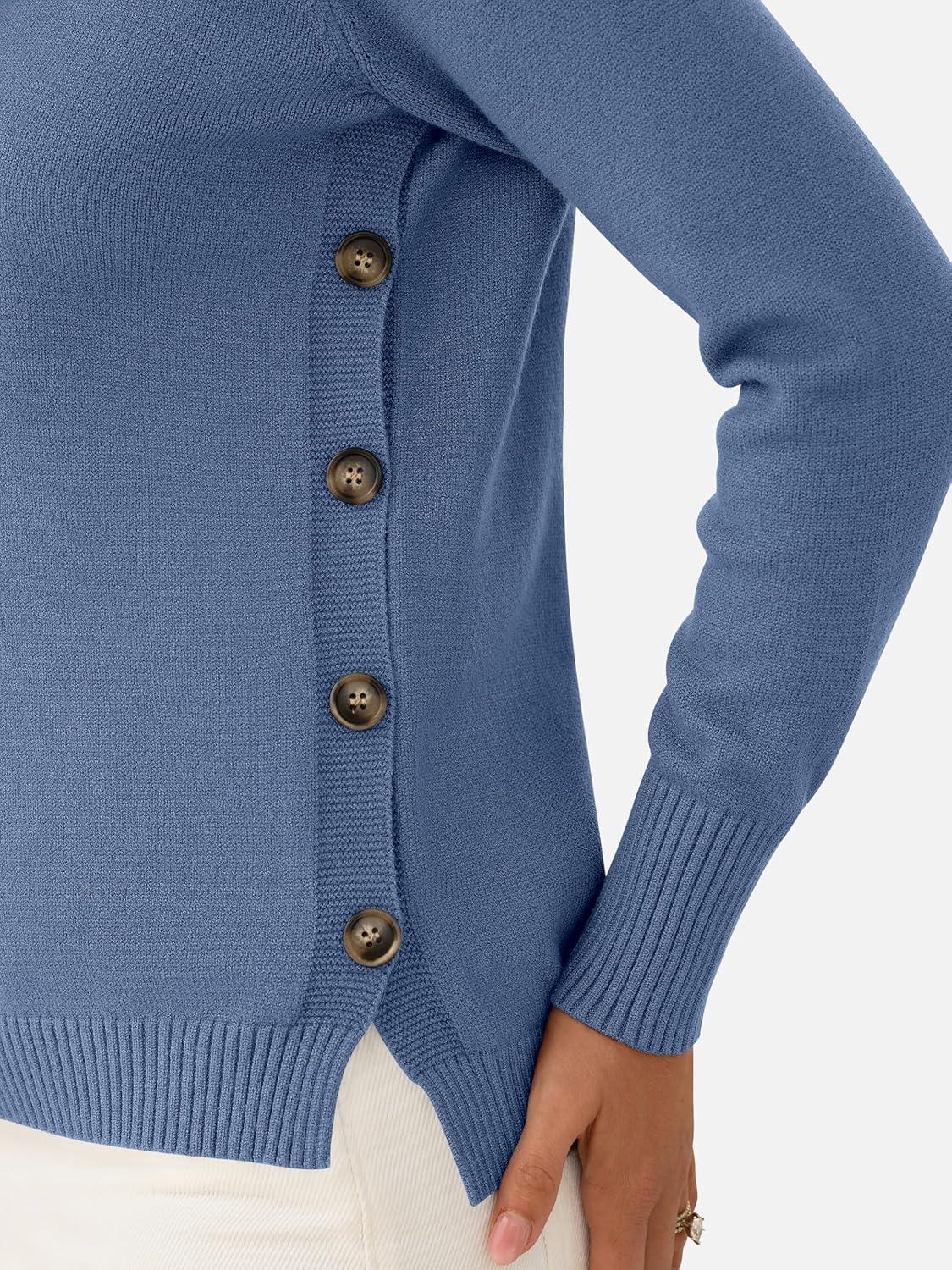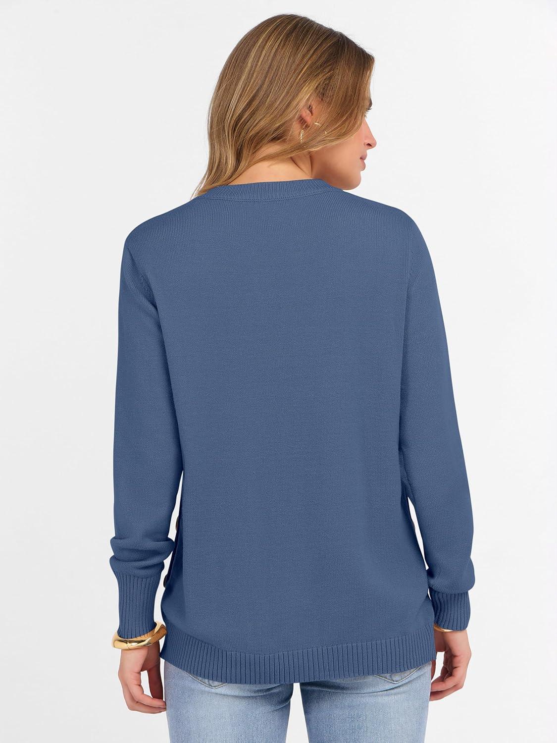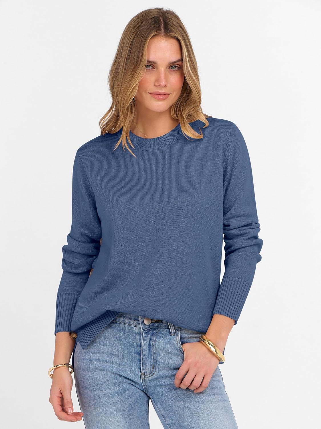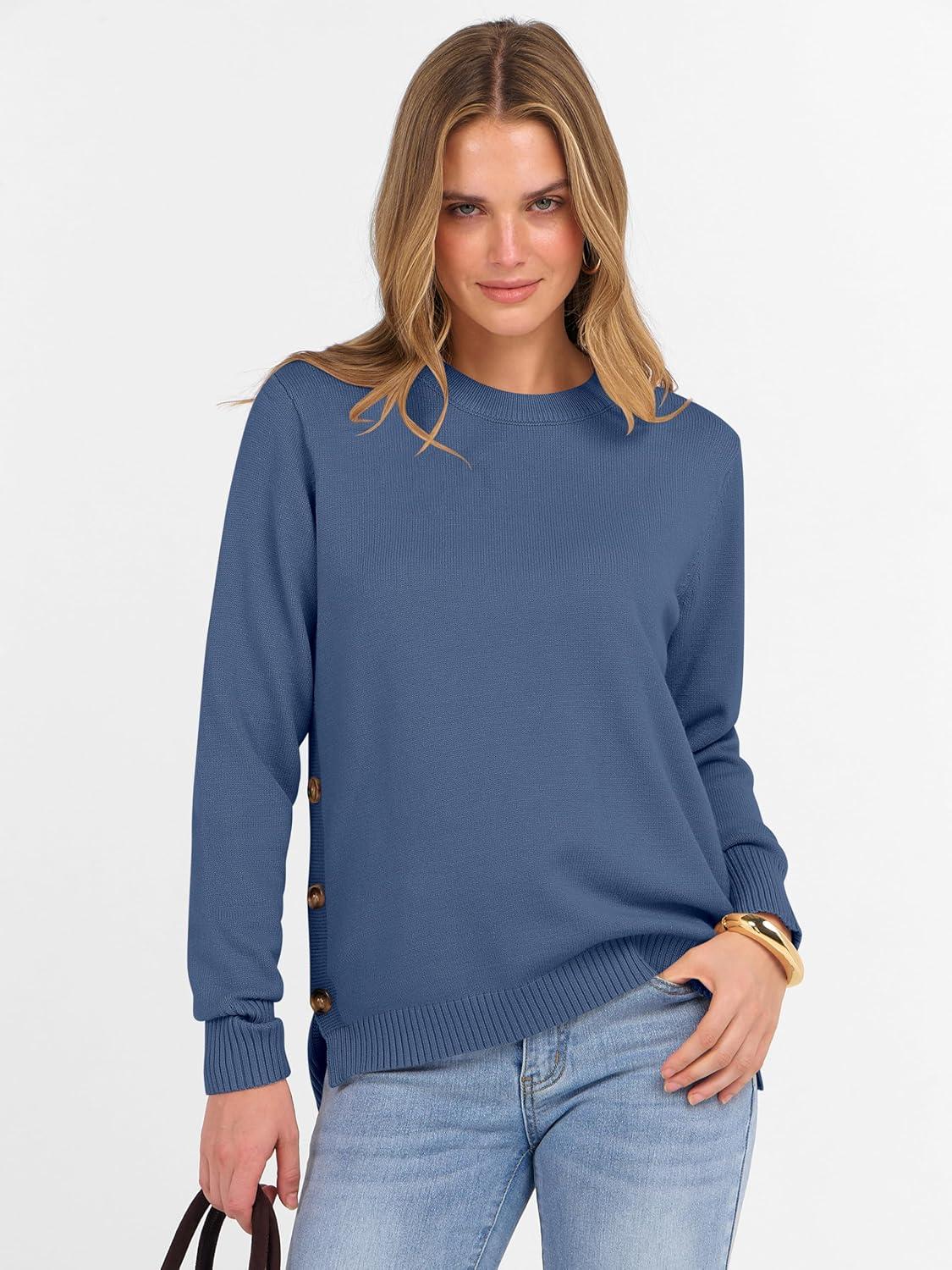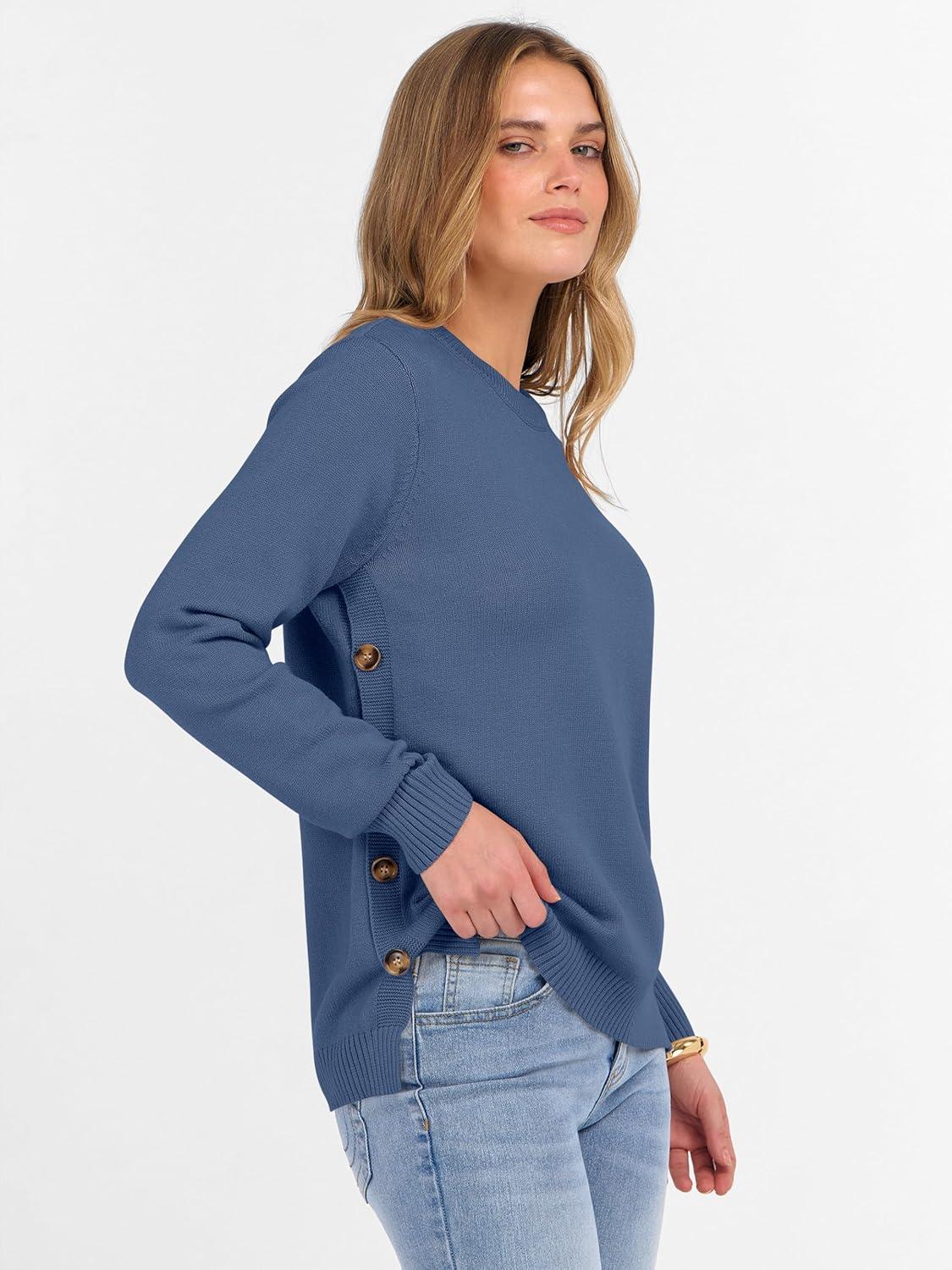 ANRABESS Sweaters for Women 2025 Fall Long Sleeve Crewneck Knit Casual Loose Side Button Basic Pullover Tops Trendy Outfits(Blue)