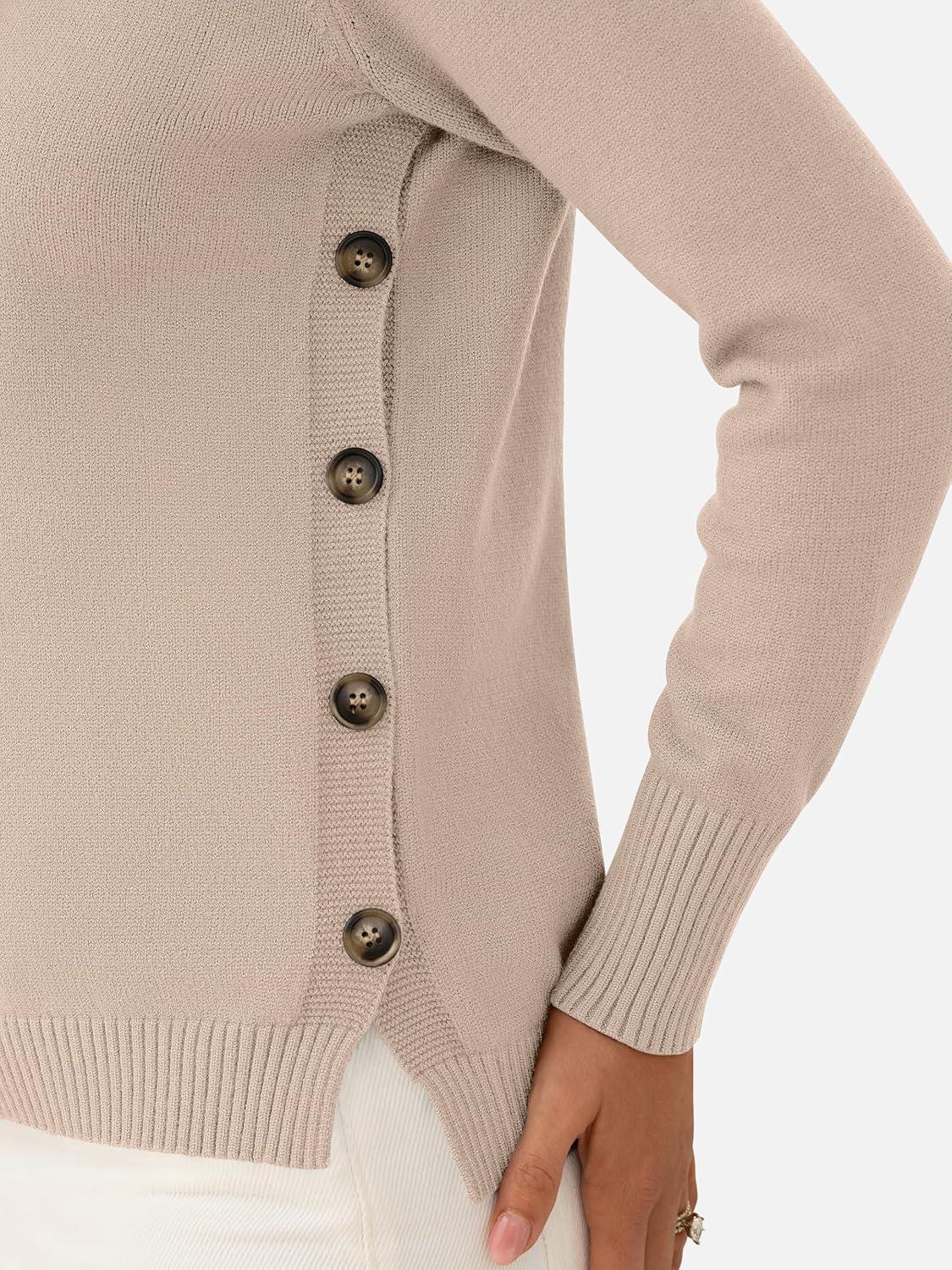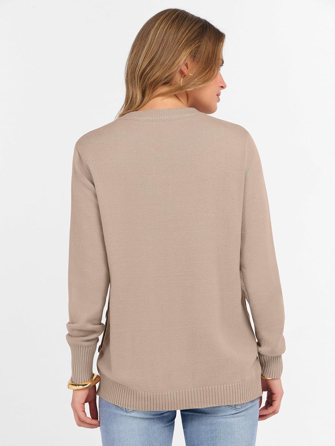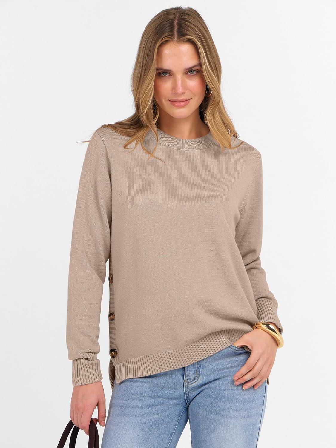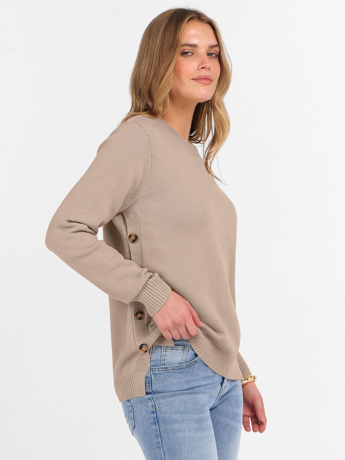 ANRABESS Sweaters for Women 2025 Fall Long Sleeve Crewneck Knit Casual Loose Side Button Basic Pullover Tops Trendy Outfits(Khaki)