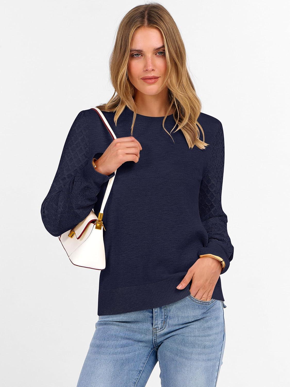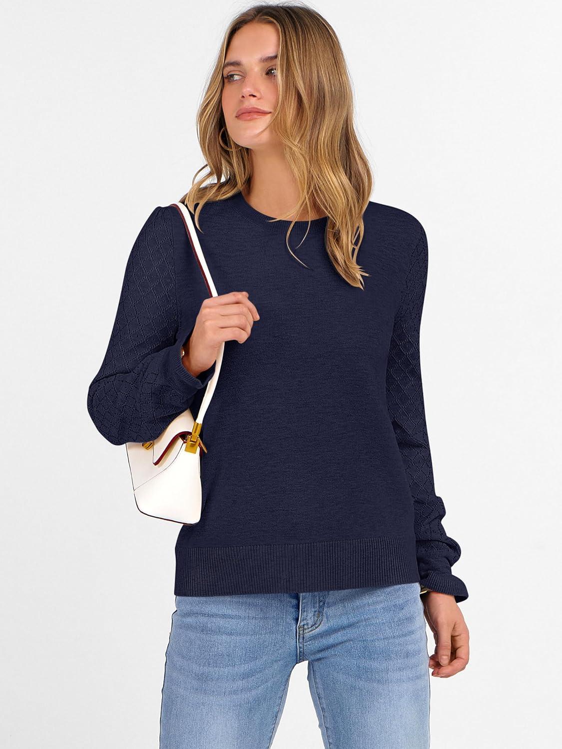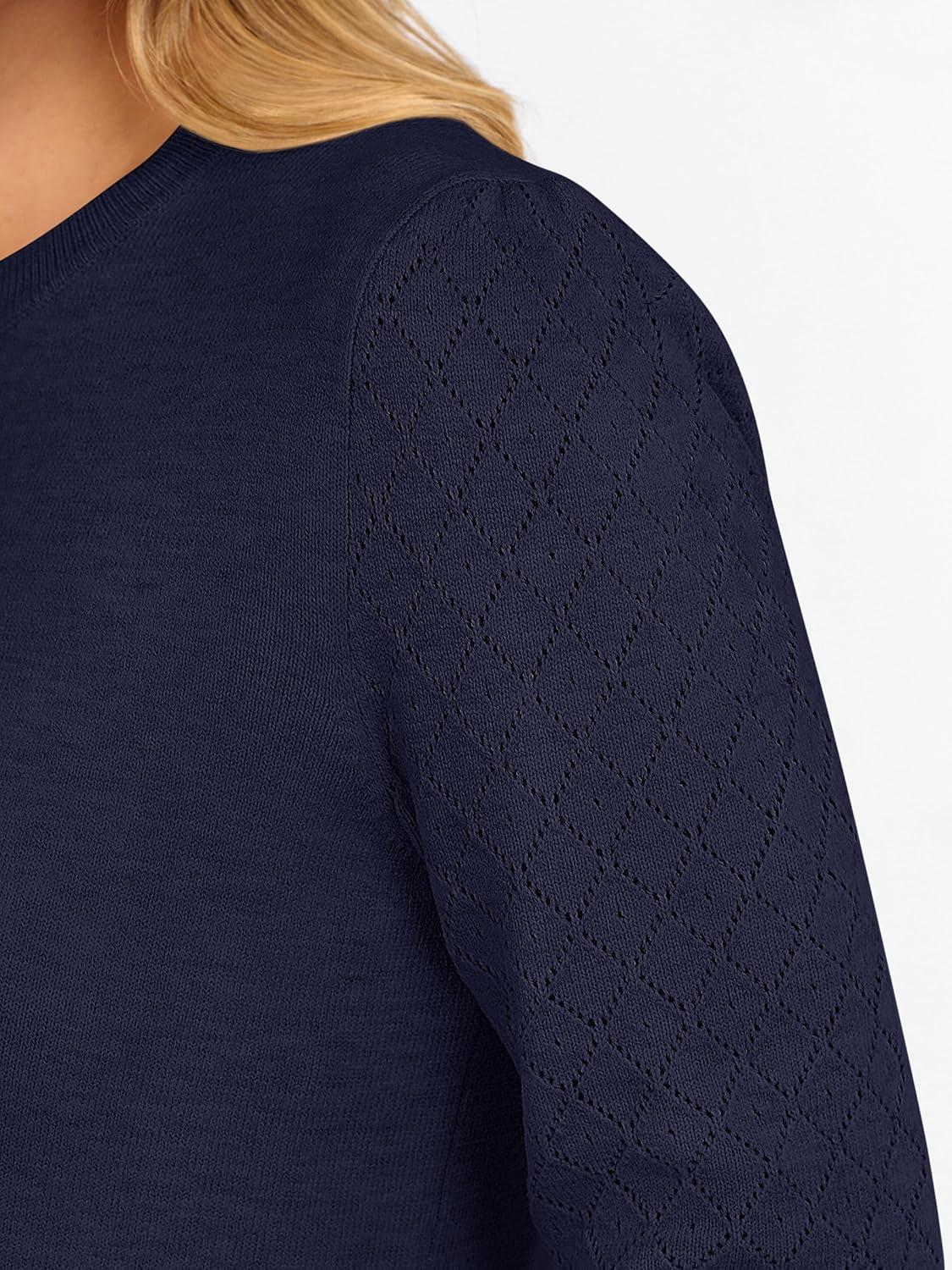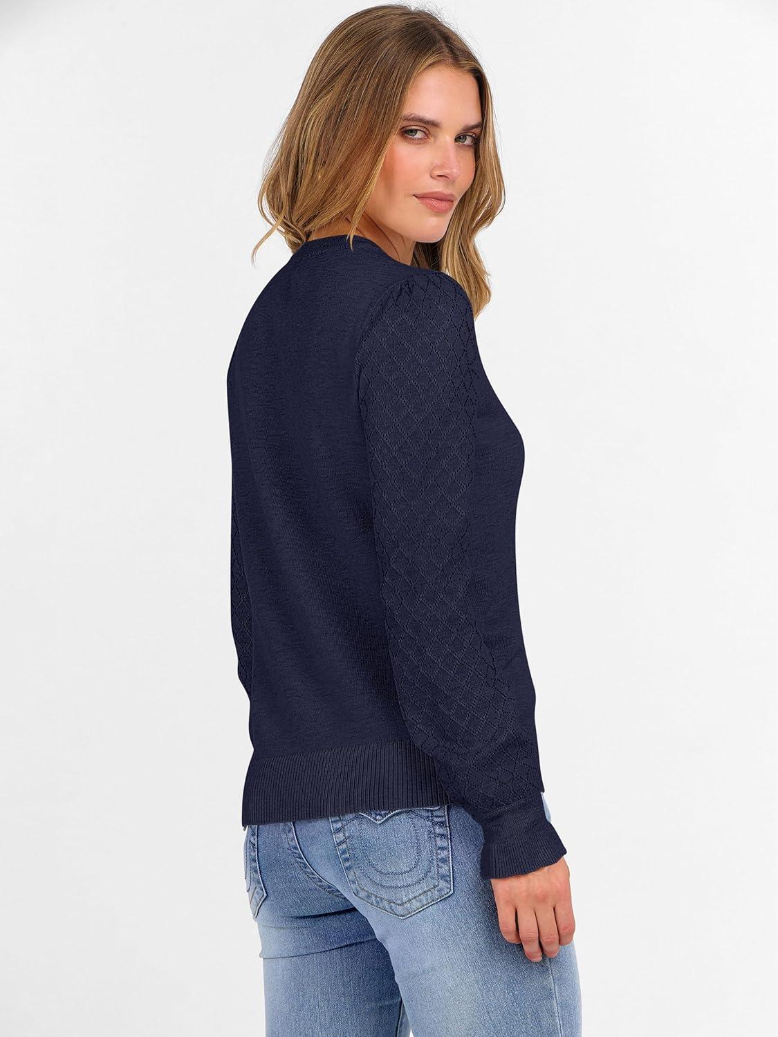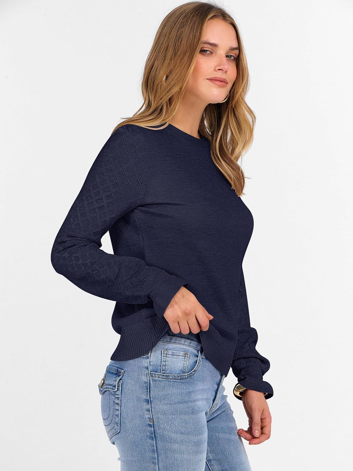 ANRABESS Sweaters for Women Lace Long Sleeve Tops 2025 Fall Dressy Casual Business Knitted Pullover Shirts Puff Cuffs Outfits(Navy Blue)