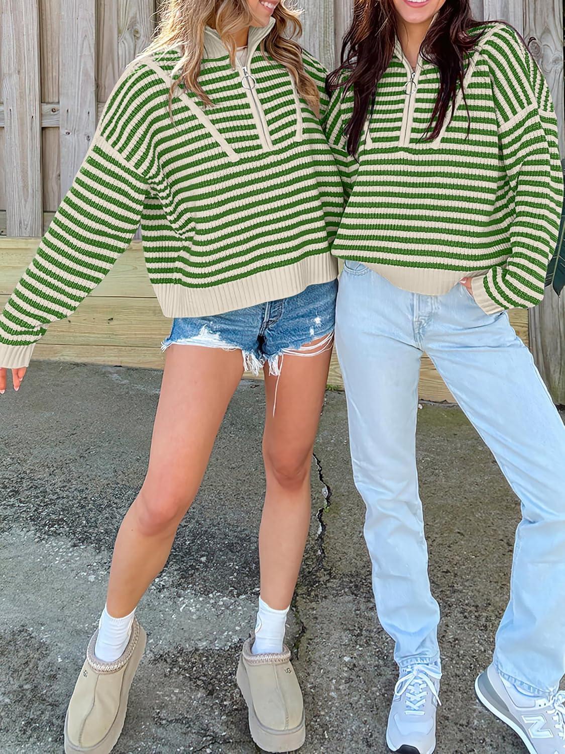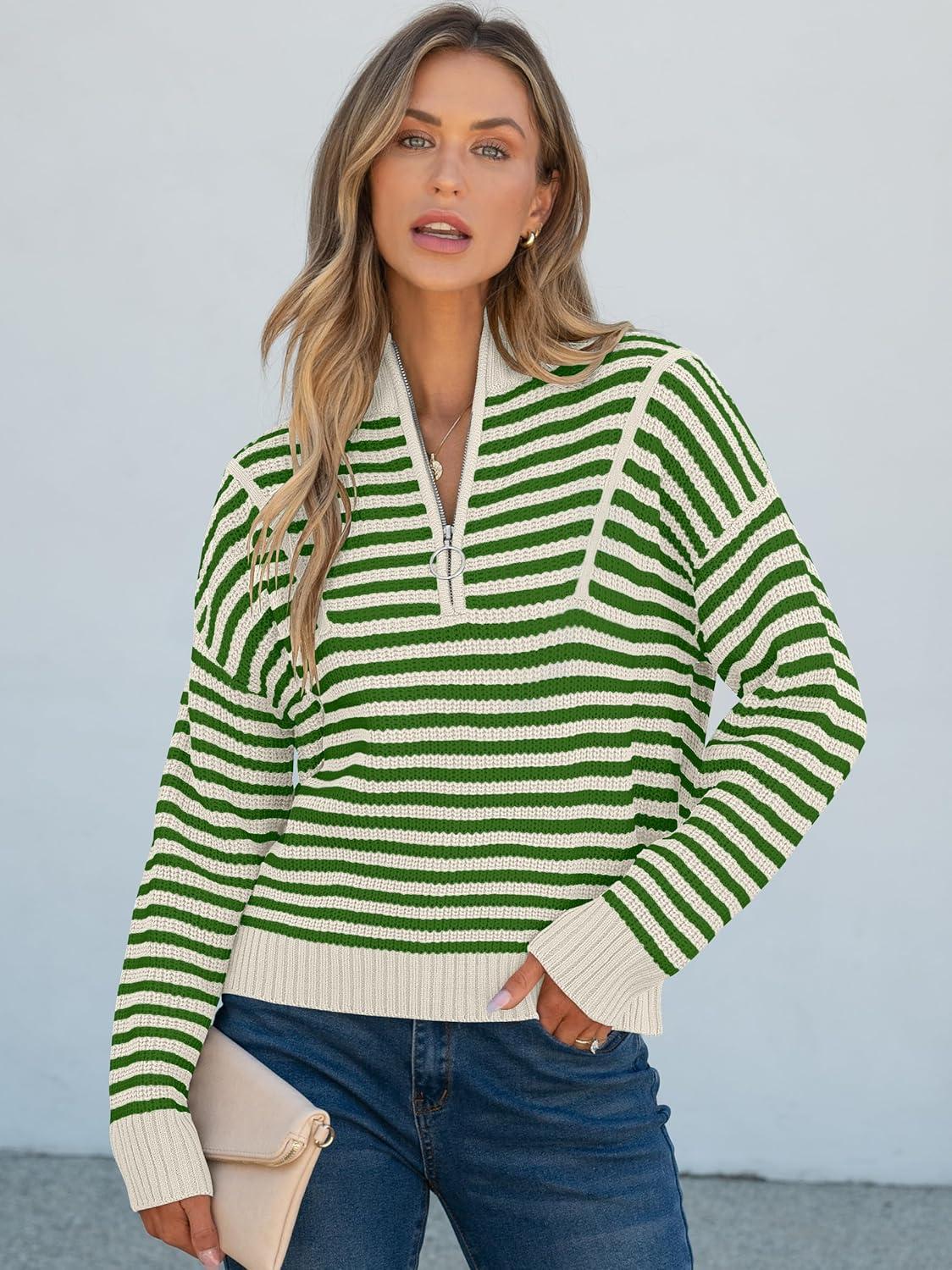 ANRABESS Sweaters for Women Striped Half Zip Long Sleeve Ribbed Knit Pullover Comfy Casual Lightweight Tops 2025 Fall Fashion(Striped Apricot Green)