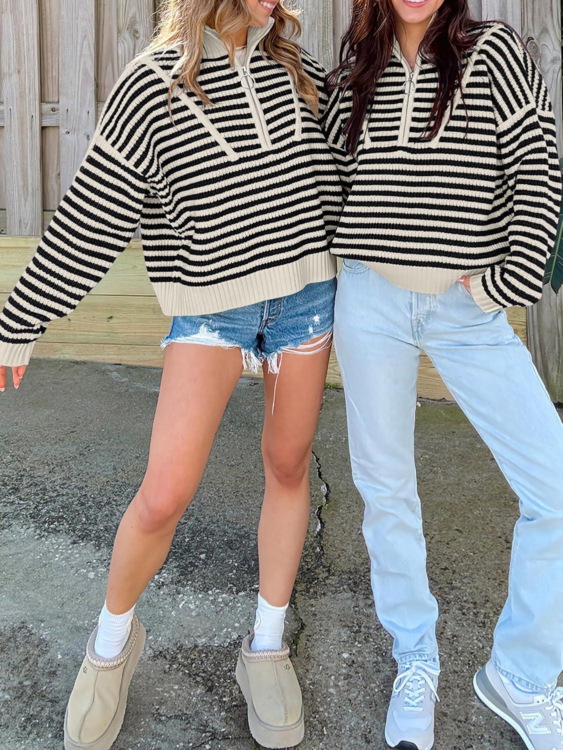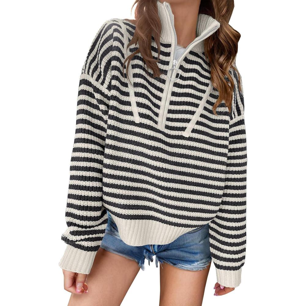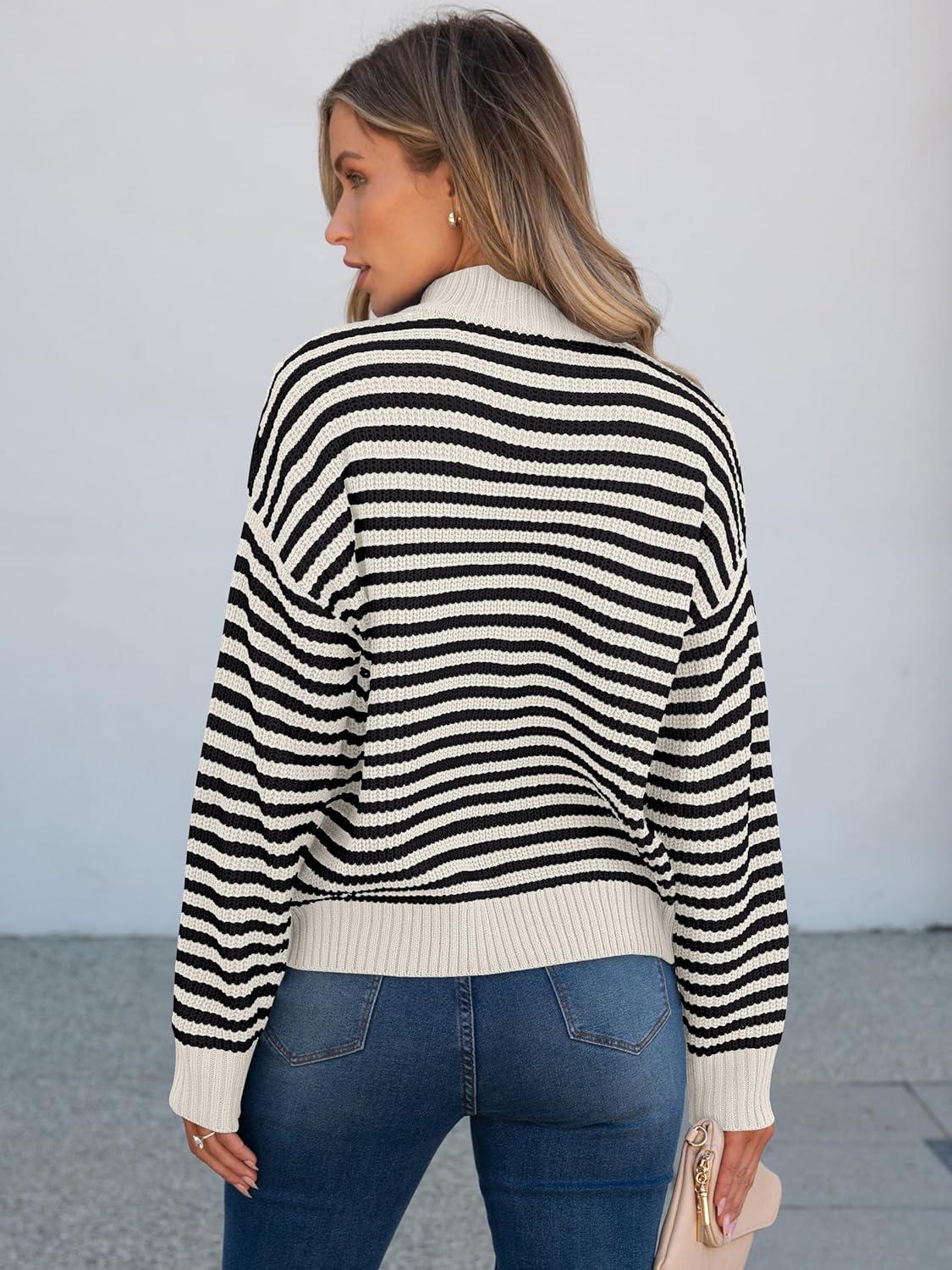 ANRABESS Sweaters for Women Striped Half Zip Long Sleeve Ribbed Knit Pullover Comfy Casual Lightweight Tops 2025 Fall Fashion(Striped Black Beige)