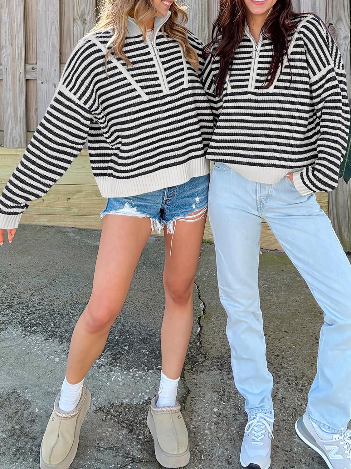 ANRABESS Sweaters for Women Striped Half Zip Long Sleeve Ribbed Knit Pullover Comfy Casual Lightweight Tops 2025 Fall Fashion(Striped Black White)