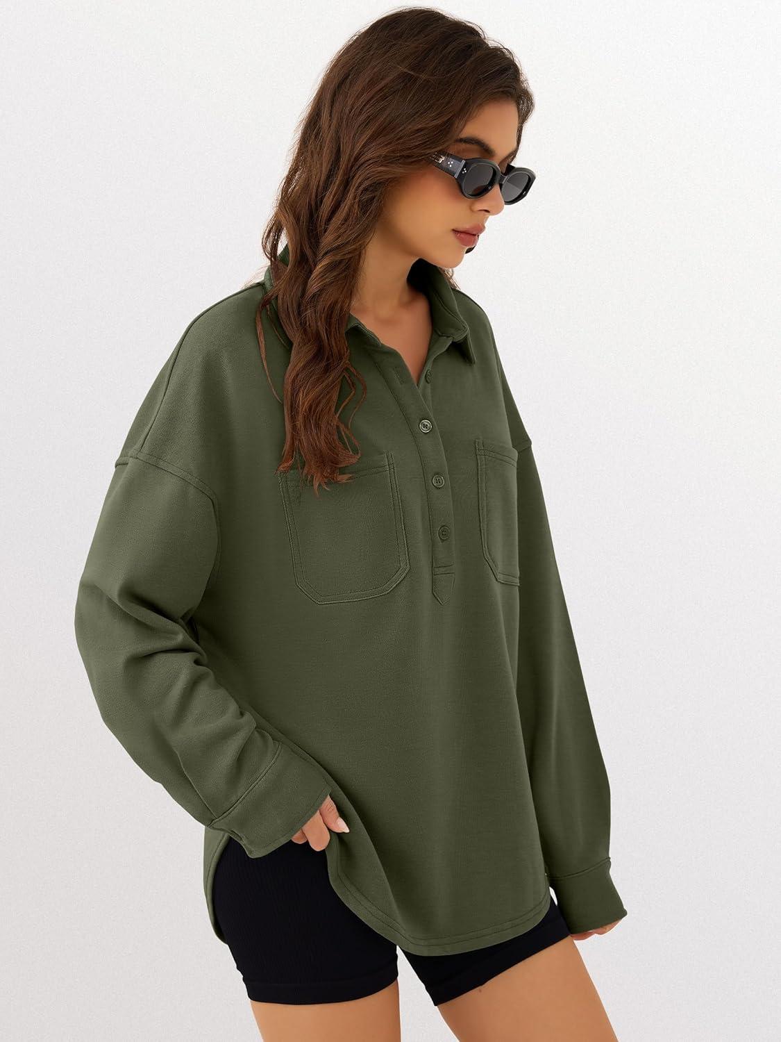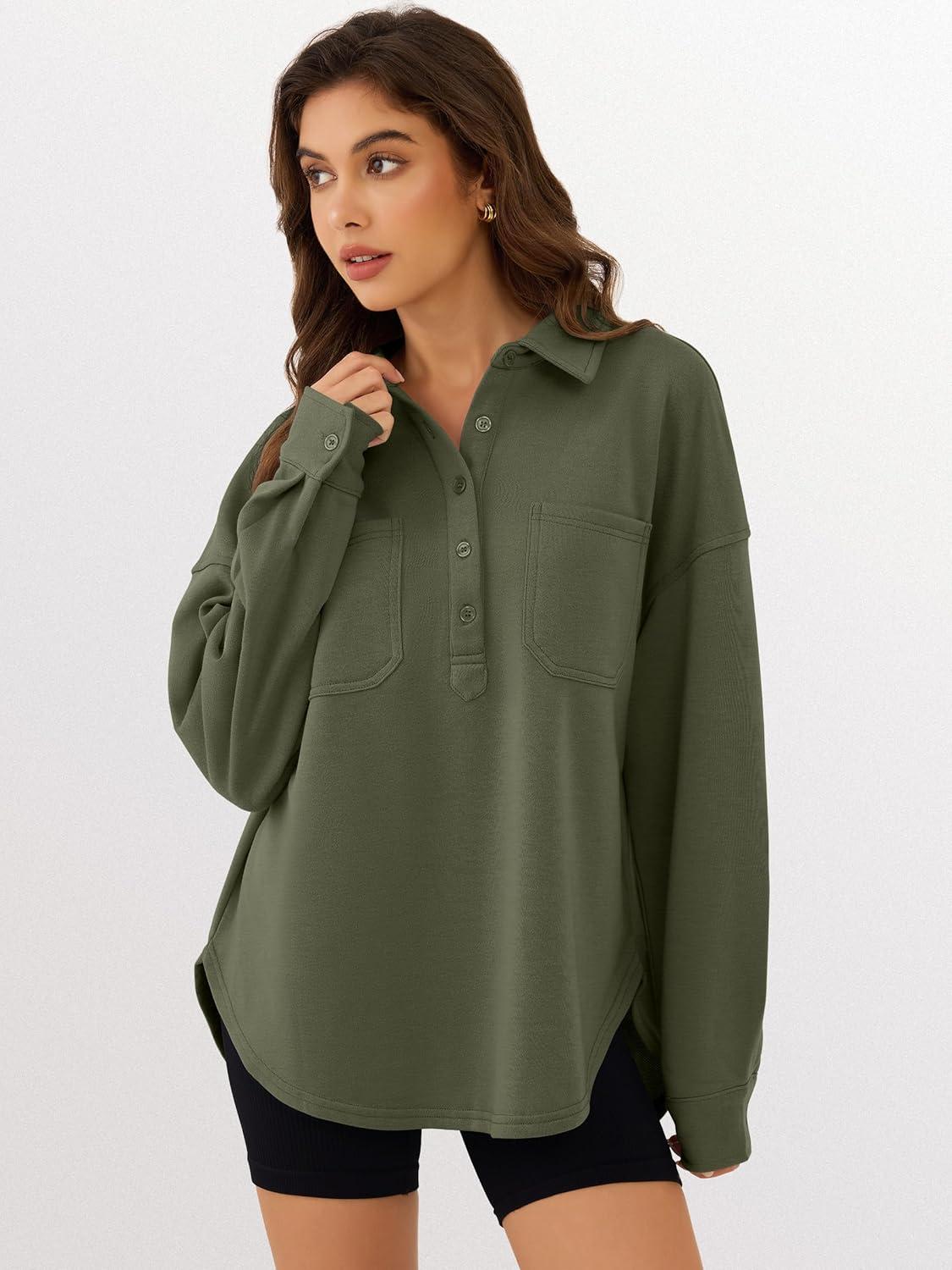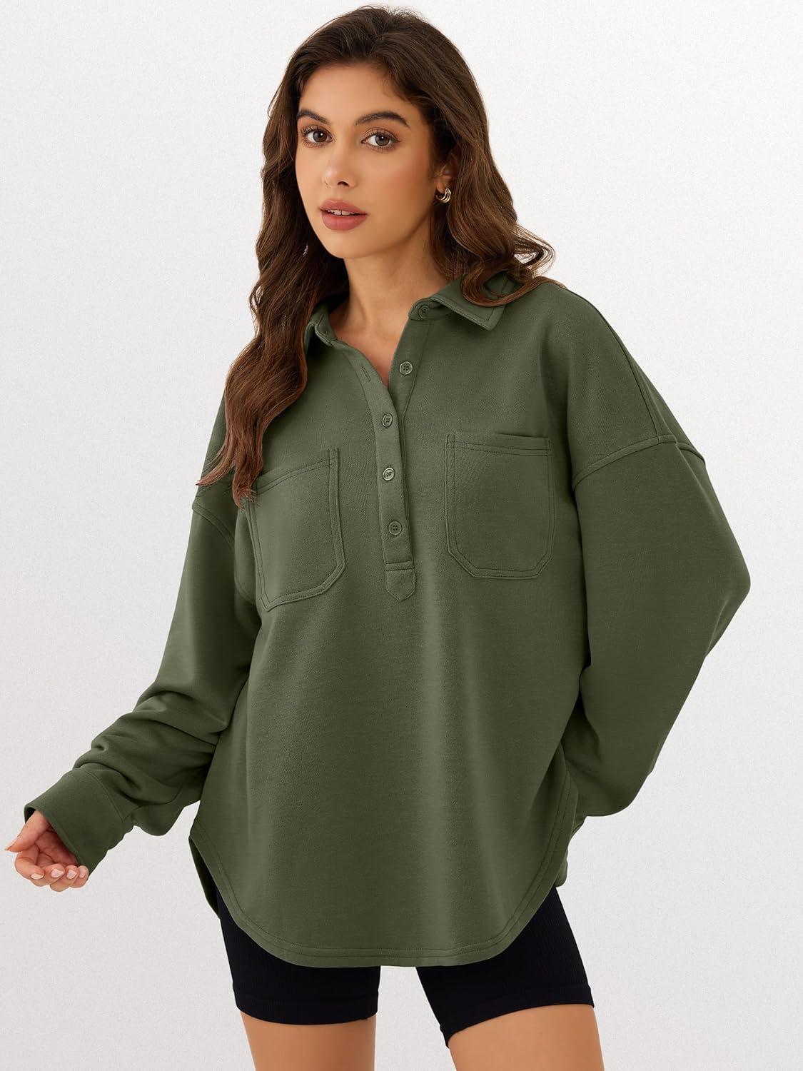 ANRABESS Sweatshirt for Women Oversized Casual Long Sleeve Side Slit Button Lapel Polo Pullover Tunic Tops 2025 Fall Outfits(Army Green)