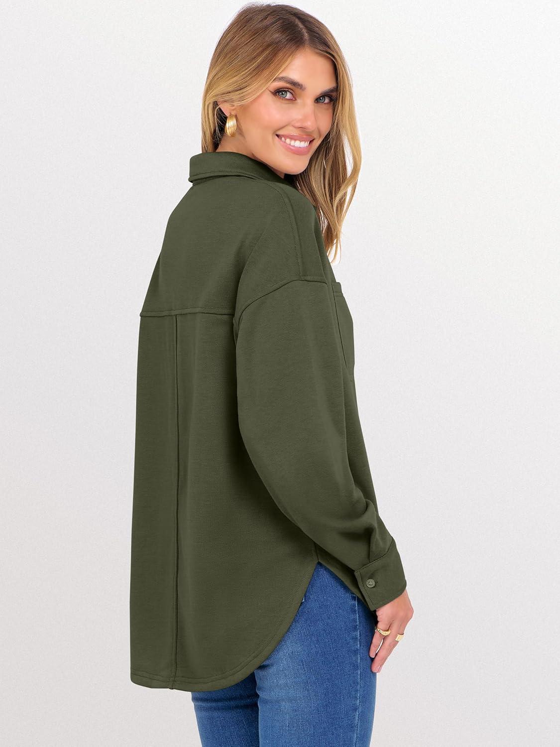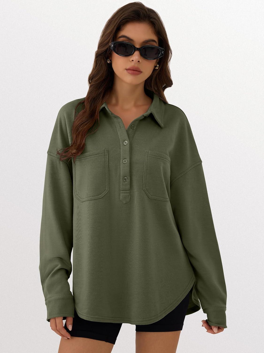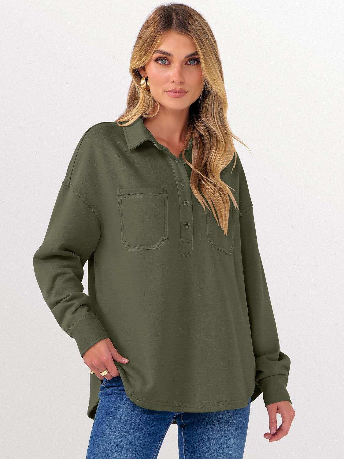 ANRABESS Sweatshirt for Women Oversized Casual Long Sleeve Side Slit Button Lapel Polo Pullover Tunic Tops 2025 Fall Outfits(Army Green)