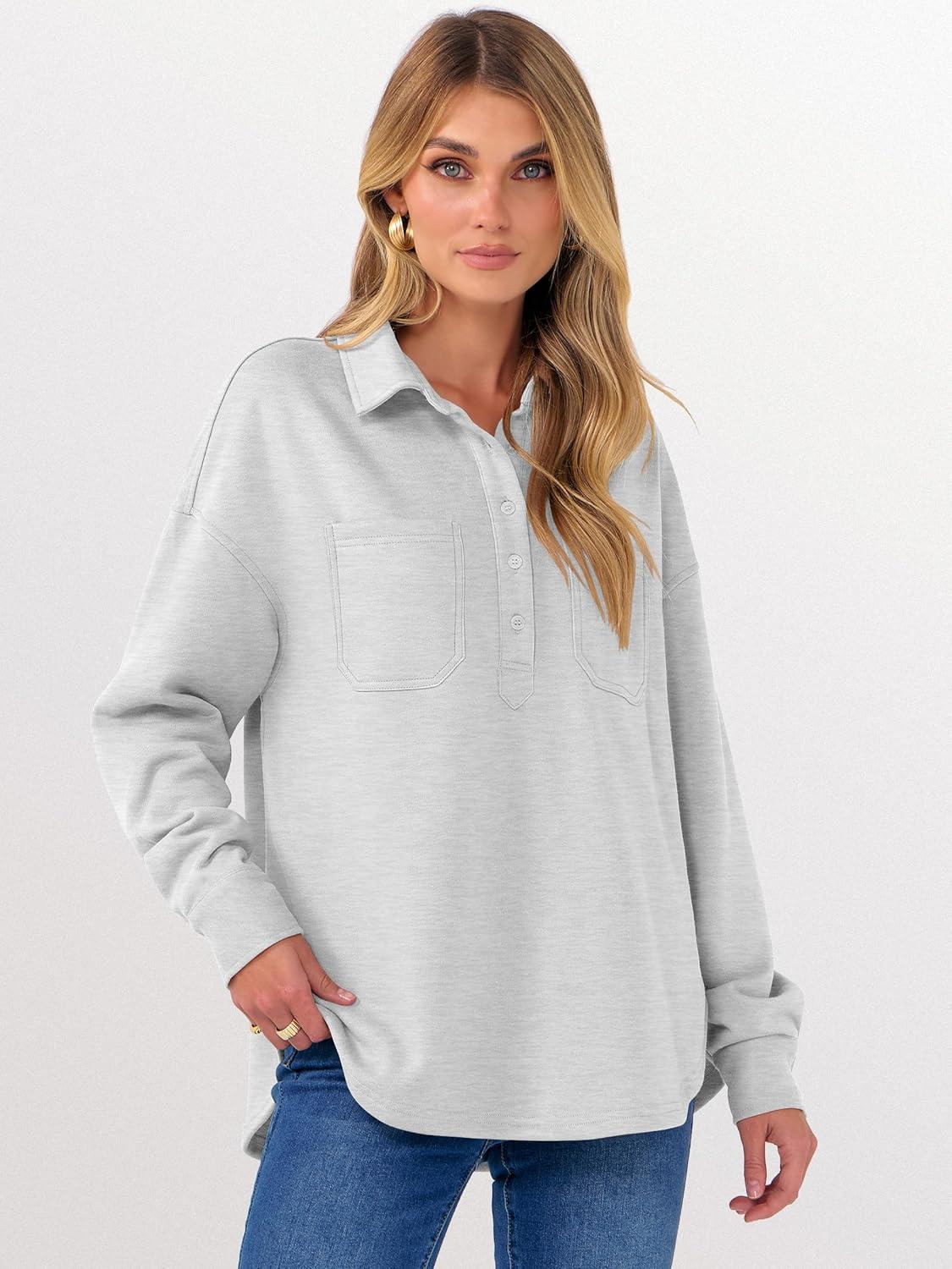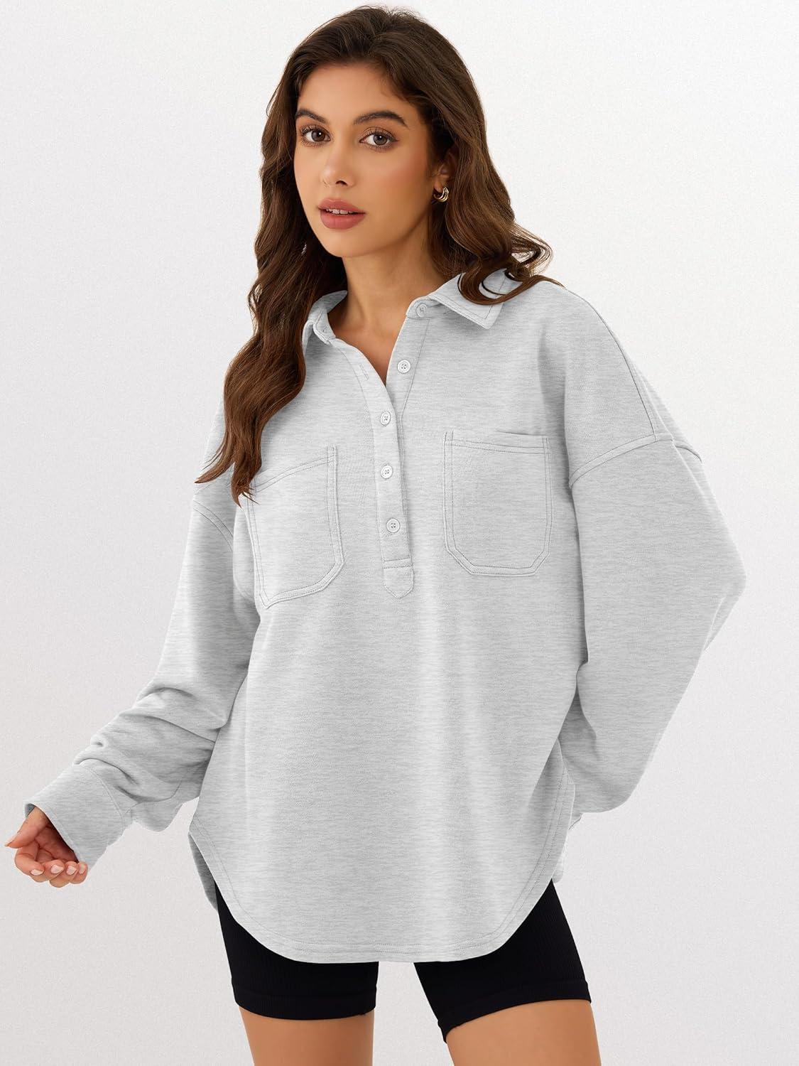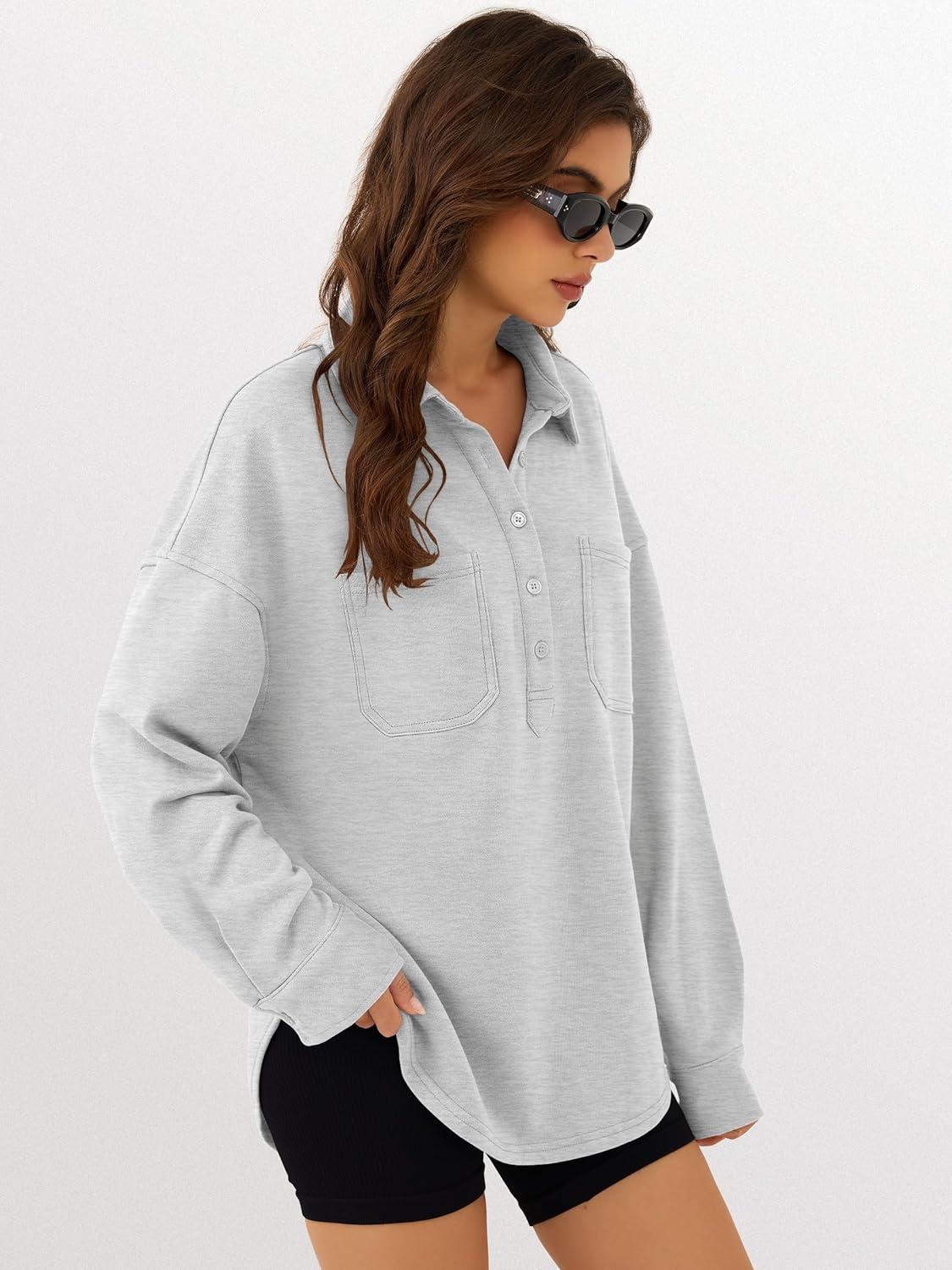 ANRABESS Sweatshirt for Women Oversized Casual Long Sleeve Side Slit Button Lapel Polo Pullover Tunic Tops 2025 Fall Outfits(Light Grey)