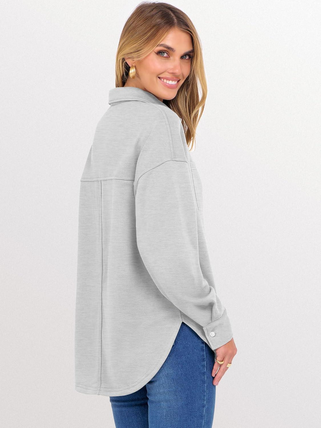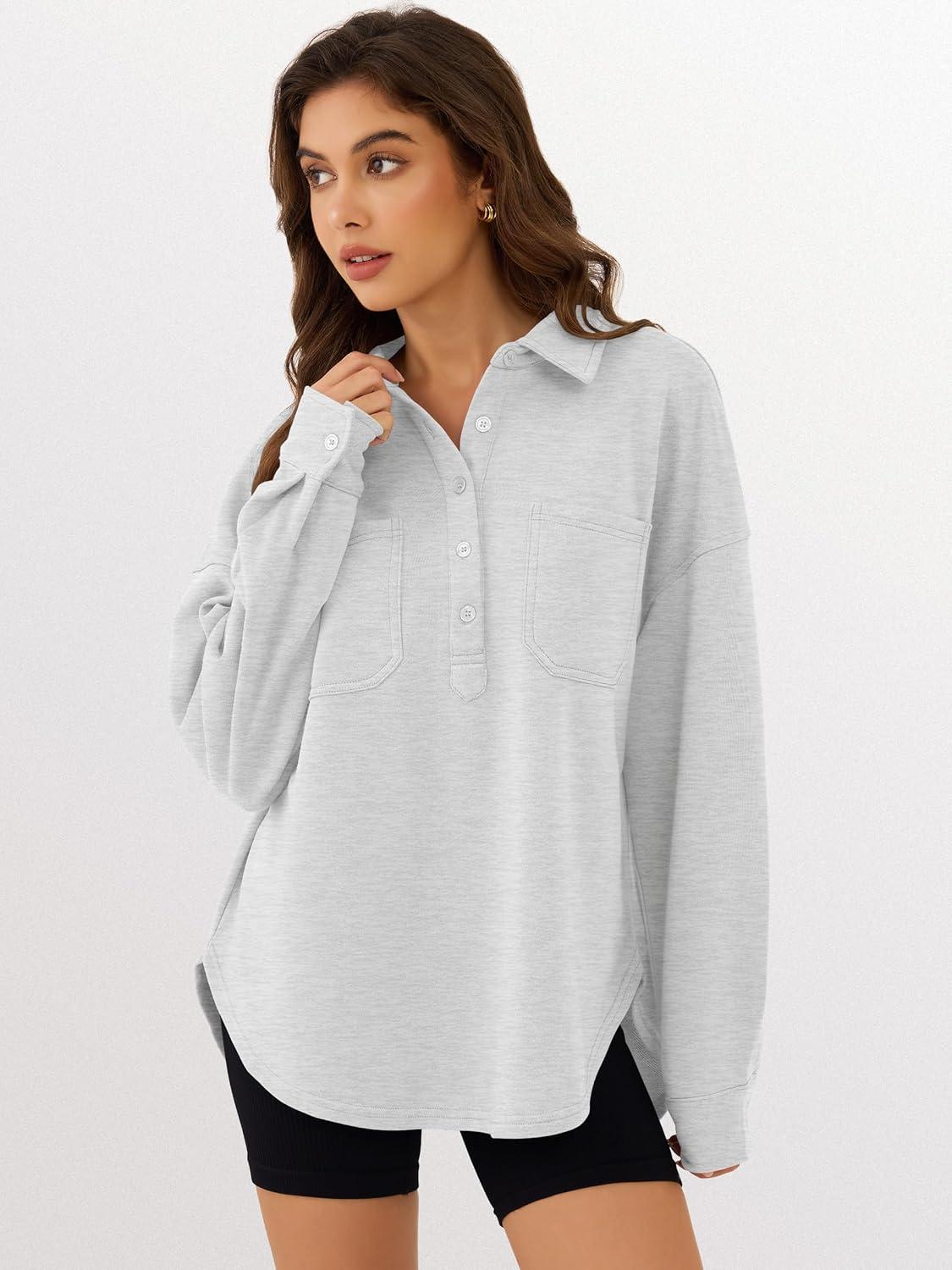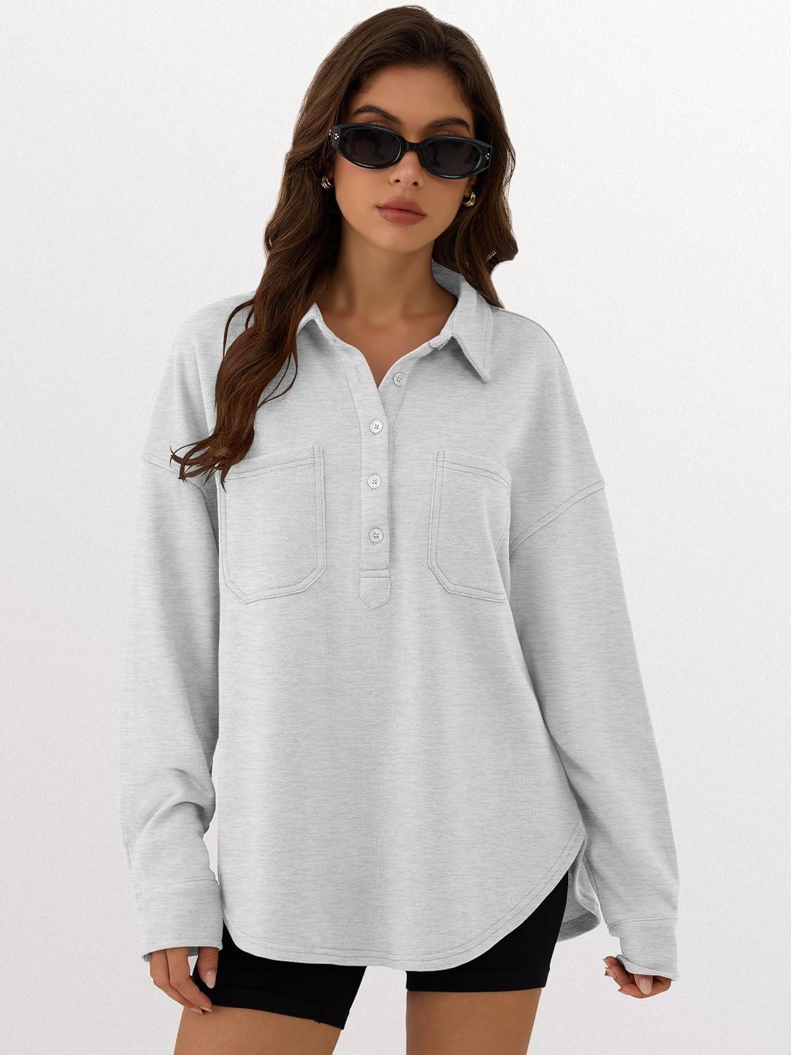 ANRABESS Sweatshirt for Women Oversized Casual Long Sleeve Side Slit Button Lapel Polo Pullover Tunic Tops 2025 Fall Outfits(Light Grey)
